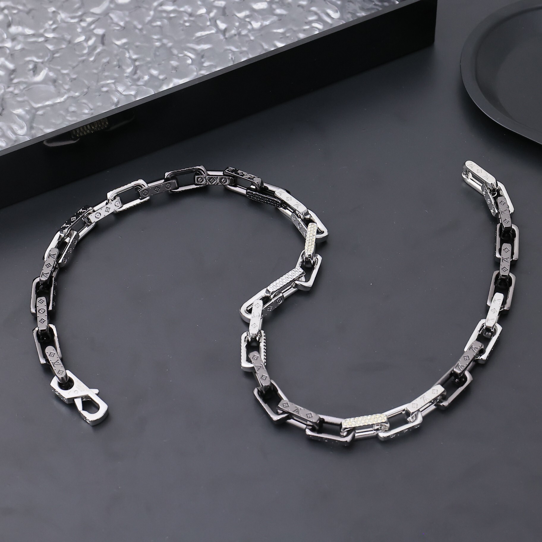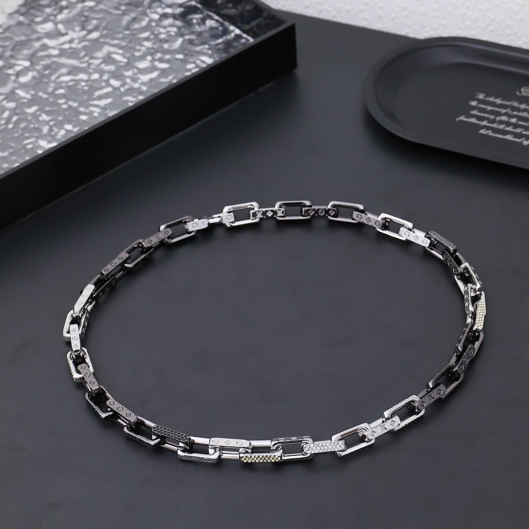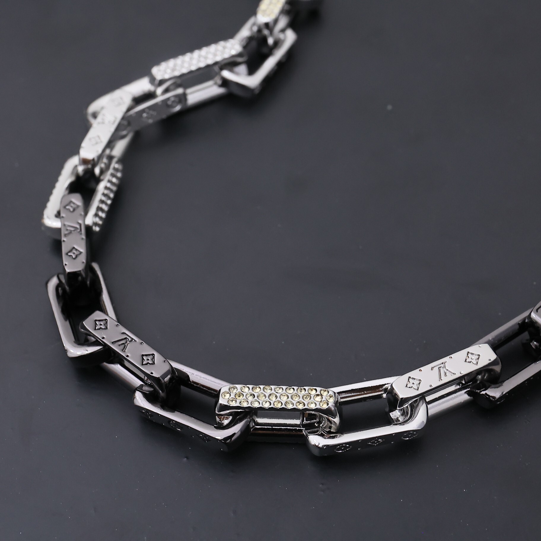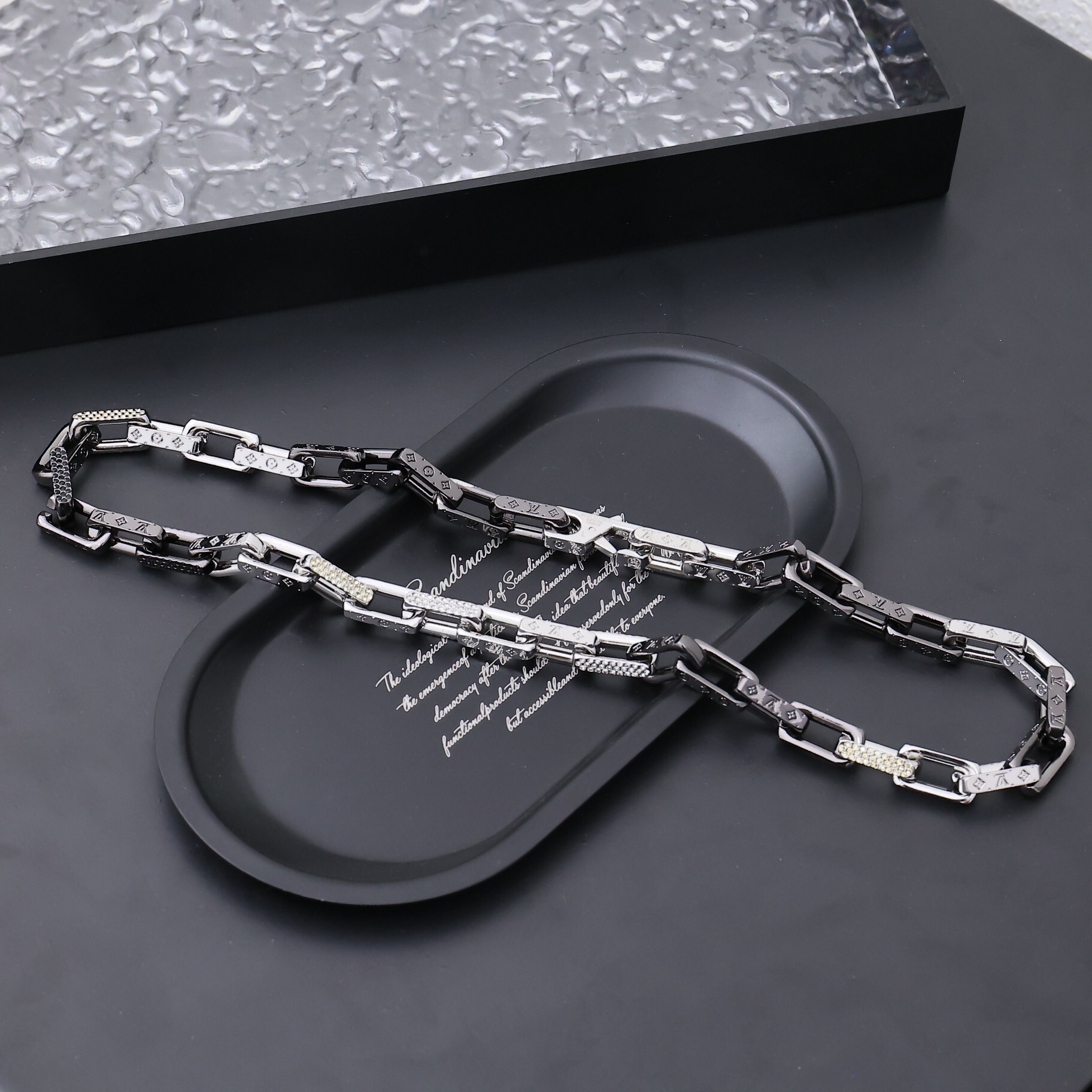 A: The necklace is crafted from high-quality silver-tone metal and features black chain links for a contrasting design. The silver-tone links are engraved with the iconic Louis Vuitton monogram.