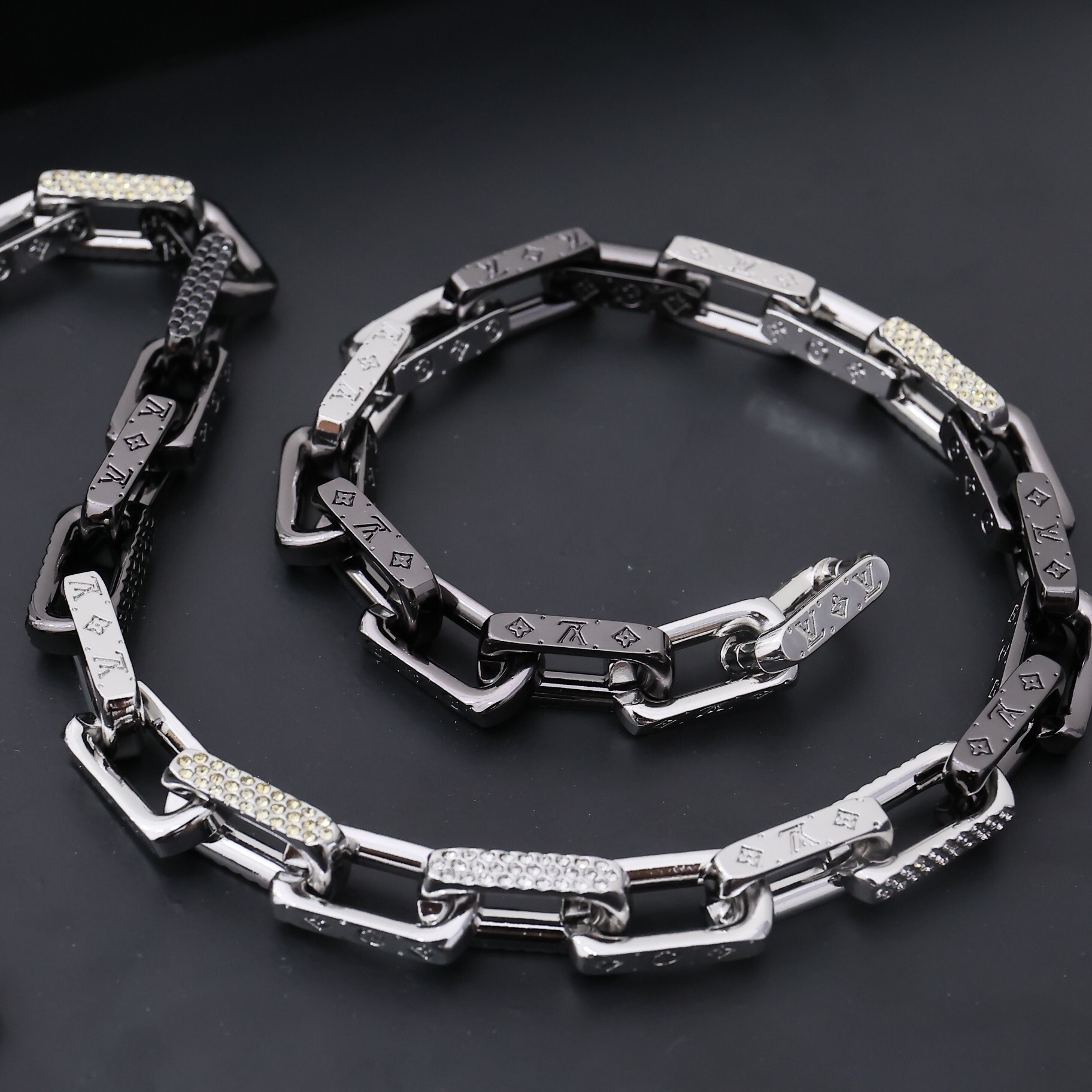 Louis Vuitton Black Chain - The Louis Vuitton Silver Black Chain Necklace is a stunning piece of jewelry that combines the iconic Louis Vuitton monogram with a modern, edgy design. This necklace features a unique triangular shape formed by interlocking silver and black chain links, creating a bold and sophisticated look. The meticulous craftsmanship and attention to detail make it a true statement piece for any fashion enthusiast. The contrasting colors and geometric design add a touch of contemporary flair, making it a versatile accessory that can elevate both casual and formal outfits. This necklace is more than just an accessory; it's a symbol of luxury and style, reflecting the timeless elegance of the Louis Vuitton brand. The Louis Vuitton Silver Black Chain Necklace is designed to capture attention and showcase your impeccable taste.
