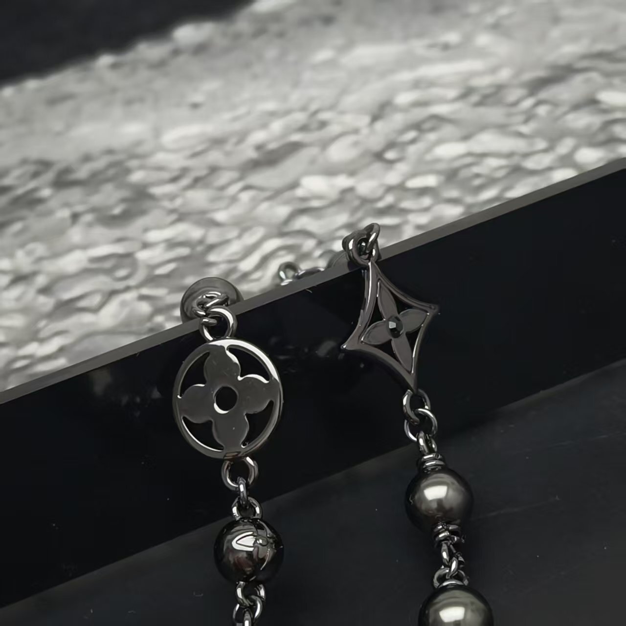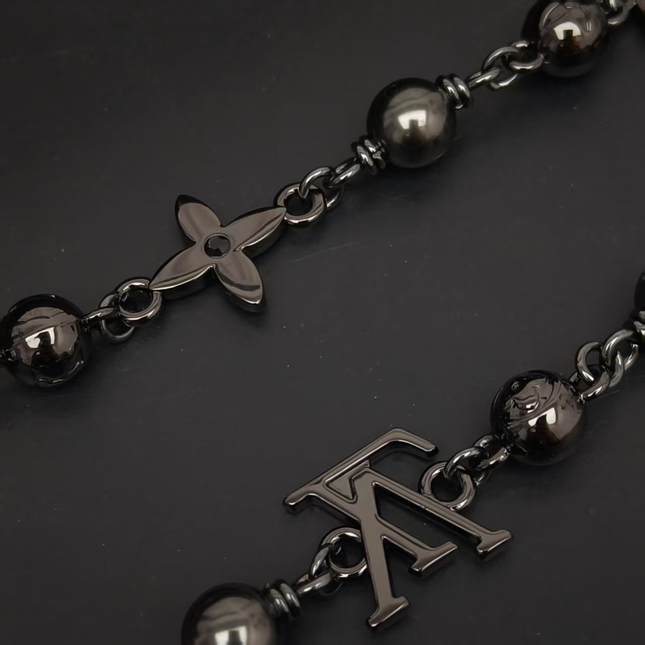 A: The necklace features genuine black pearls and a chain with a gunmetal finish. The chain is also adorned with iconic Louis Vuitton emblems.