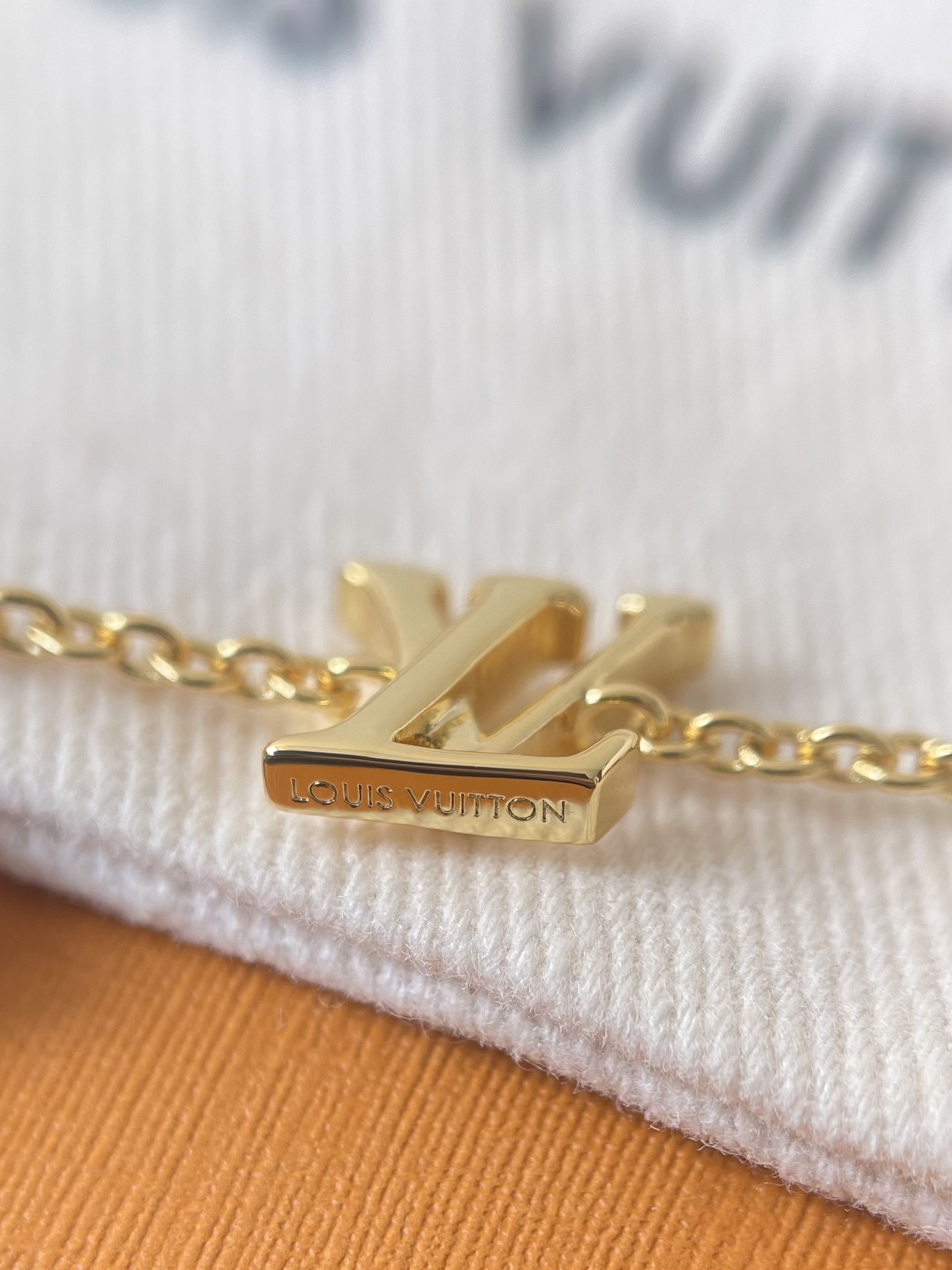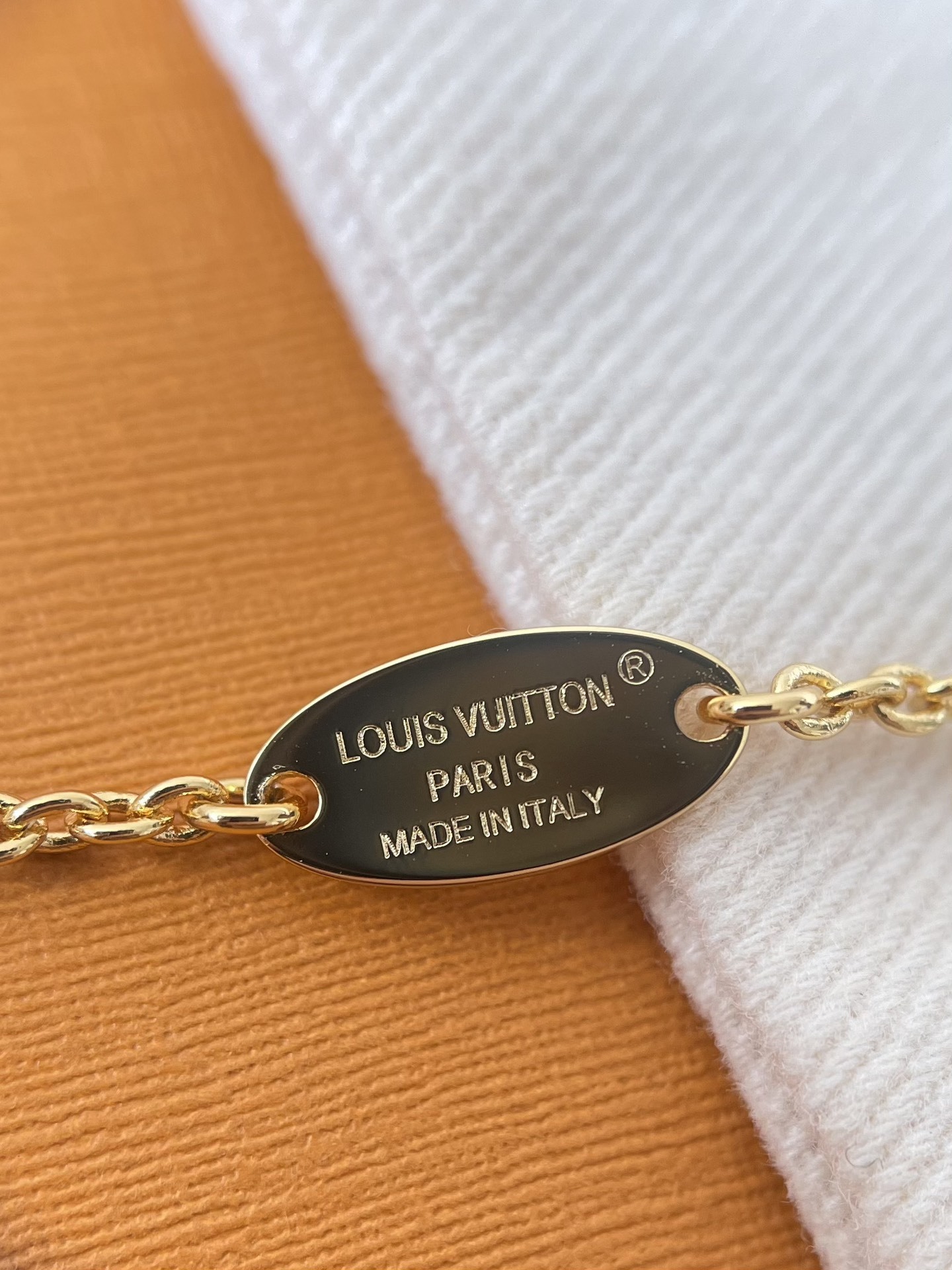 This bracelet features delicate blossom charms alongside the iconic Louis Vuitton logo, creating a harmonious blend of femininity and brand recognition. The bracelet is made with high-quality materials, ensuring durability and a lasting shine. The gold-tone finish exudes warmth and elegance, making it a versatile piece for both casual and formal occasions.