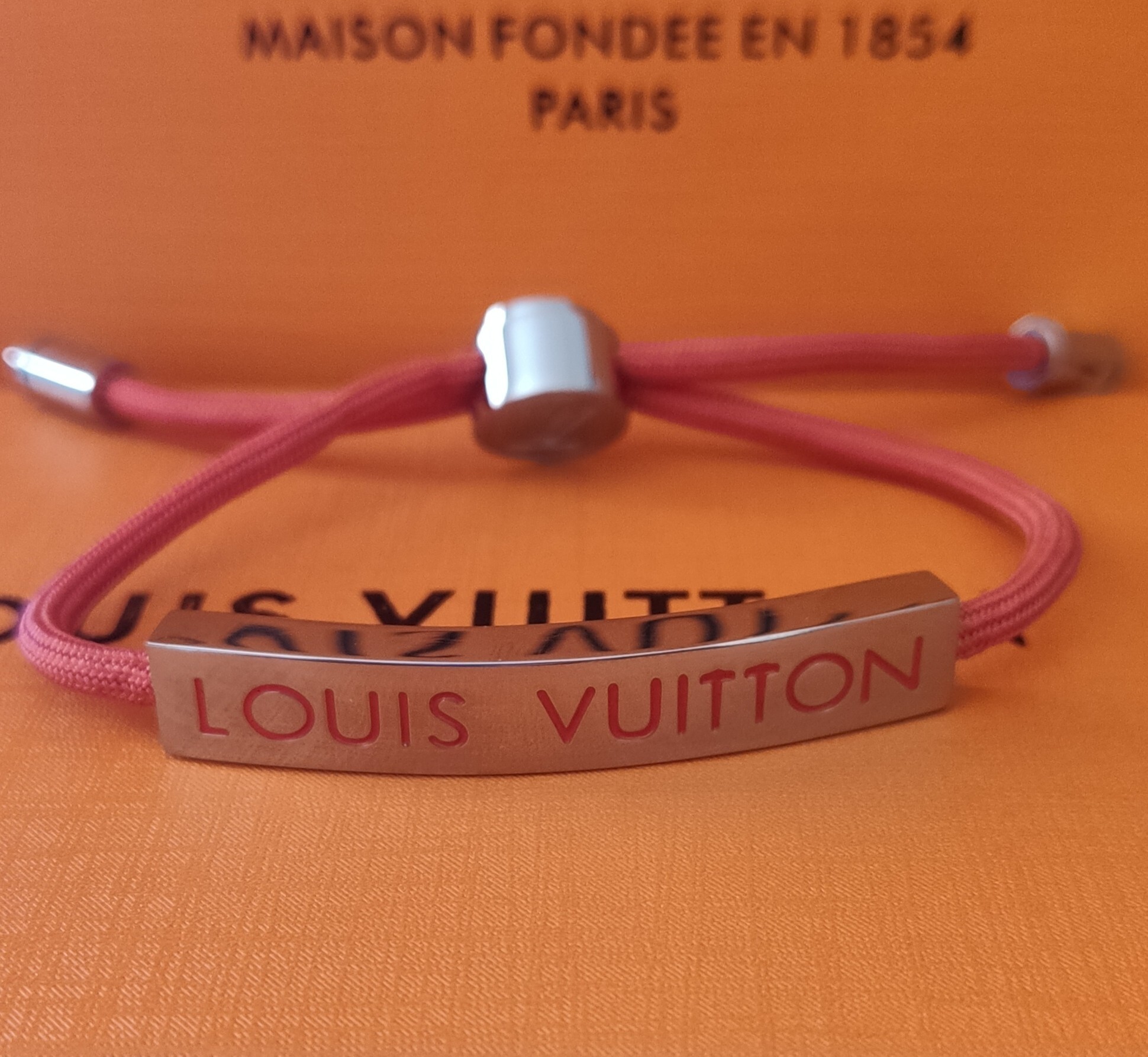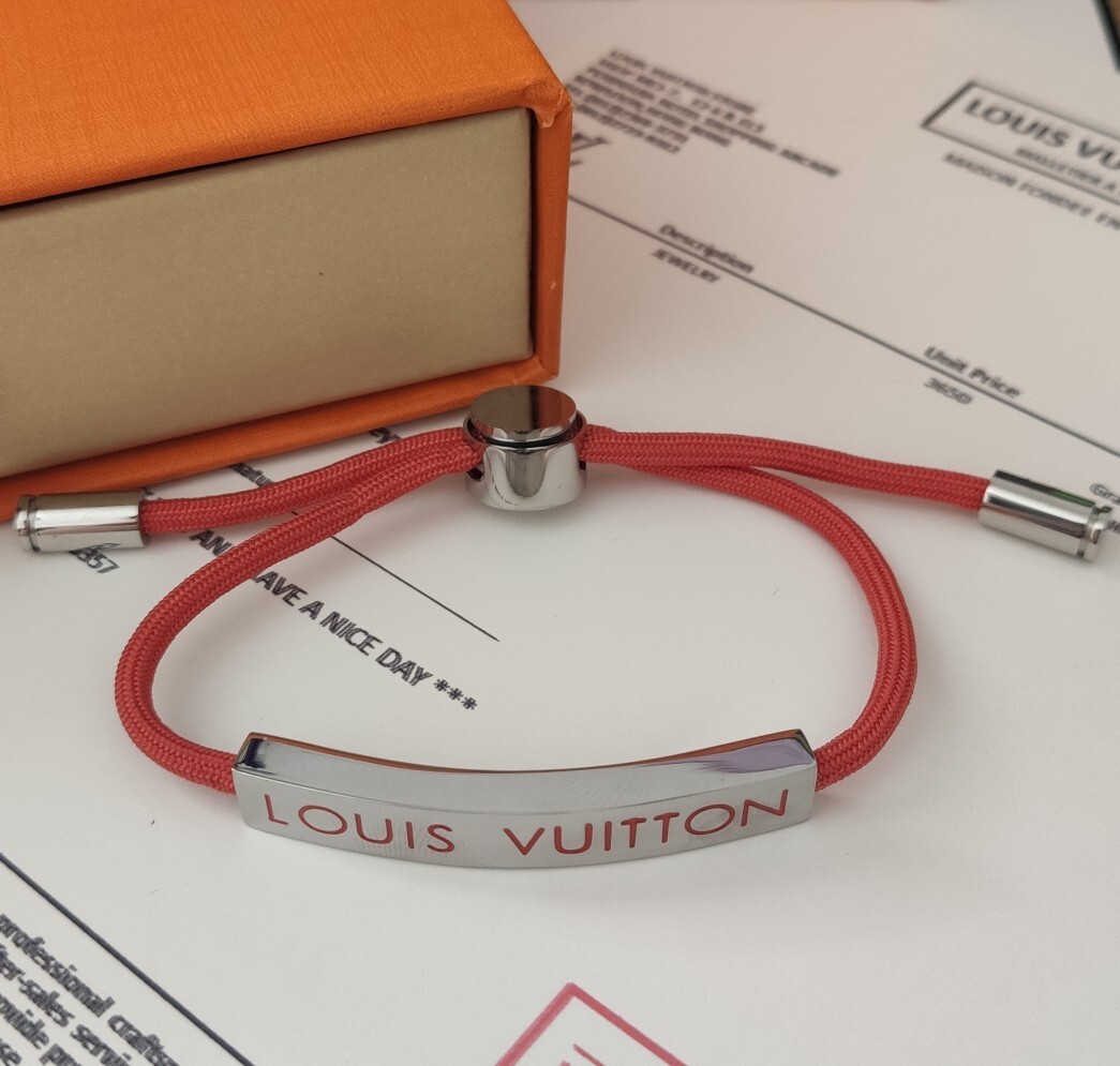 The bracelet features a vibrant red cord that adds a pop of color and a touch of modern sophistication. The signature Louis Vuitton logo is prominently displayed on a sleek metal plaque, showcasing your impeccable taste. The adjustable closure ensures a comfortable and secure fit for any wrist size. The combination of the durable cord and high-quality metal accents guarantees longevity and lasting beauty.