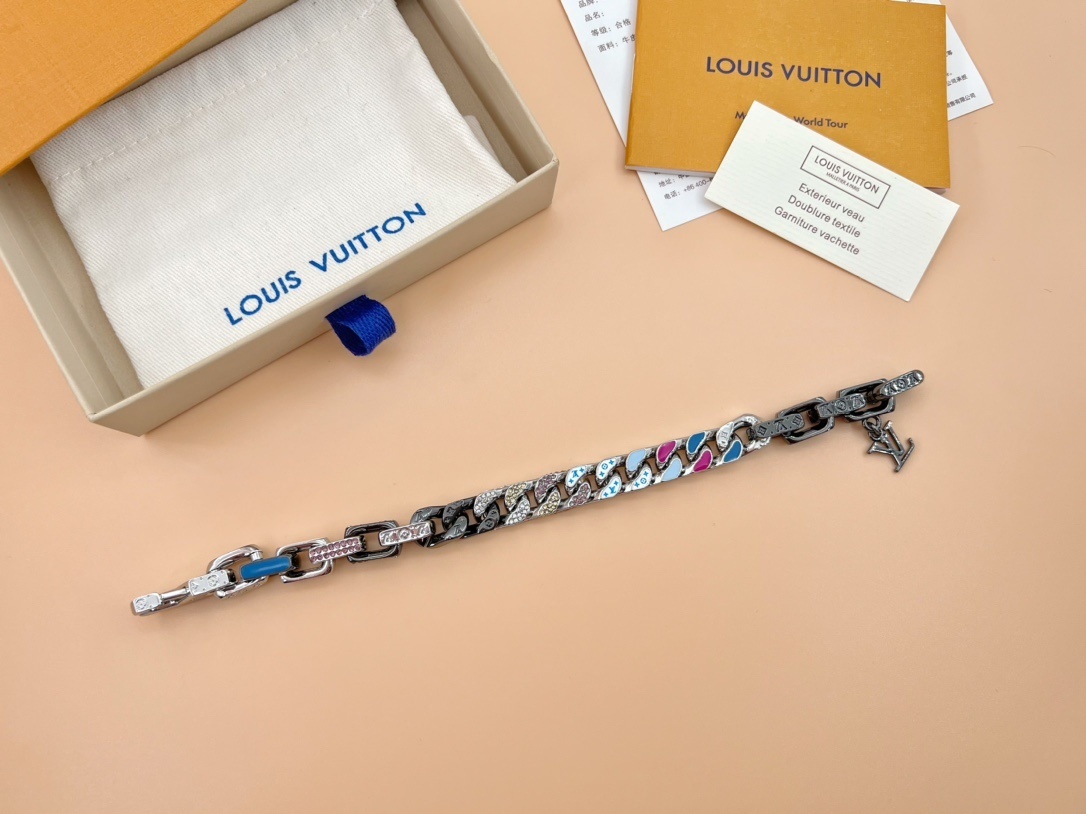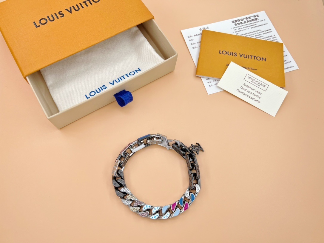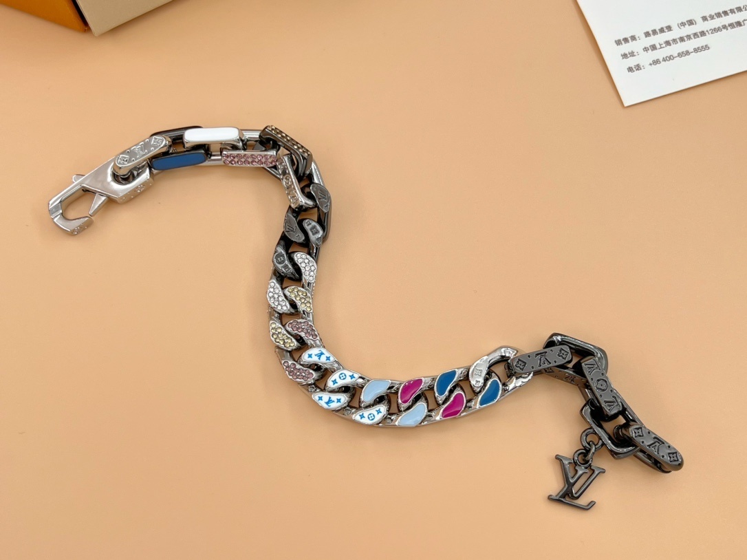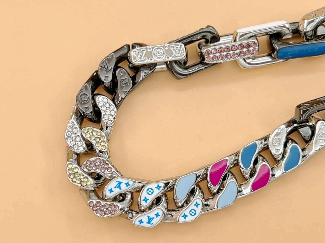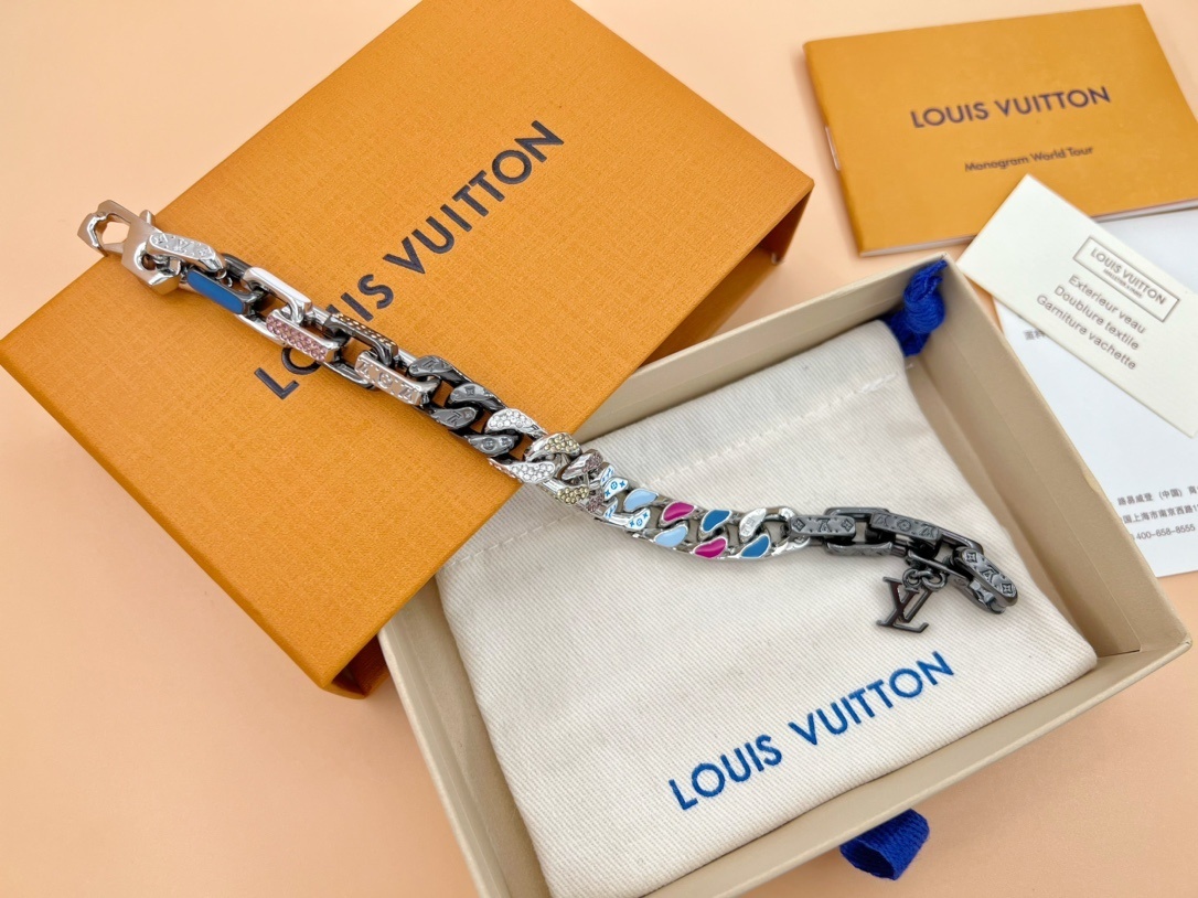 This stunning bracelet features a bold chain design, meticulously crafted from high-quality materials. Each link is adorned with signature Louis Vuitton motifs, adding a touch of timeless elegance. The vibrant color accents and sparkling embellishments create a captivating visual effect, ensuring you stand out from the crowd.