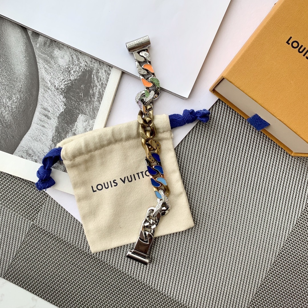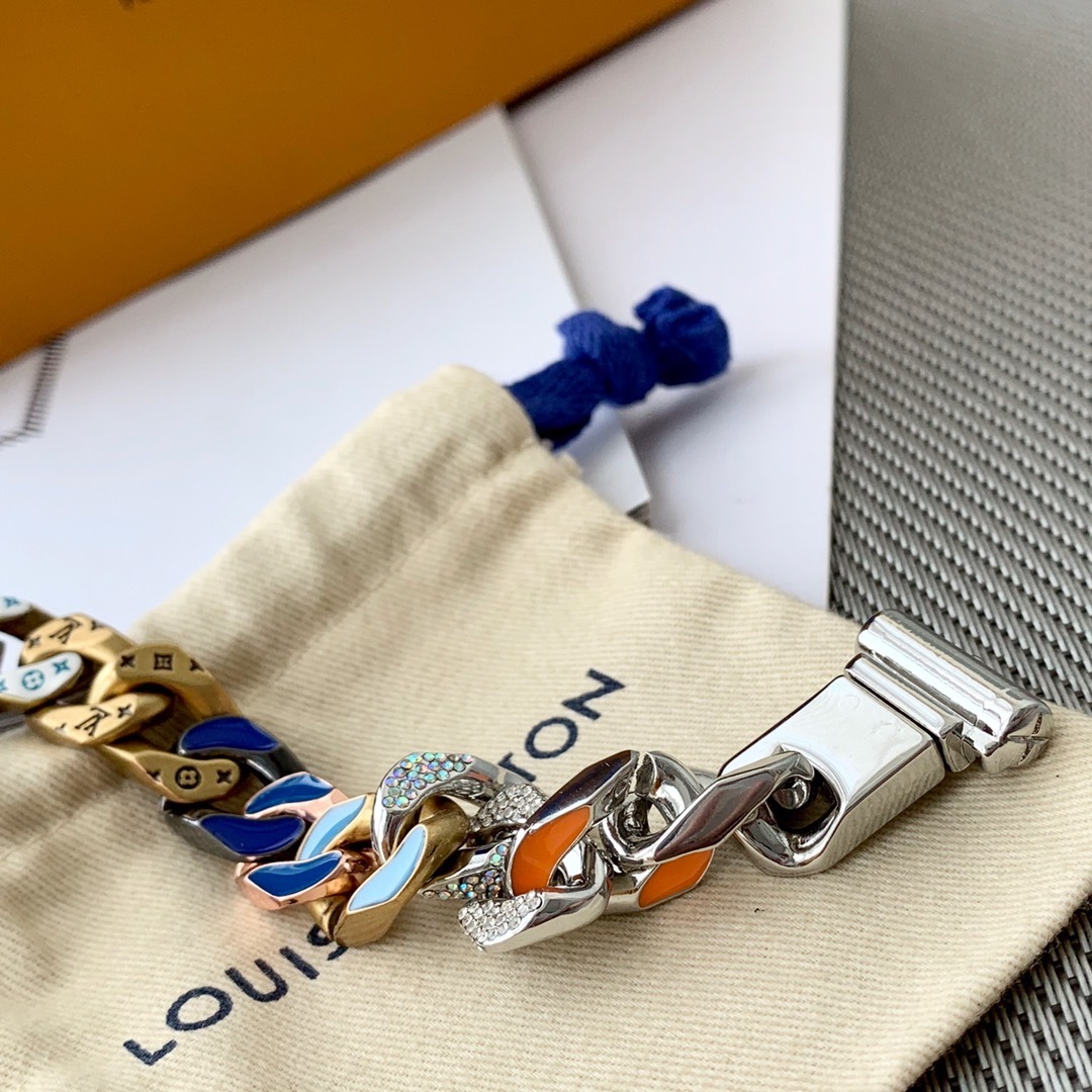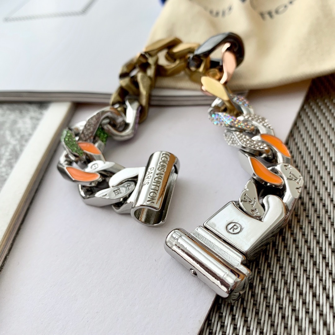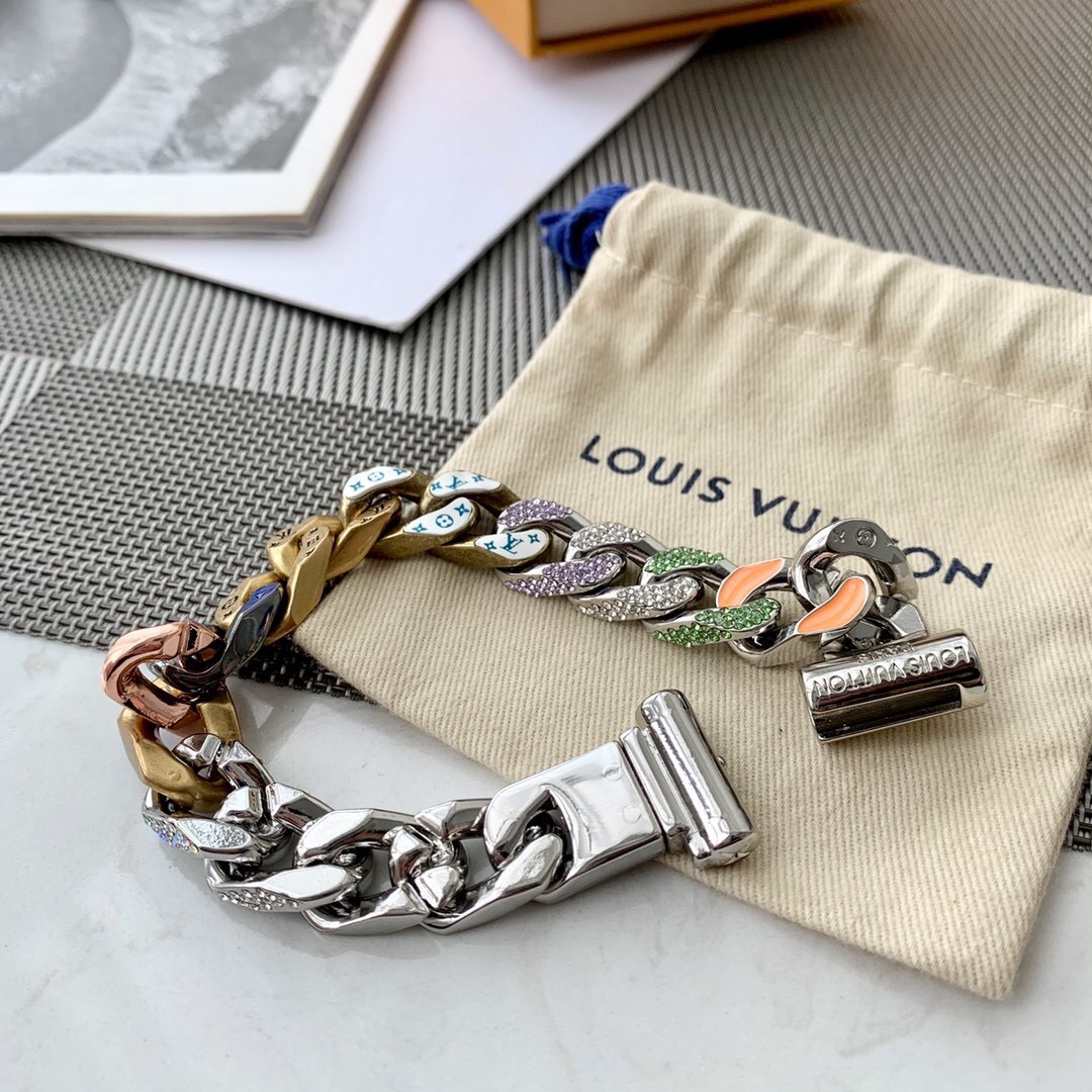 The Chain Links Bracelet features a unique combination of metal finishes, including silver, gold, and vibrant enamel accents. The iconic Louis Vuitton monogram is subtly incorporated into the design, adding a touch of brand recognition without being overtly flashy. The secure clasp ensures a comfortable and confident fit. The bracelet is constructed from high-quality metal alloys that are resistant to tarnishing and scratching, ensuring that it will maintain its luster for years to come.