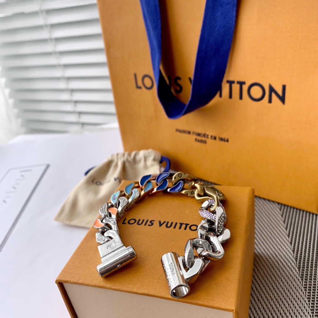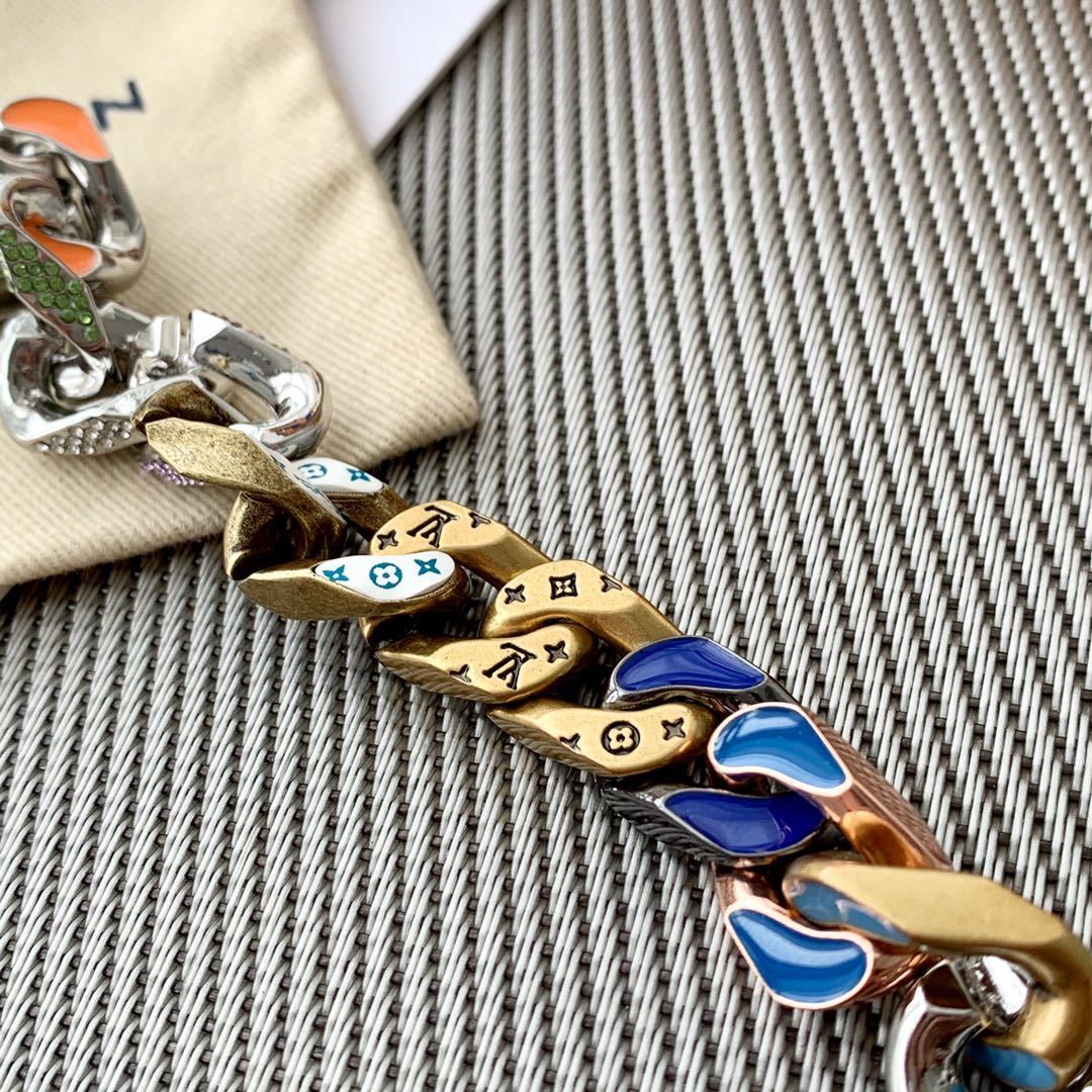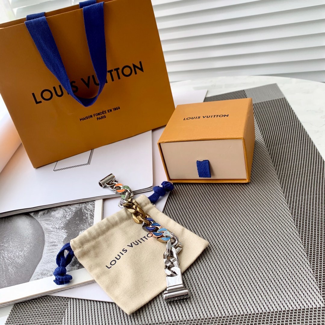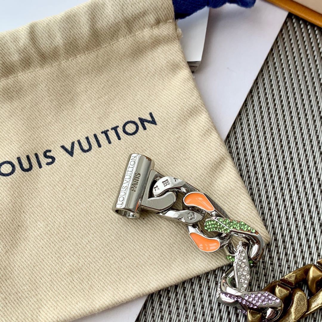 The Chain Links Bracelet features a unique combination of metal finishes, including silver, gold, and vibrant enamel accents. The iconic Louis Vuitton monogram is subtly incorporated into the design, adding a touch of brand recognition without being overtly flashy. The secure clasp ensures a comfortable and confident fit. The bracelet is constructed from high-quality metal alloys that are resistant to tarnishing and scratching, ensuring that it will maintain its luster for years to come.