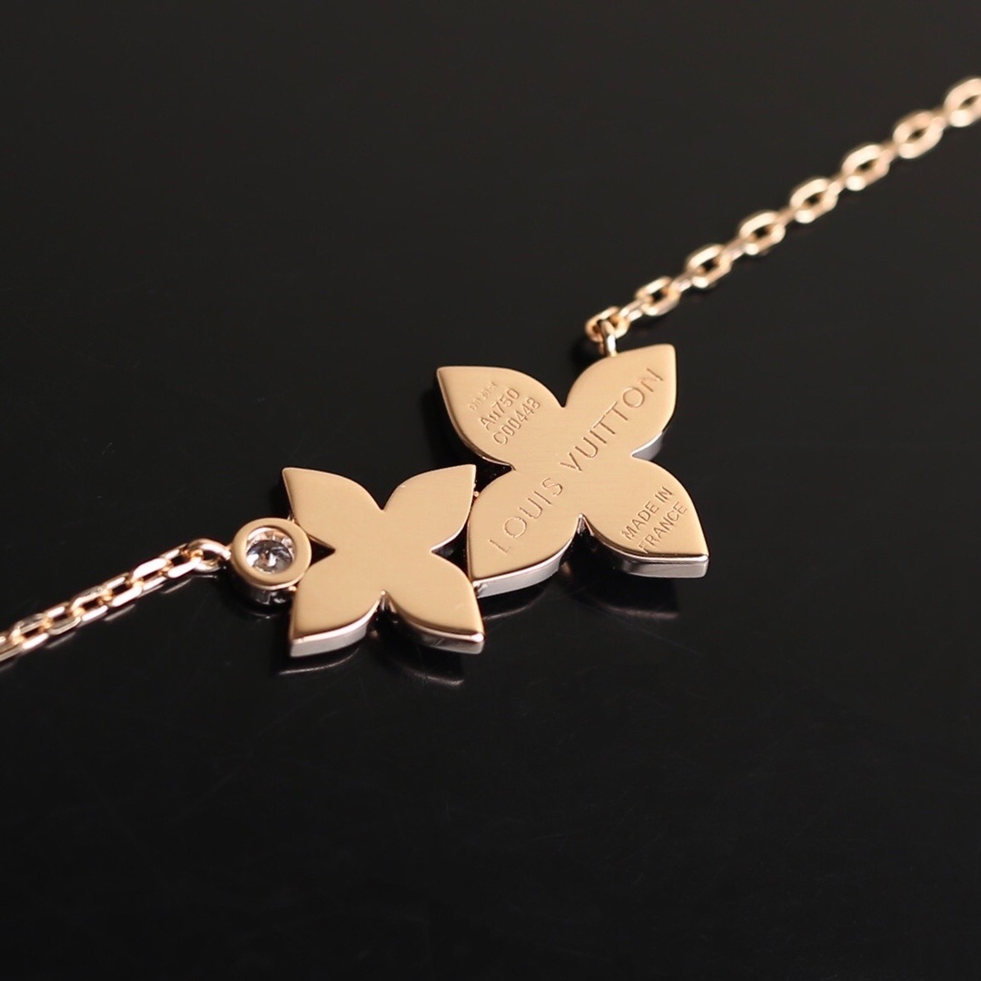 The Louis Vuitton Flower Charm Necklace boasts several distinctive features that set it apart from other jewelry pieces. The rose gold chain is not only durable but also adds a warm, radiant glow to the necklace. The flower charms are intricately designed, showcasing Louis Vuitton's commitment to detail.