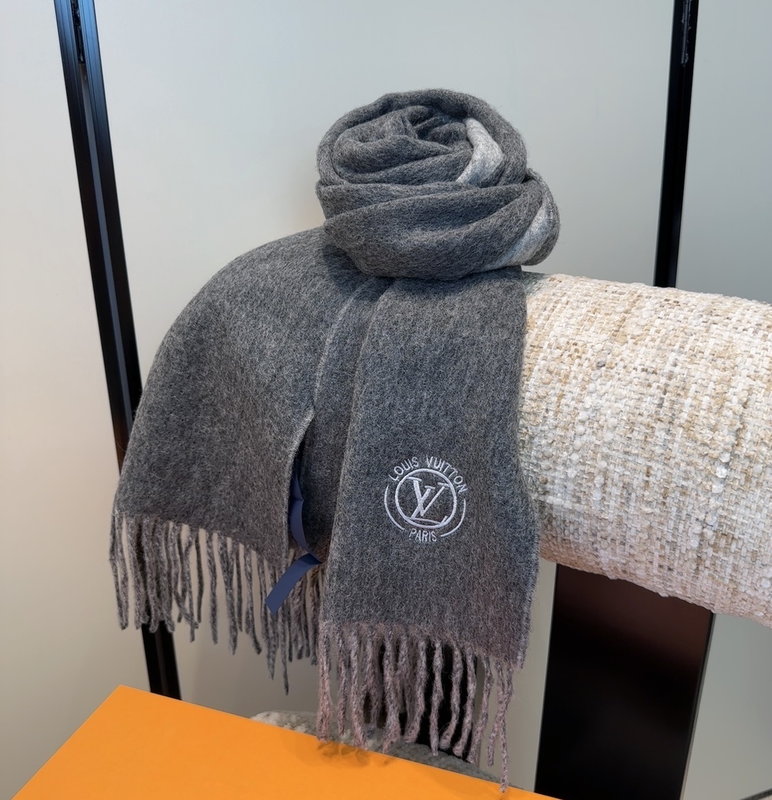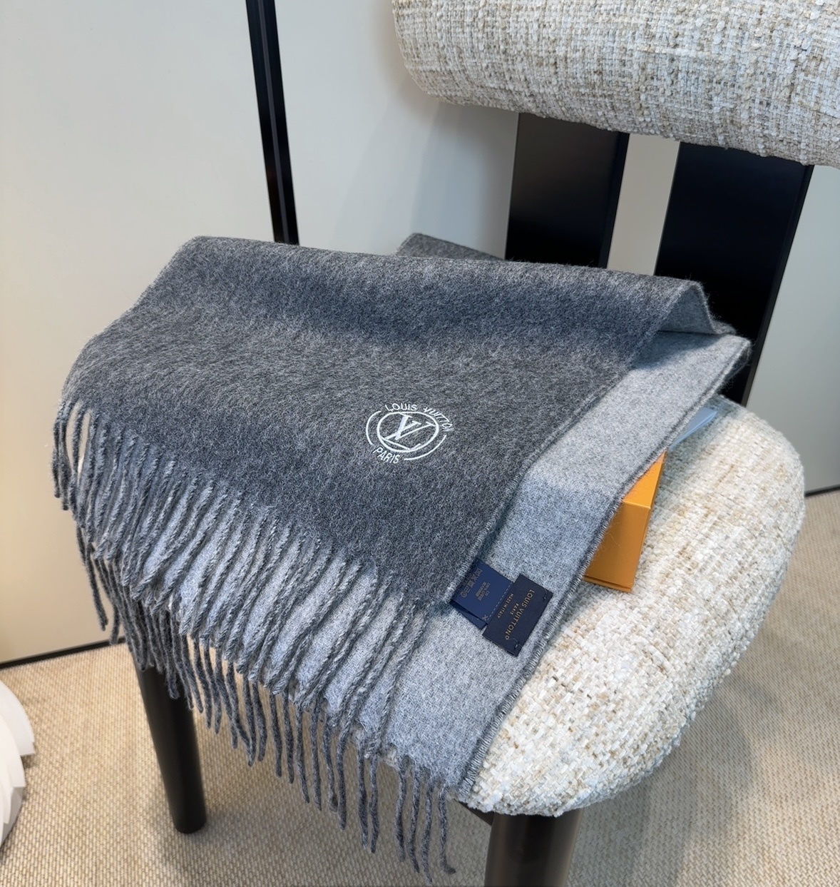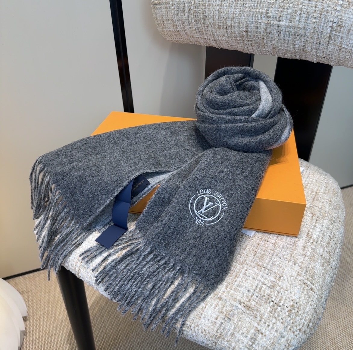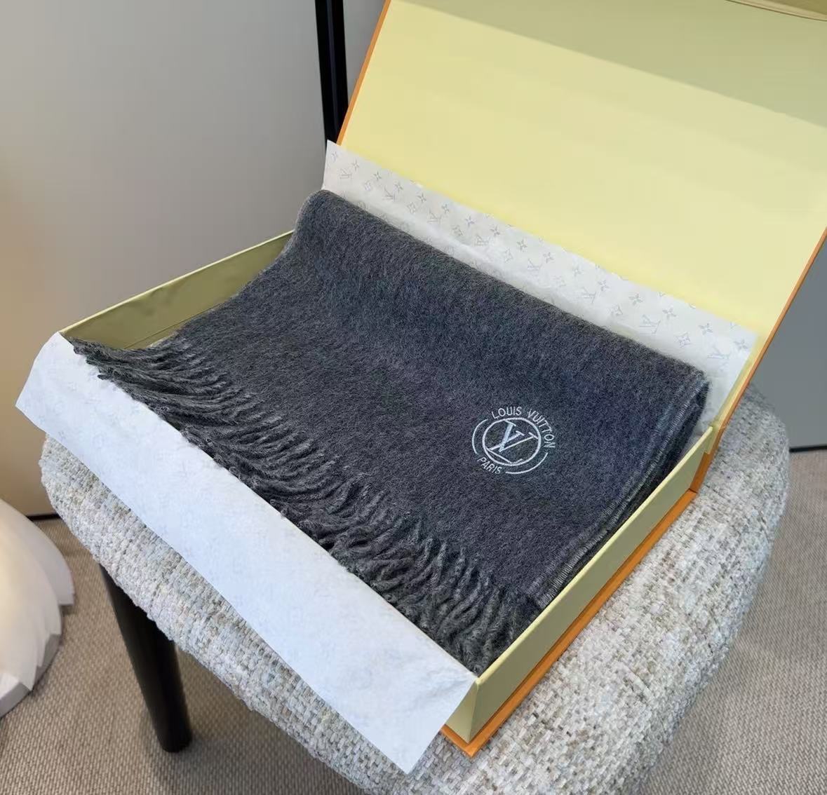Yes, the scarf is designed to be unisex and can be worn by both men and women. - Does the Louis Vuitton Grey Wool Scarf come with a gift box?