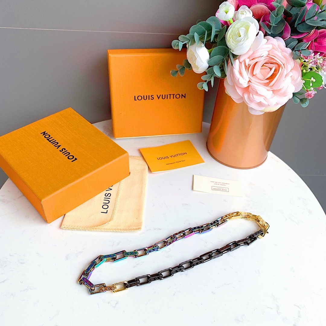 The Louis Vuitton Iridescent Chain Necklace can be worn in a variety of ways to complement your personal style. For a casual look, pair it with a simple t-shirt and jeans. The iridescent finish will add a touch of sophistication to the outfit without being too overpowering. For a more formal occasion, wear it with a dress or blouse. The necklace will add a pop of color and visual interest to your ensemble.