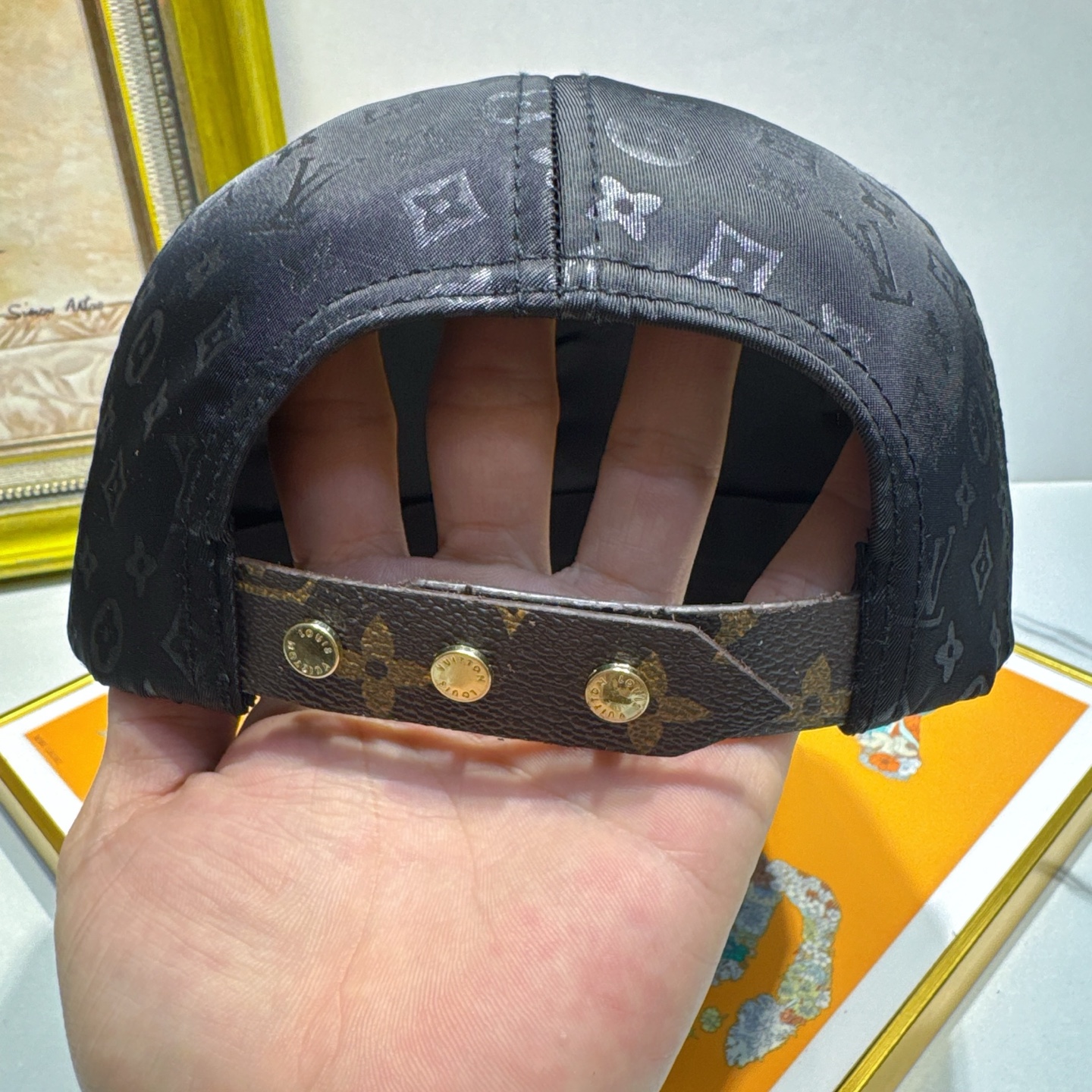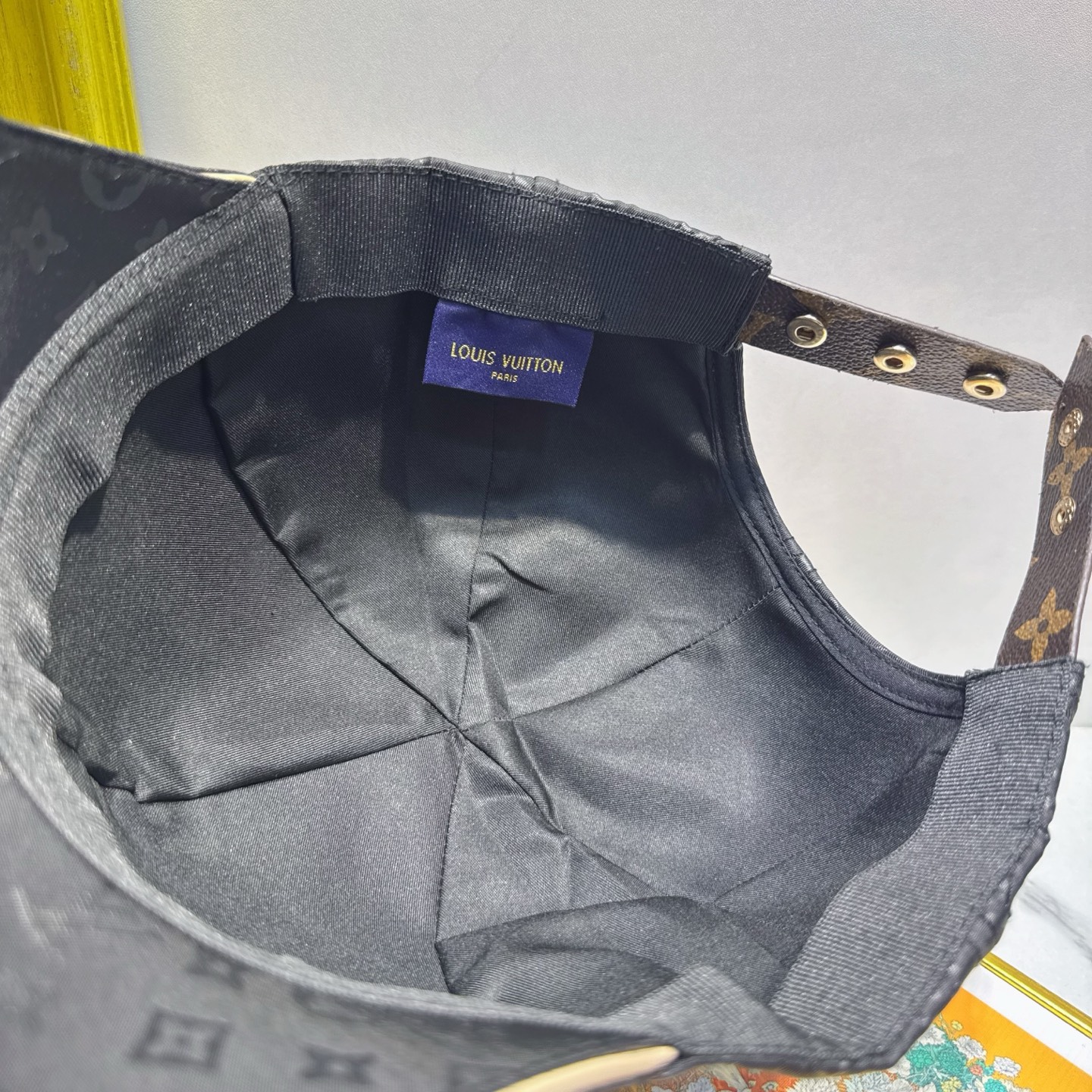 A: Yes, the cap features an adjustable strap at the back, allowing for a customized and secure fit for all head sizes. The metal buckle on the strap is embossed with the Louis Vuitton logo.