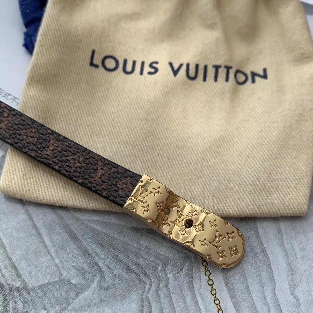 - Buckle: Gold-tone metal with LV engraving