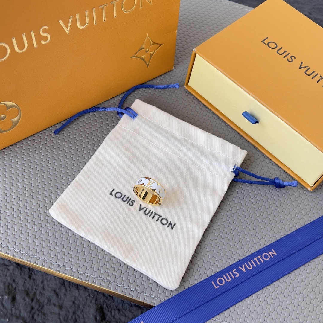 Louis Vuitton Monogram Ring - Elevate your style with the exquisite Louis Vuitton White & Gold Monogram Ring. This stunning piece of jewelry seamlessly blends the iconic Louis Vuitton monogram with a contemporary design, creating a timeless accessory that exudes sophistication and luxury. The ring features a lustrous white enamel band adorned with the signature LV monogram in radiant gold, making it a statement piece that will capture attention wherever you go. This Louis Vuitton White & Gold Monogram Ring is a perfect addition to your our store collection.