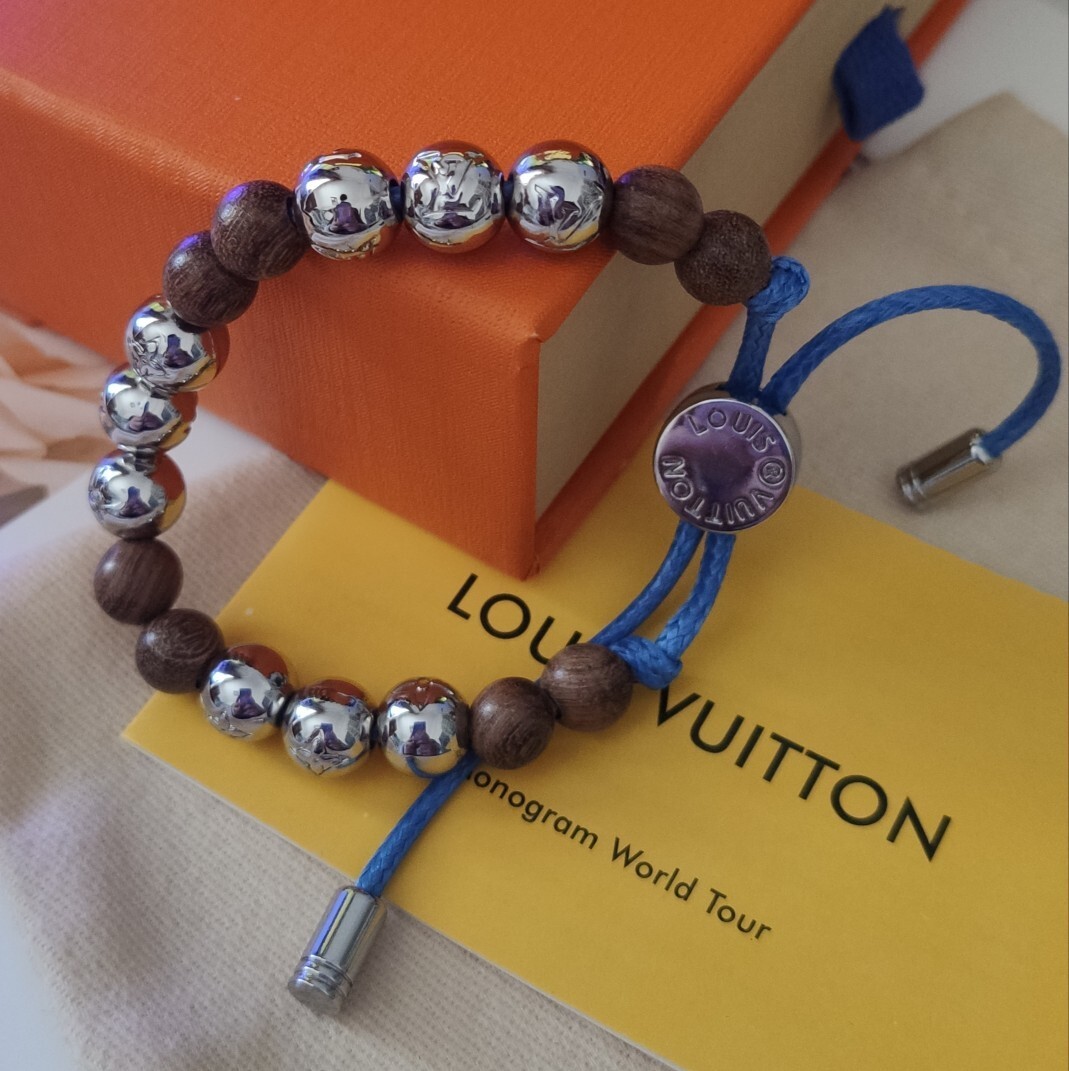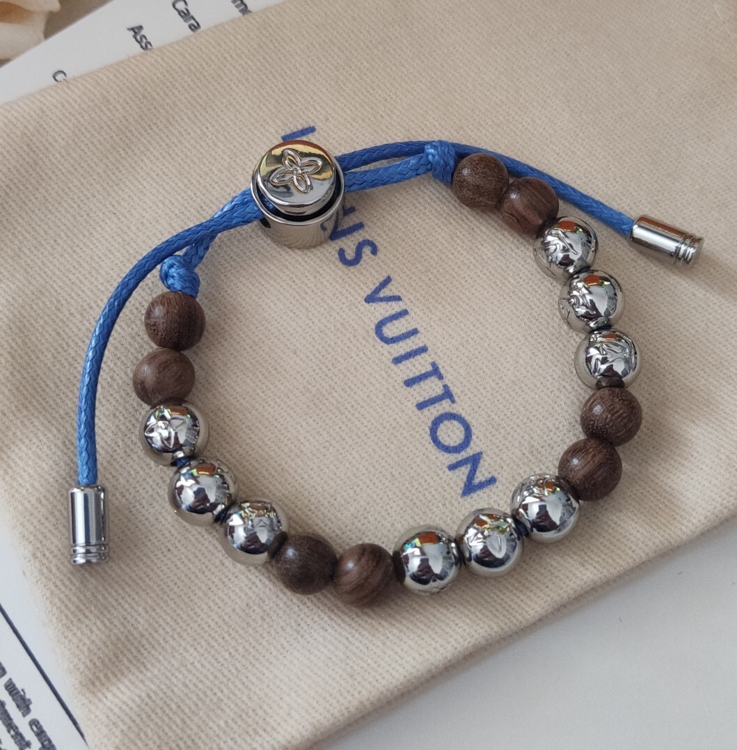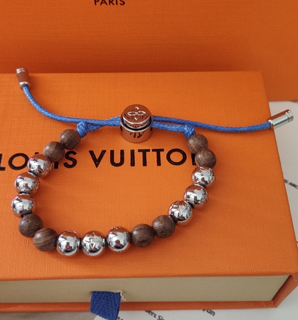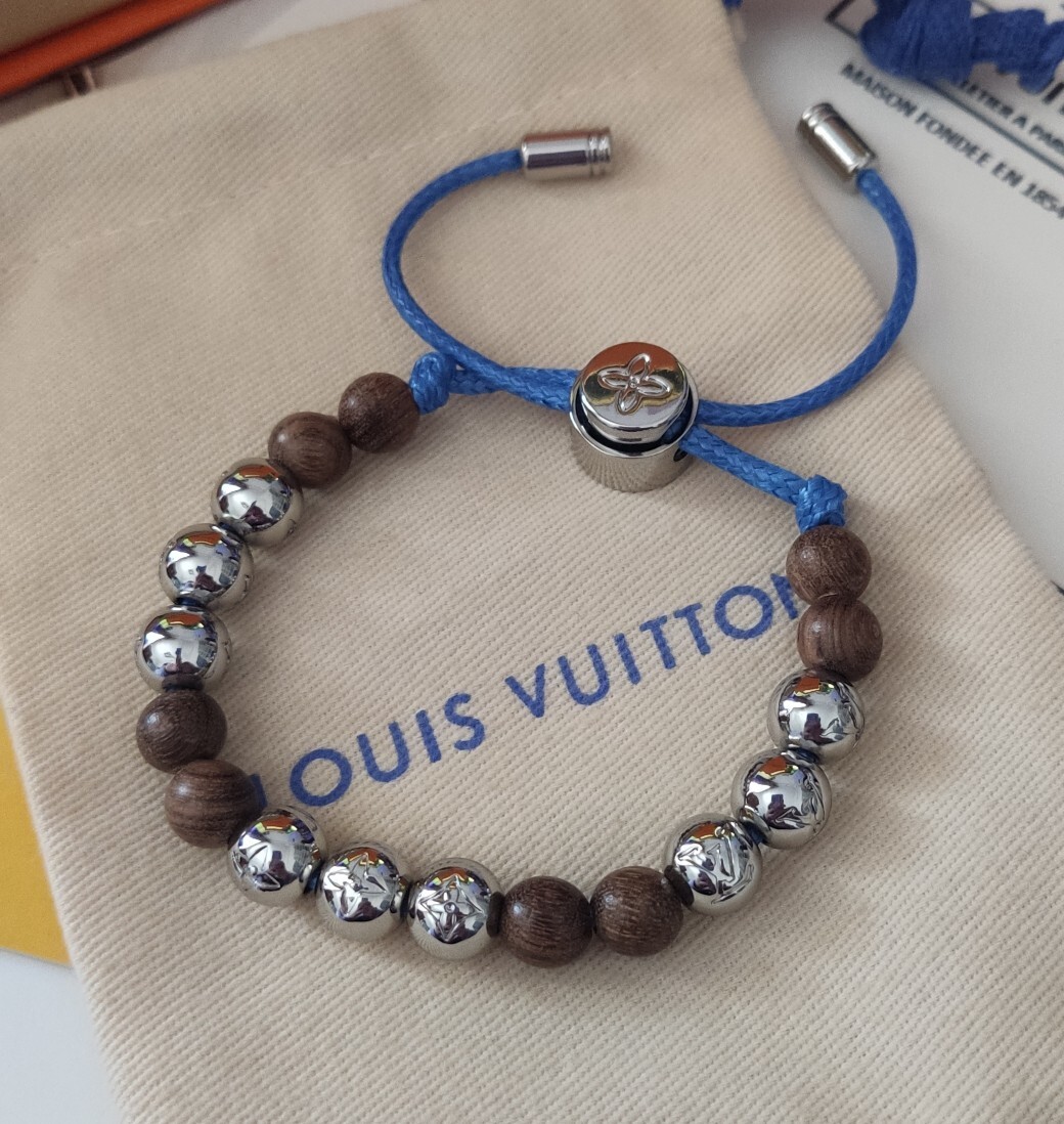This bracelet features a harmonious blend of materials, showcasing the brand's commitment to quality. The alternating wooden and silver beads create a captivating visual rhythm, while the blue cord adds a subtle touch of color and modern appeal. The iconic Louis Vuitton Monogram is subtly incorporated into the silver beads, adding a touch of exclusivity.
