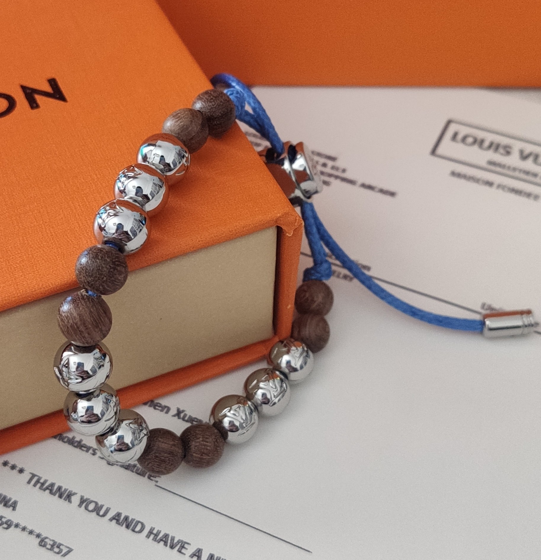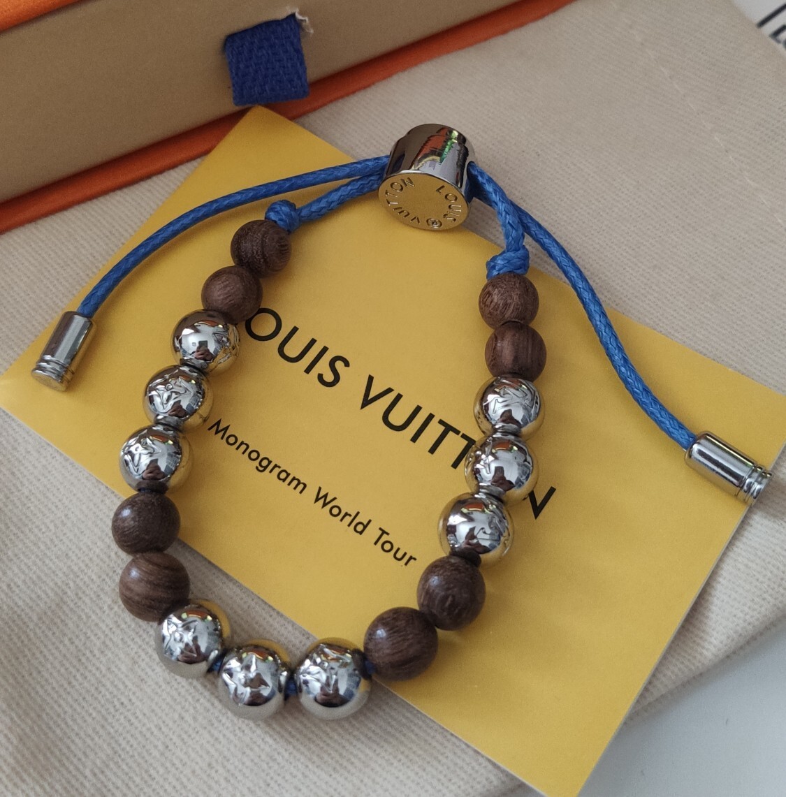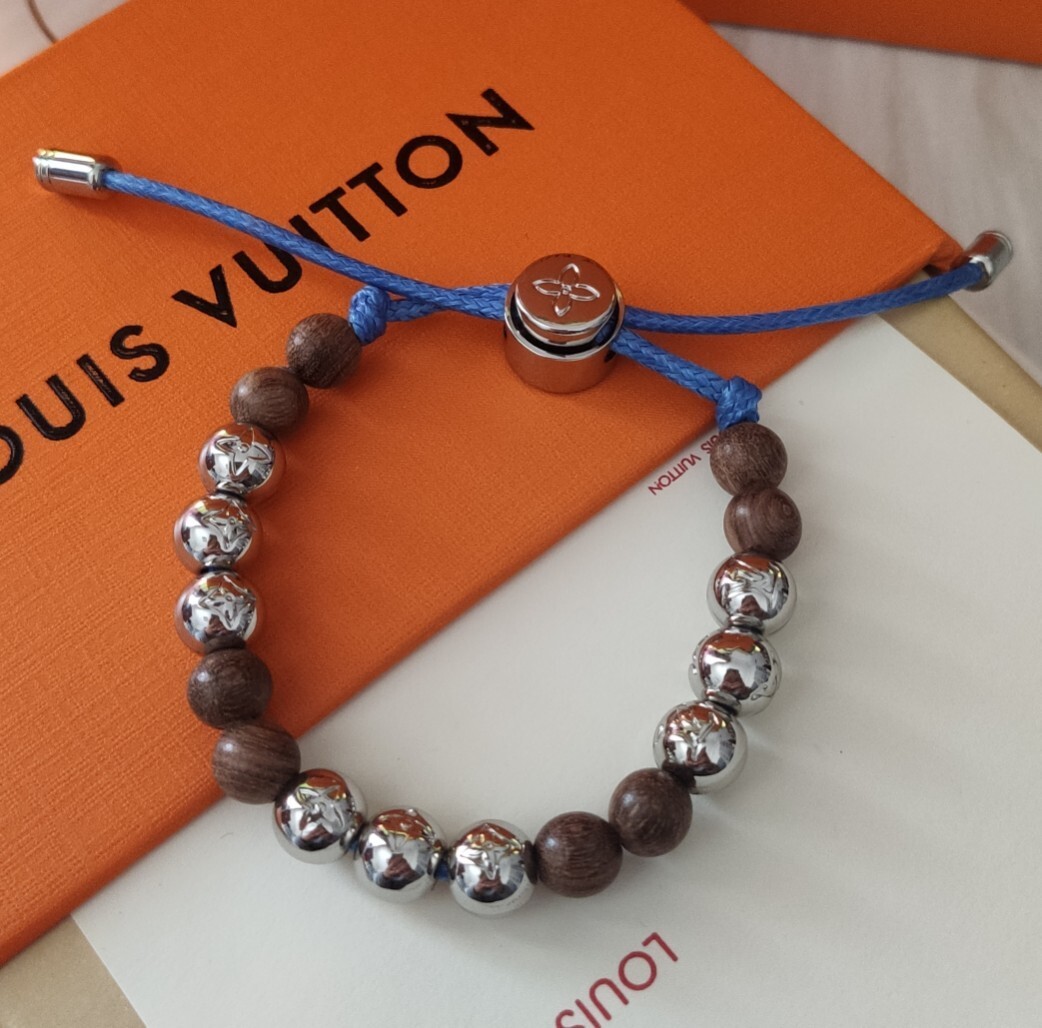 This bracelet features a harmonious blend of materials, showcasing the brand's commitment to quality. The alternating wooden and silver beads create a captivating visual rhythm, while the blue cord adds a subtle touch of color and modern appeal. The iconic Louis Vuitton Monogram is subtly incorporated into the silver beads, adding a touch of exclusivity.
