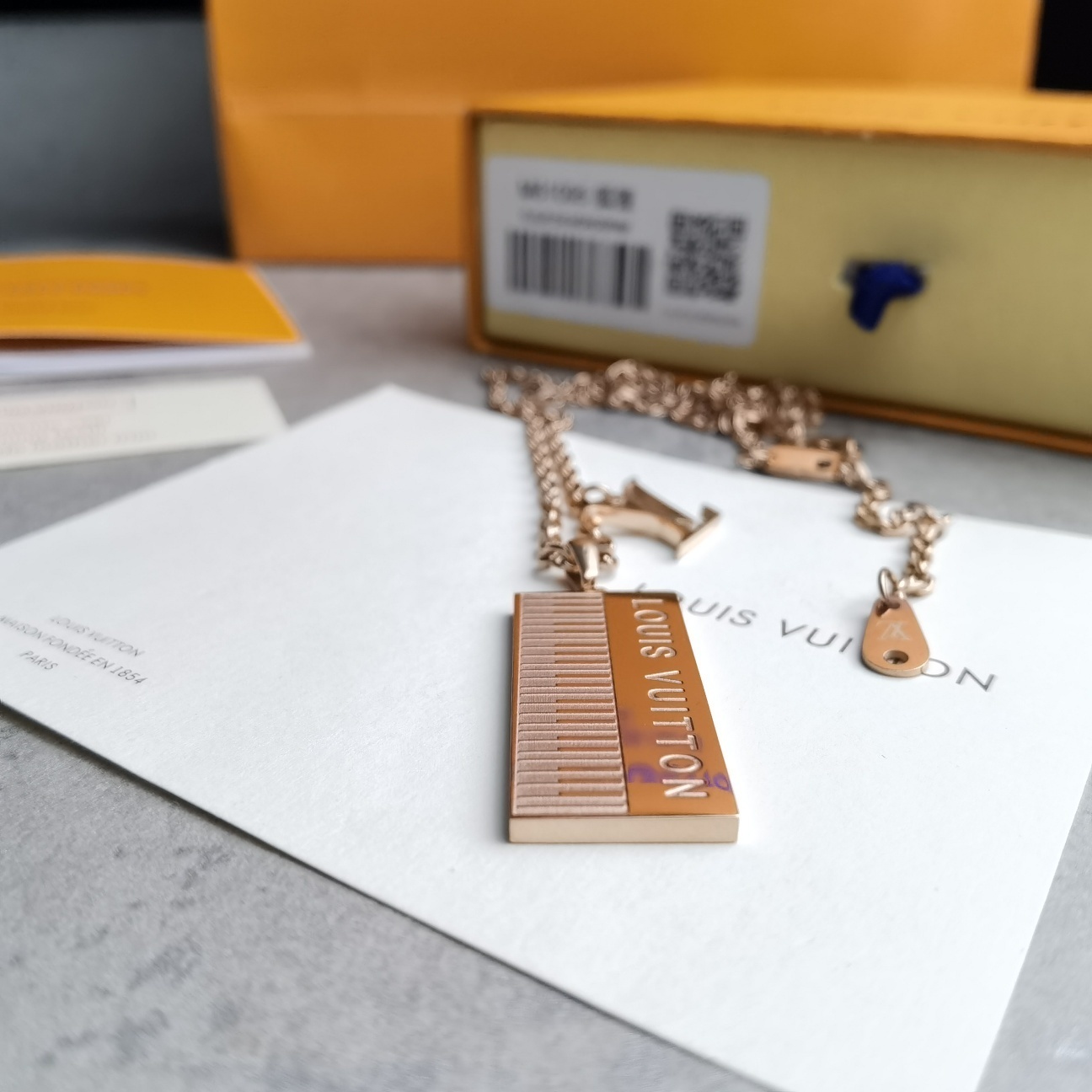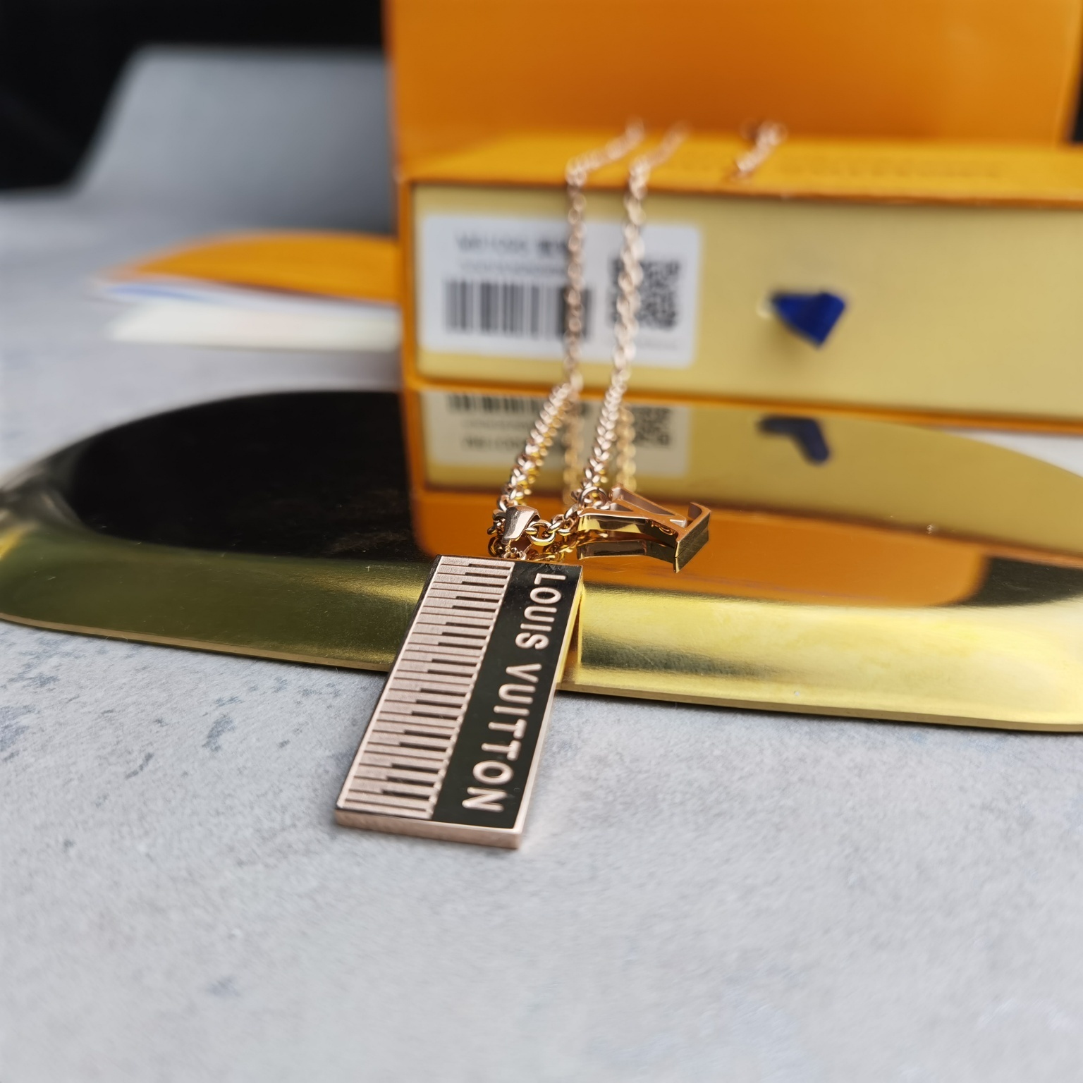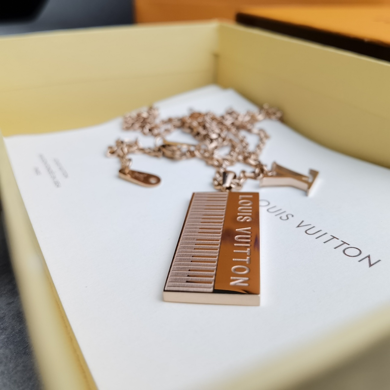 Elevate your style with the exquisite Louis Vuitton Piano Pendant Necklace. This stunning piece features a unique piano keyboard pendant in a luxurious rose gold finish, showcasing the iconic Louis Vuitton branding. It's a perfect blend of elegance and modernity, designed for those who appreciate high fashion and distinctive accessories. The necklace is a statement piece that effortlessly adds sophistication to any outfit, making it an ideal gift or a treasured addition to your own jewelry collection. With its intricate design and premium materials, this Louis Vuitton necklace is sure to turn heads and spark conversations.