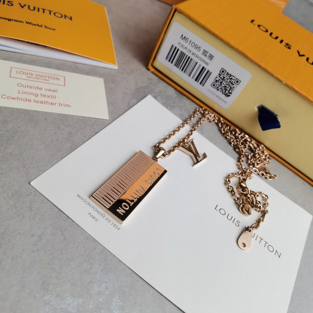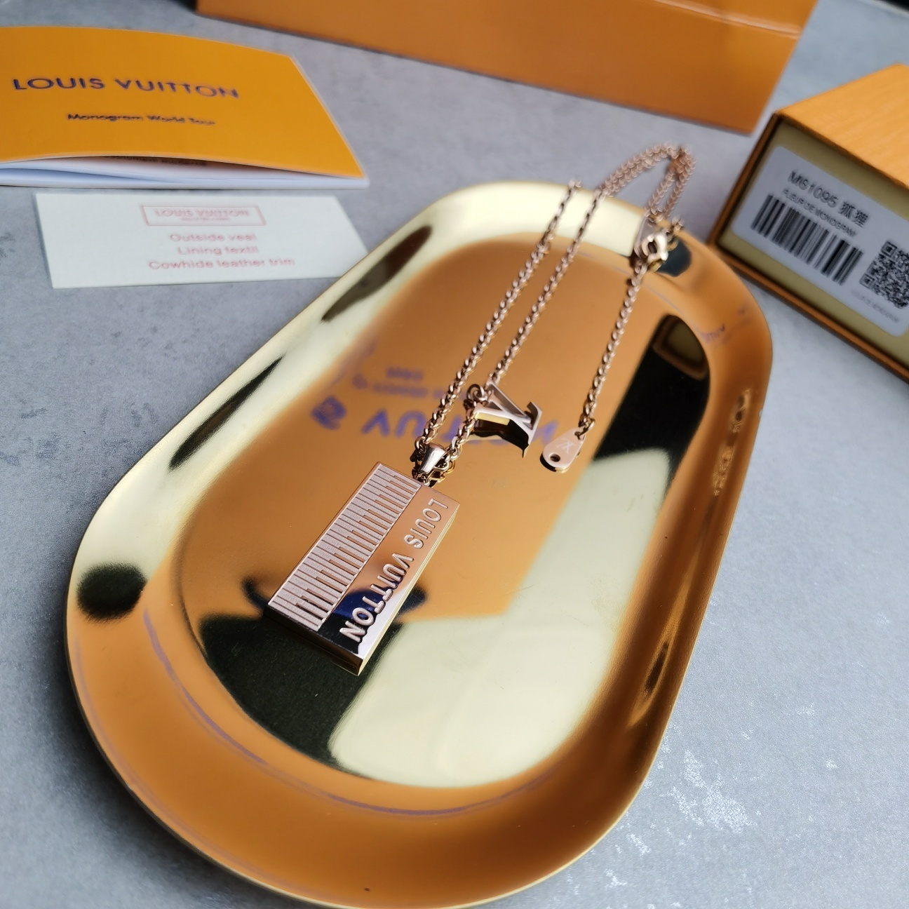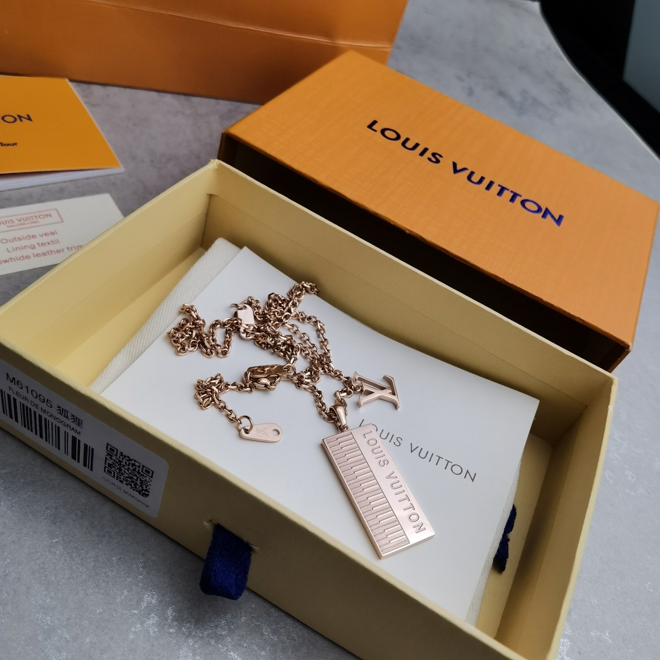 A: The Louis Vuitton Piano Pendant Necklace is crafted from high-quality metal with a rose gold finish. The pendant features intricate detailing and the iconic Louis Vuitton logo.
