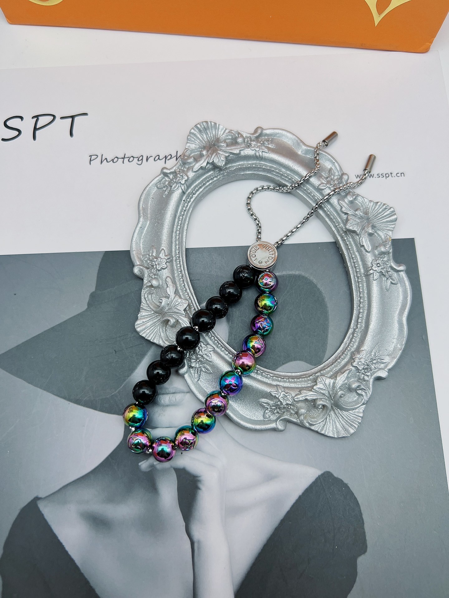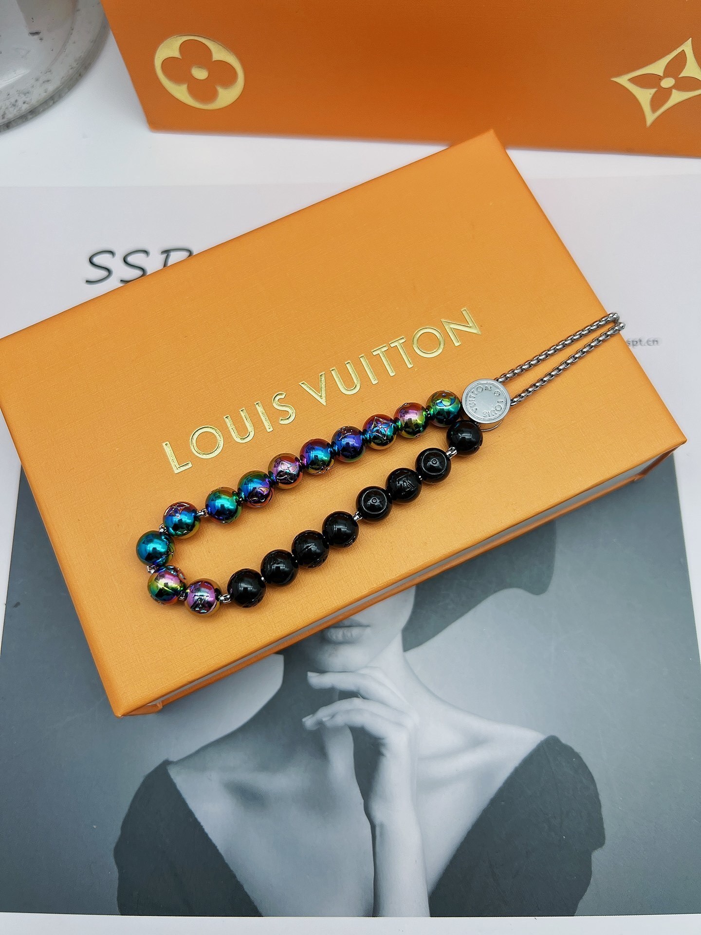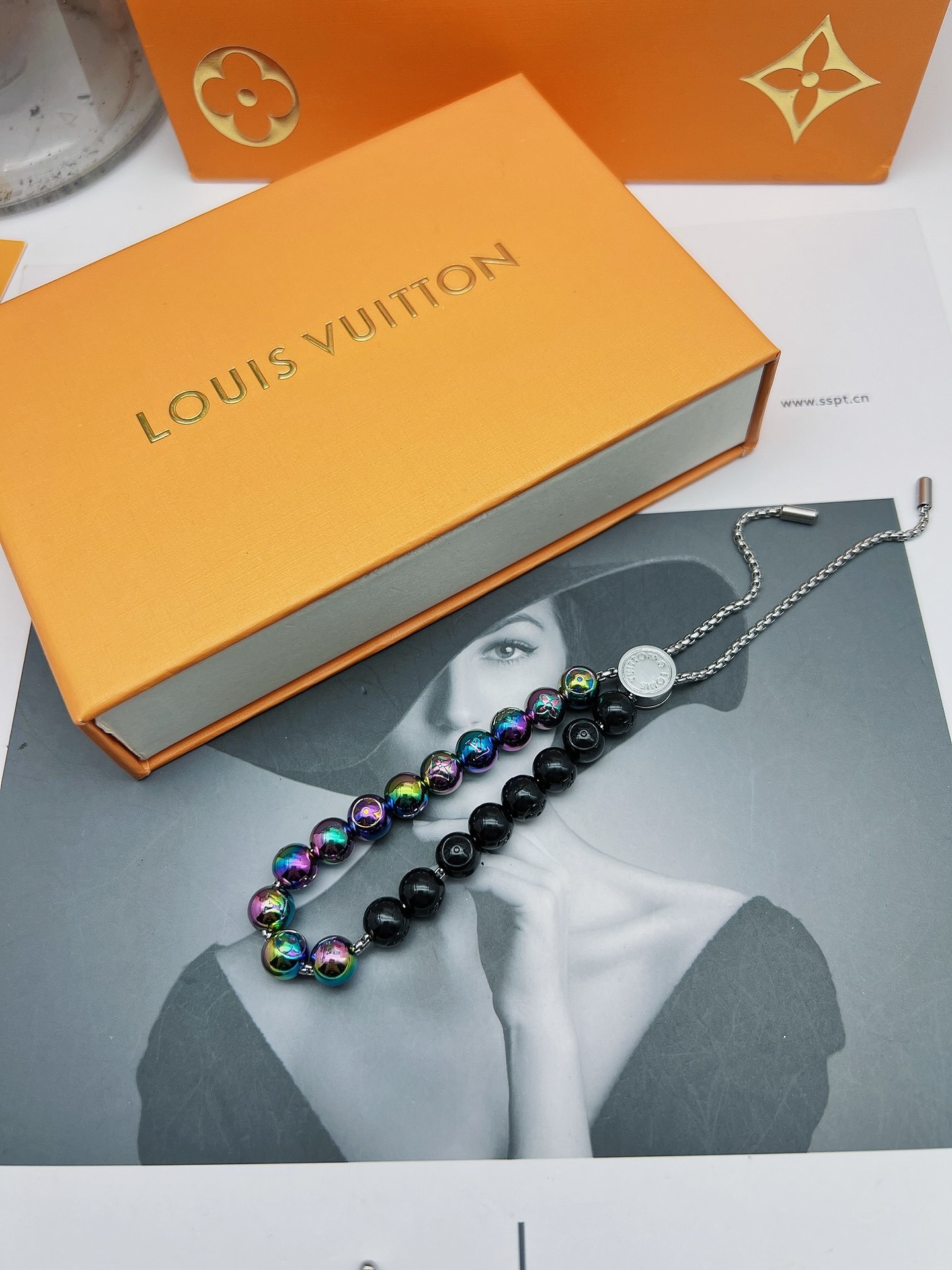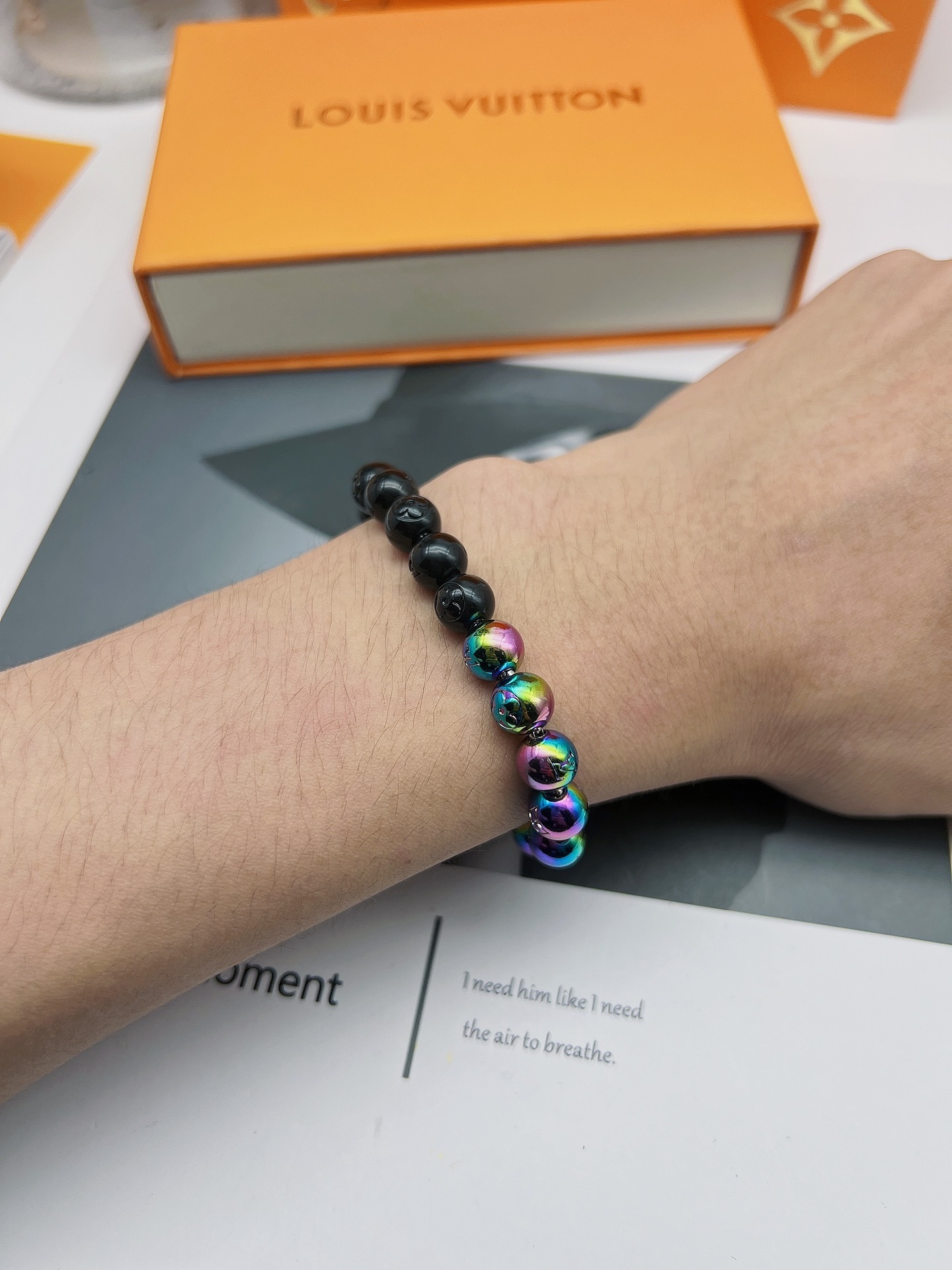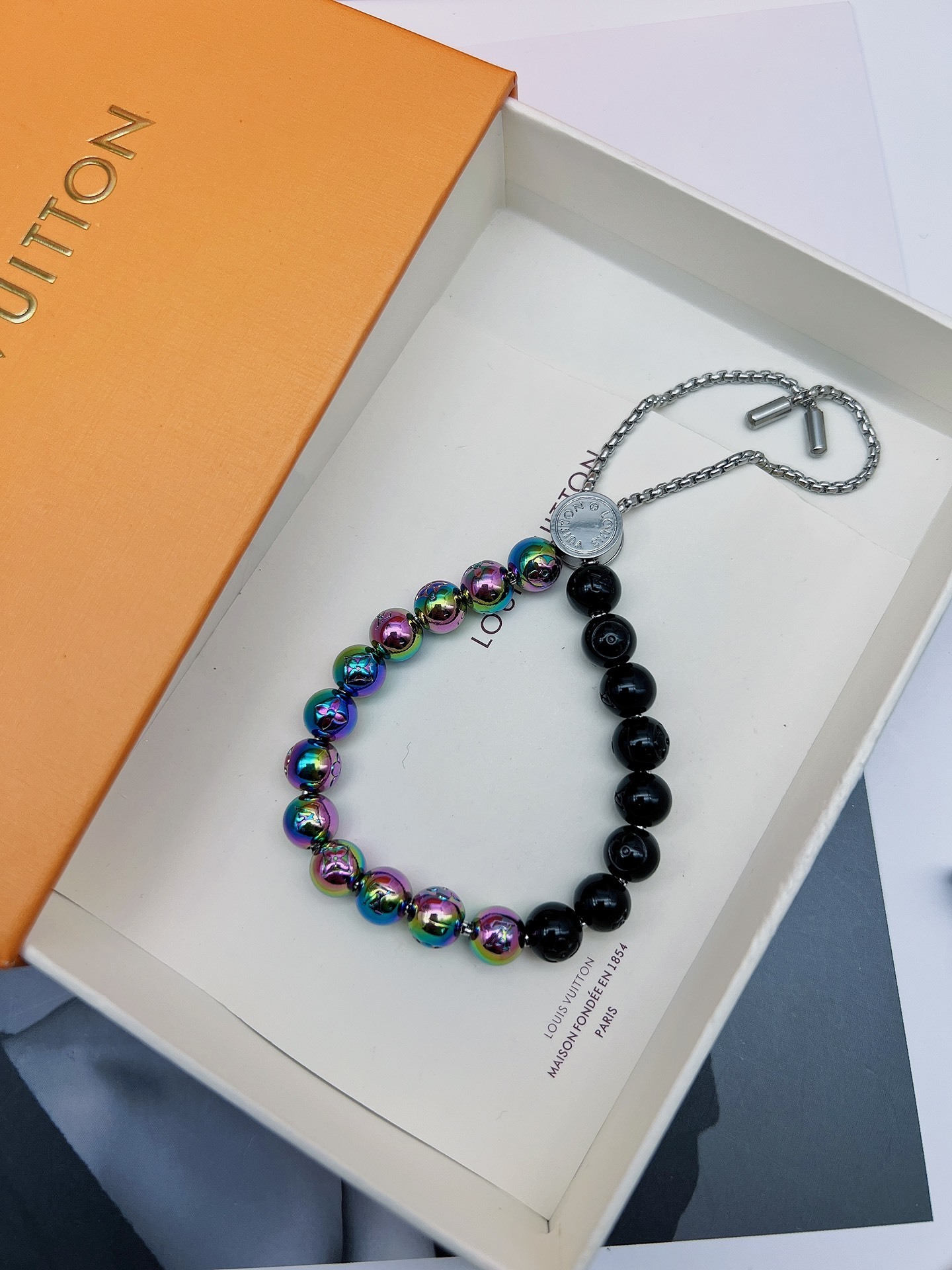 The bracelet features a captivating combination of smooth, black onyx beads and iridescent, multi-colored beads. The contrasting hues create a striking visual appeal, while the iconic Louis Vuitton charm adds a touch of brand recognition. The beads are strung on a durable, adjustable chain, ensuring a comfortable and secure fit for any wrist size.