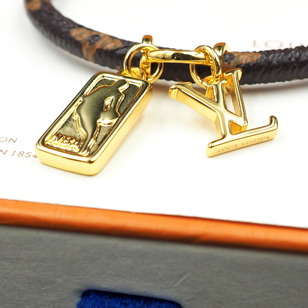 This premium bracelet features the signature Louis Vuitton monogram pattern on a durable, high-quality leather band. The gold-tone hardware, including the iconic LV charm and NBA logo, adds a touch of opulence and exclusivity. The secure clasp ensures a comfortable and confident fit, making it ideal for everyday wear or special occasions.