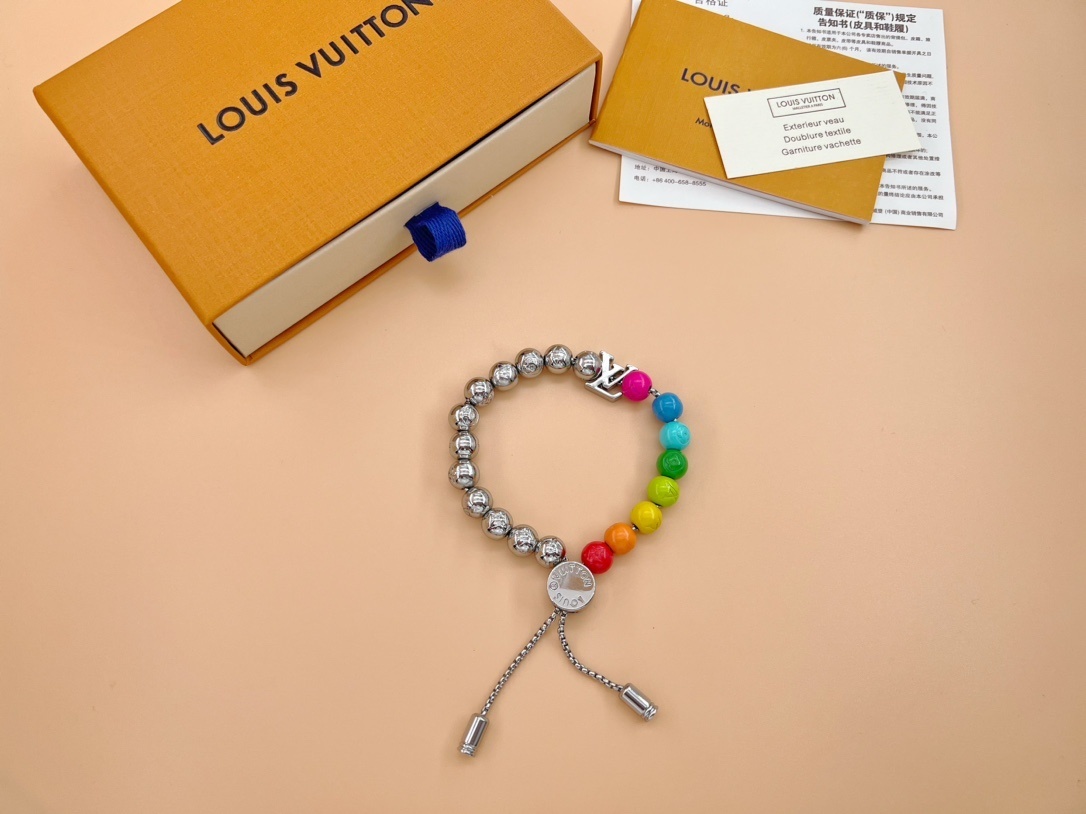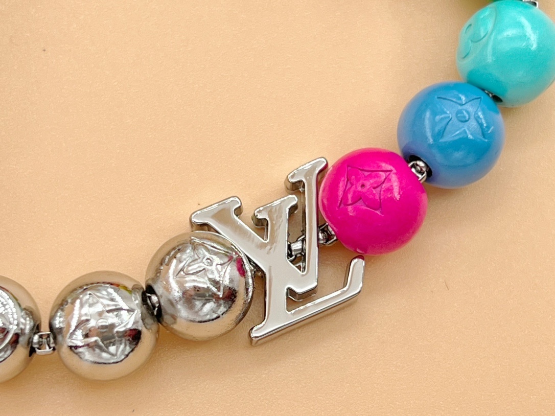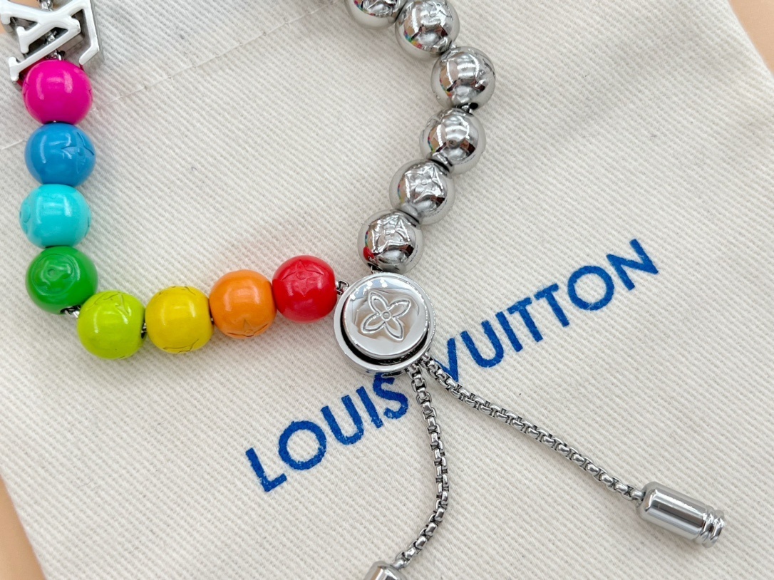 This bracelet showcases the iconic Louis Vuitton brand with its meticulous attention to detail and high-quality materials. The combination of silver-tone beads and rainbow-colored charms creates a playful yet sophisticated look.