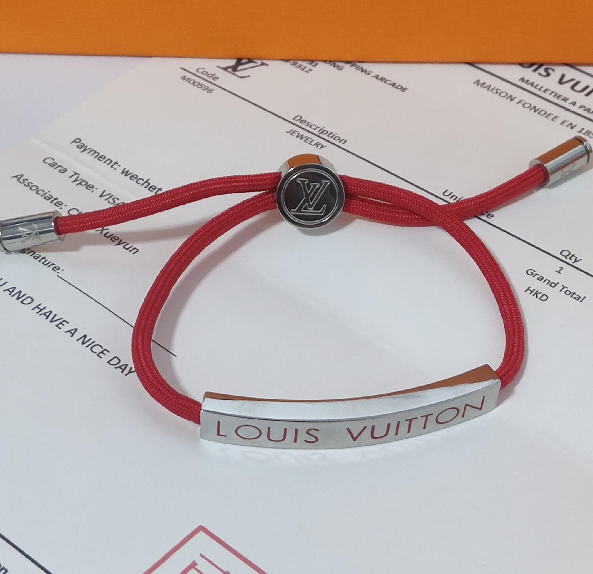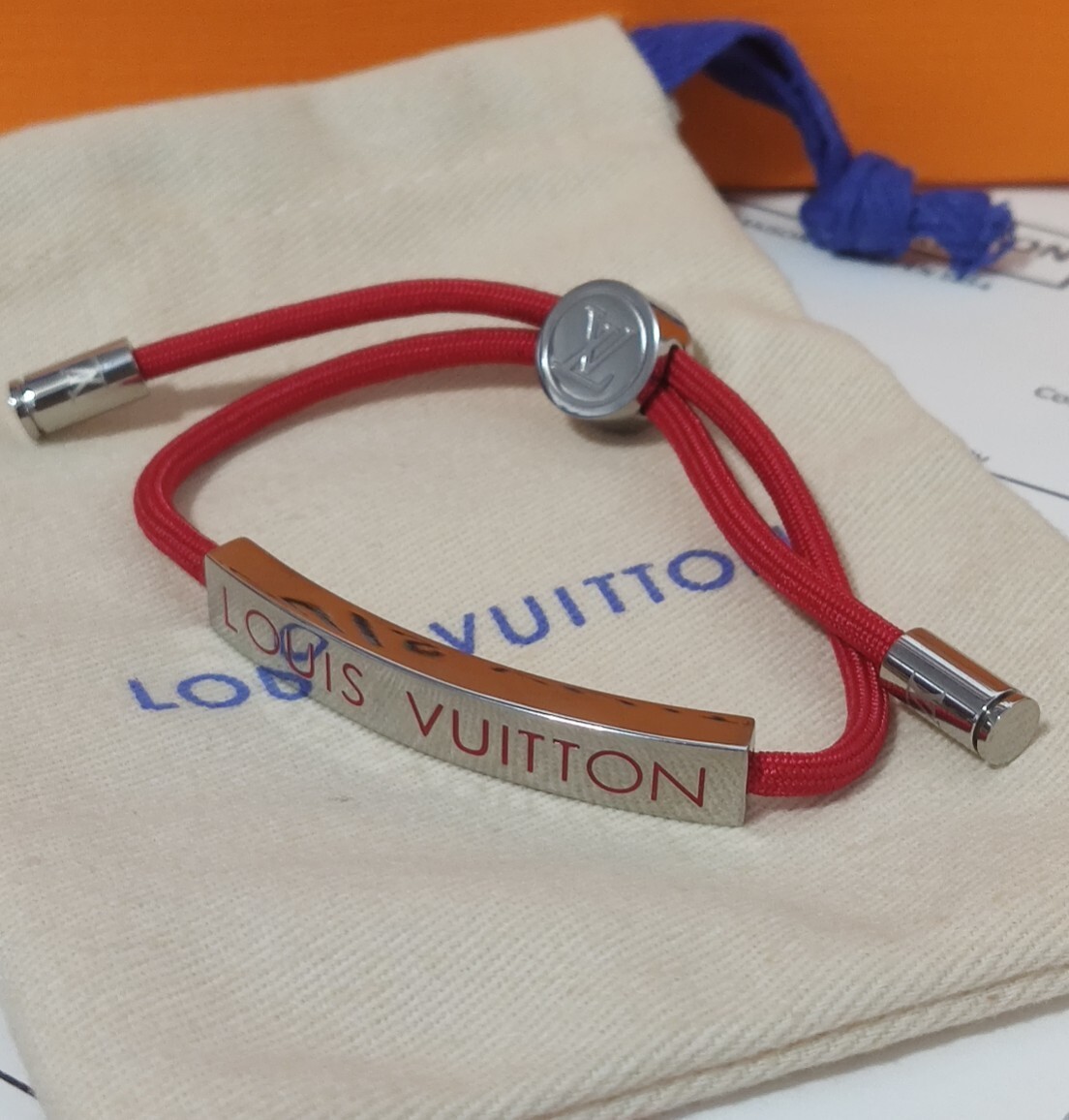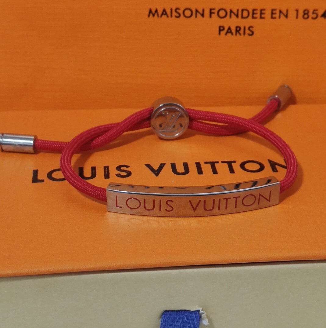This premium bracelet features a vibrant red cord, meticulously braided for durability and comfort. The centerpiece is a sleek metal plate adorned with the iconic Louis Vuitton signature, showcasing your impeccable taste. The adjustable design ensures a perfect fit for any wrist size.