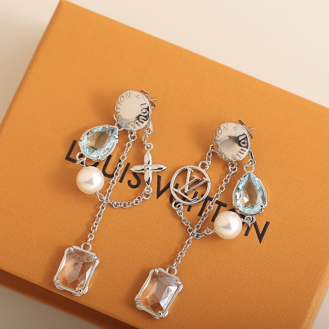 Crafted from high-quality silver, these earrings are designed to withstand the test of time. The silver is polished to a brilliant shine, reflecting light and enhancing the beauty of the gemstones and pearls. The pearls are carefully chosen for their smooth surface and iridescent luster, adding a touch of classic elegance to the design. The gemstones are securely set in place, ensuring that they remain in perfect condition for years to come. These earrings are a true investment in style and quality, reflecting Louis Vuitton's dedication to excellence.