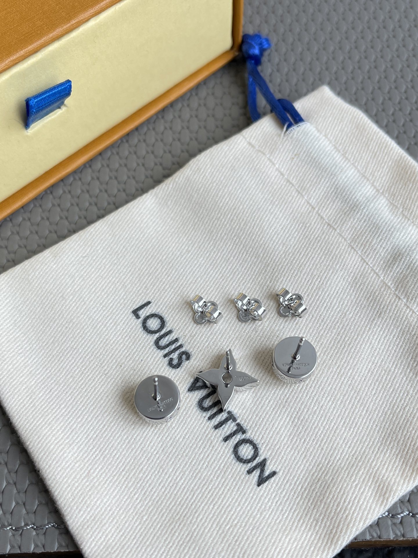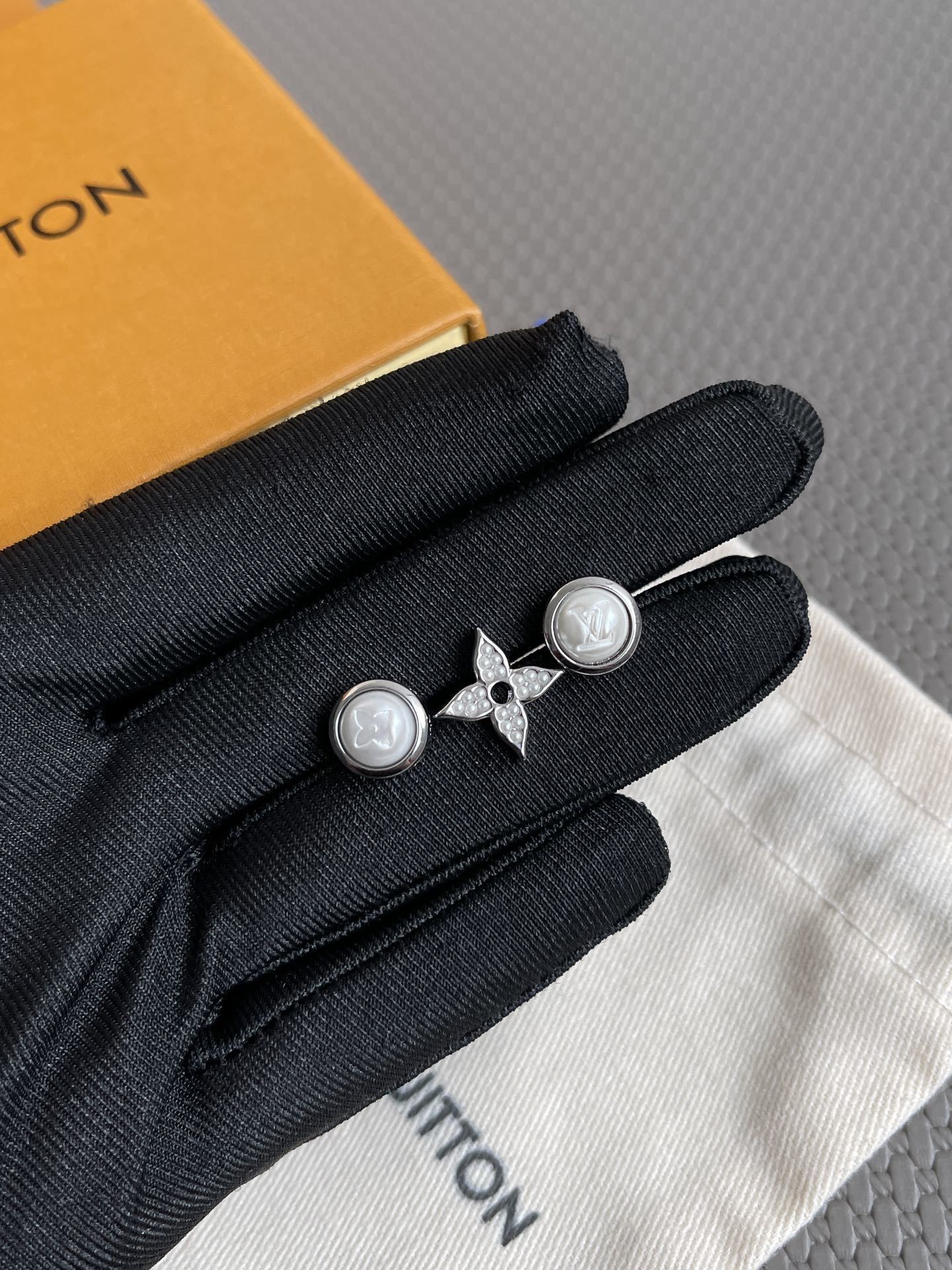 - Two stud earrings: One features the iconic LV logo encased in a pearl-like orb, while the other showcases a delicate floral motif.