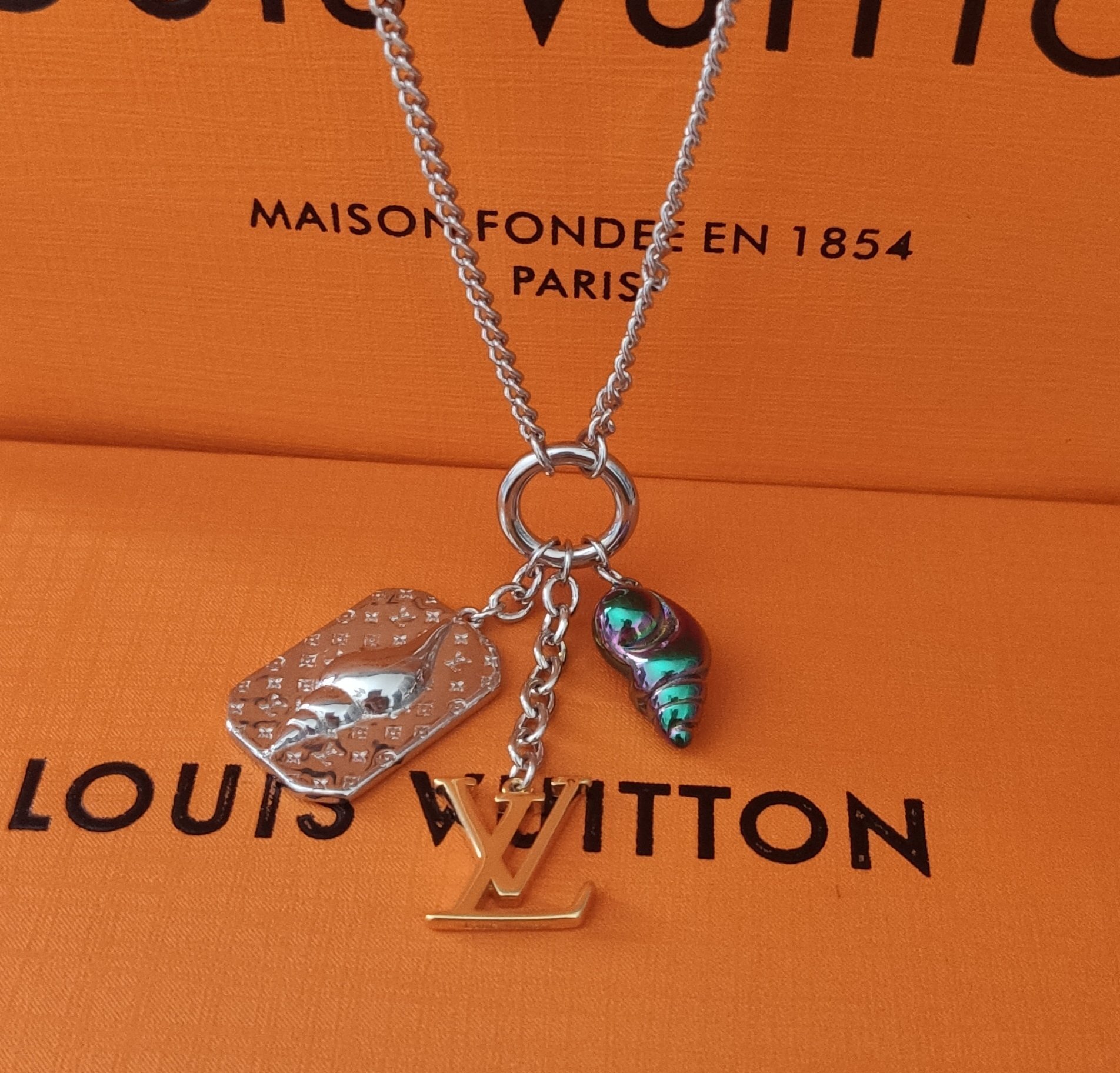 The necklace is made of high-quality sterling silver, gold-tone metal, and a durable, lightweight material for the iridescent green shell. The chain and silver shell are crafted from sterling silver, while the LV logo charm is made from gold-tone metal. The iridescent green shell is designed to capture and reflect light, creating a beautiful effect.