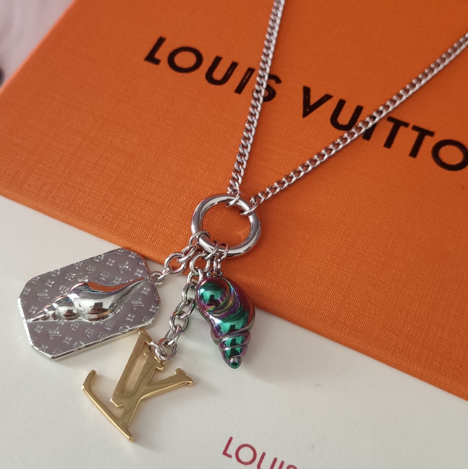 Louis Vuitton Silver Shell Necklace - Elevate your jewelry collection with the exquisite Louis Vuitton Silver Shell Charm Necklace. This stunning piece combines the iconic luxury of Louis Vuitton with a playful, nautical-inspired design. The necklace features a delicate silver chain adorned with three unique charms: a silver shell embossed with the LV monogram, a golden LV logo, and an iridescent green shell that catches the light beautifully. Perfect for adding a touch of sophistication and whimsy to any outfit, this necklace is a must-have for fashion enthusiasts.