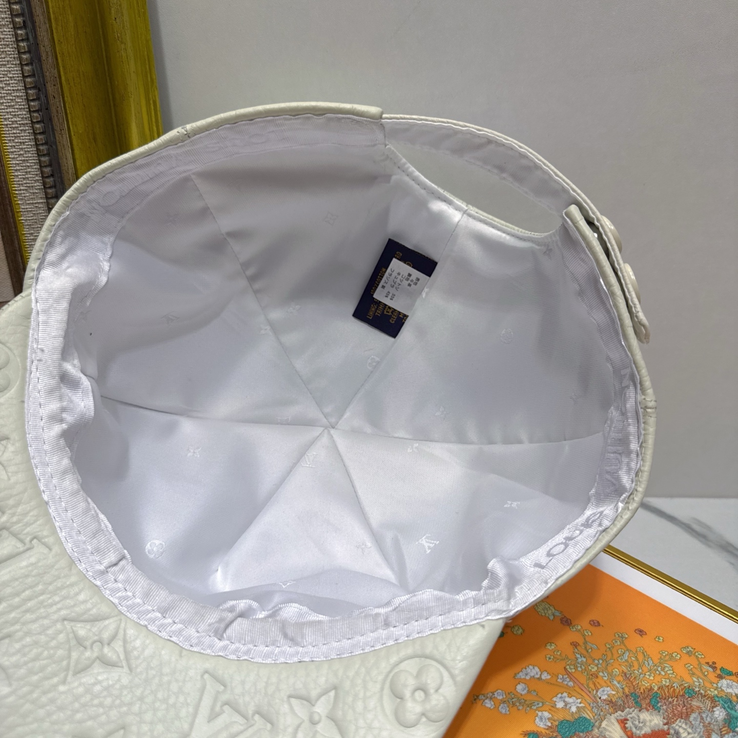 A: The cap is made from high-quality, supple white leather with the Louis Vuitton monogram embossed throughout.