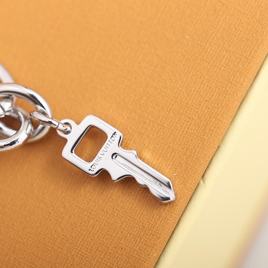 - Unique Design: Features a combination of chunky chains, delicate chains, signature logo charms, and a charming padlock detail.