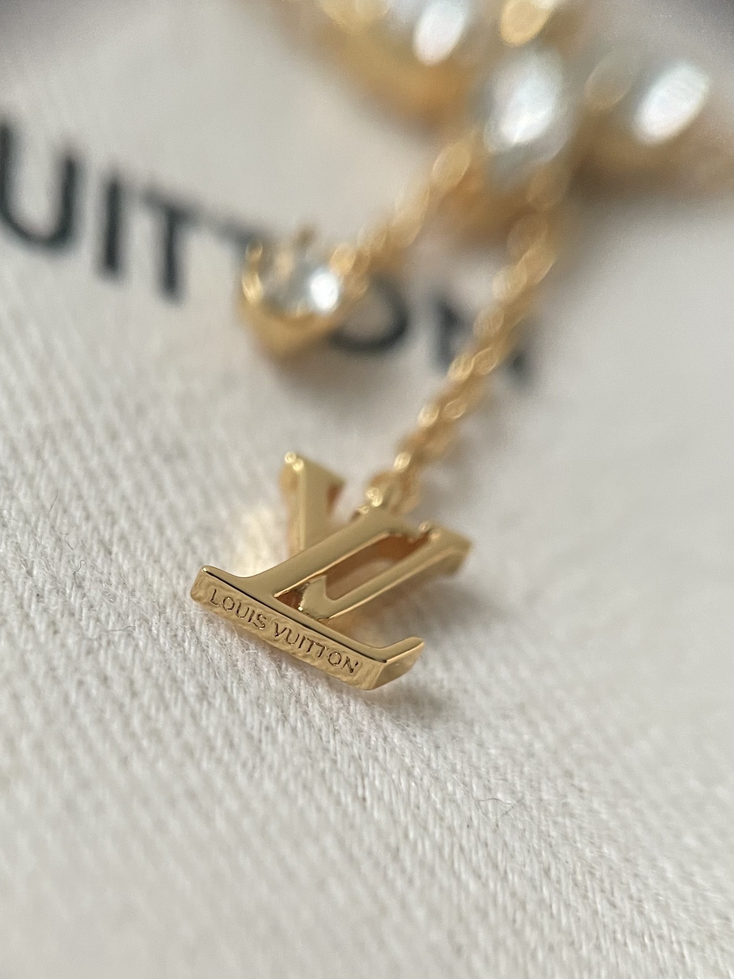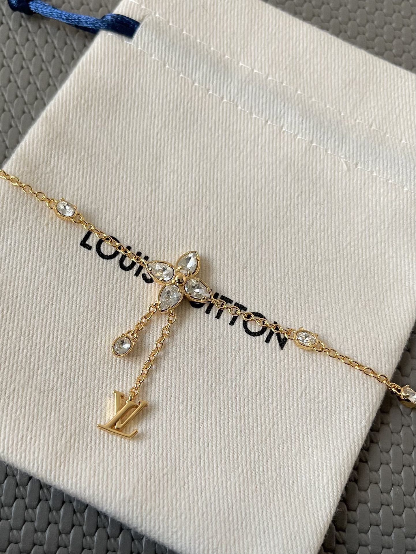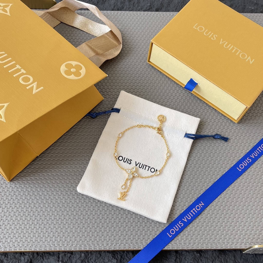 Our flower charm bracelet features a delicate gold-tone chain adorned with sparkling crystal accents. The centerpiece is a stunning flower charm, meticulously designed with intricate details. A signature LV charm dangles gracefully, adding a touch of luxury and brand recognition.