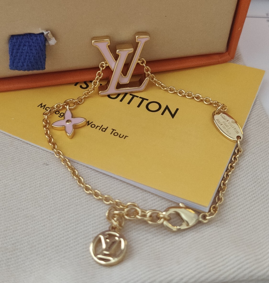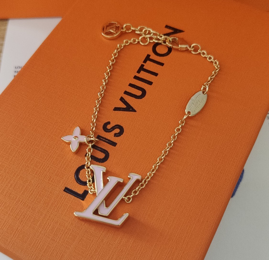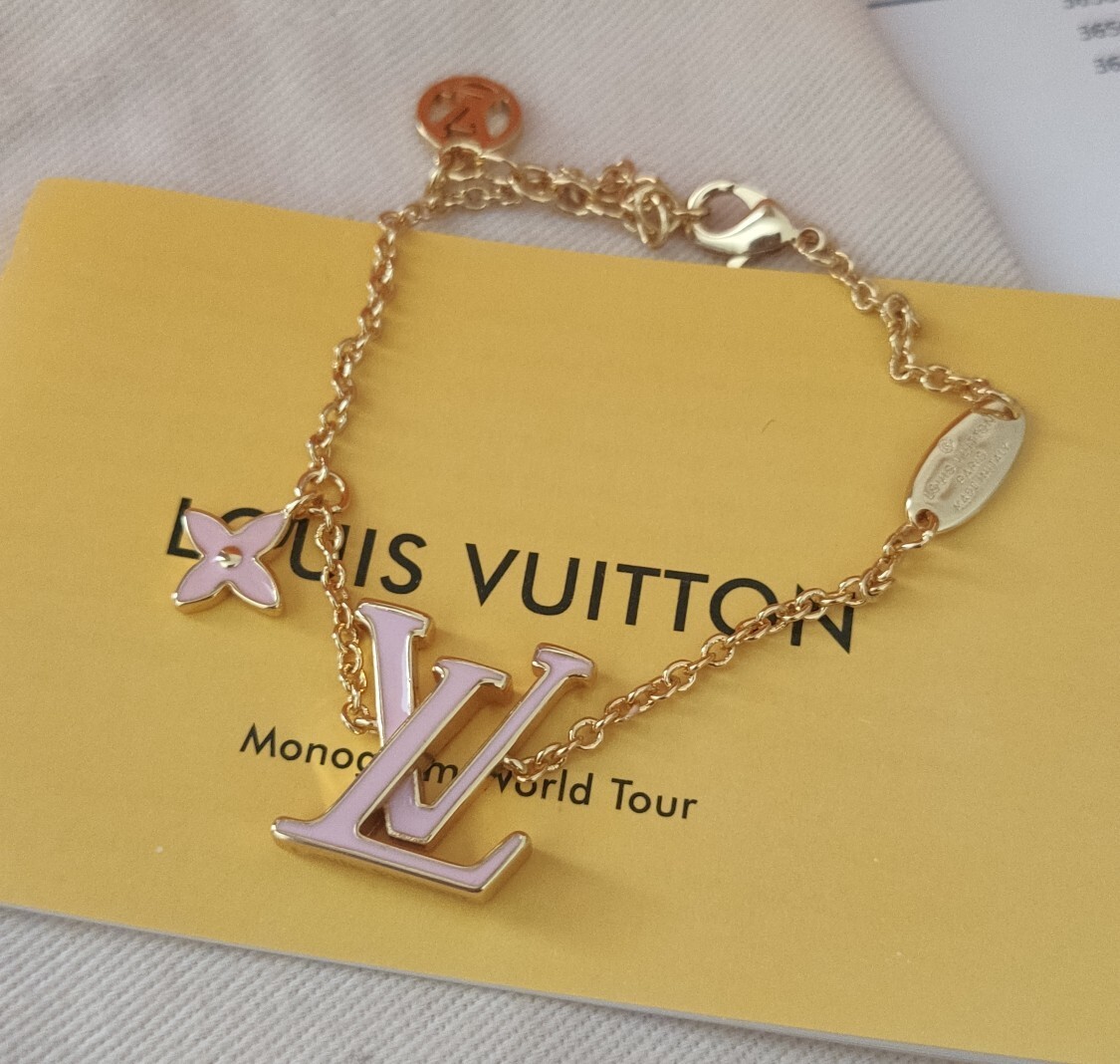 This bracelet features the iconic LV charm, finished in a lustrous gold that exudes elegance. A delicate pink flower charm adds a touch of femininity and charm. The adjustable chain ensures a comfortable and secure fit for any wrist size. The high-quality materials used in this bracelet guarantee its durability and longevity, allowing you to enjoy its beauty for years to come.