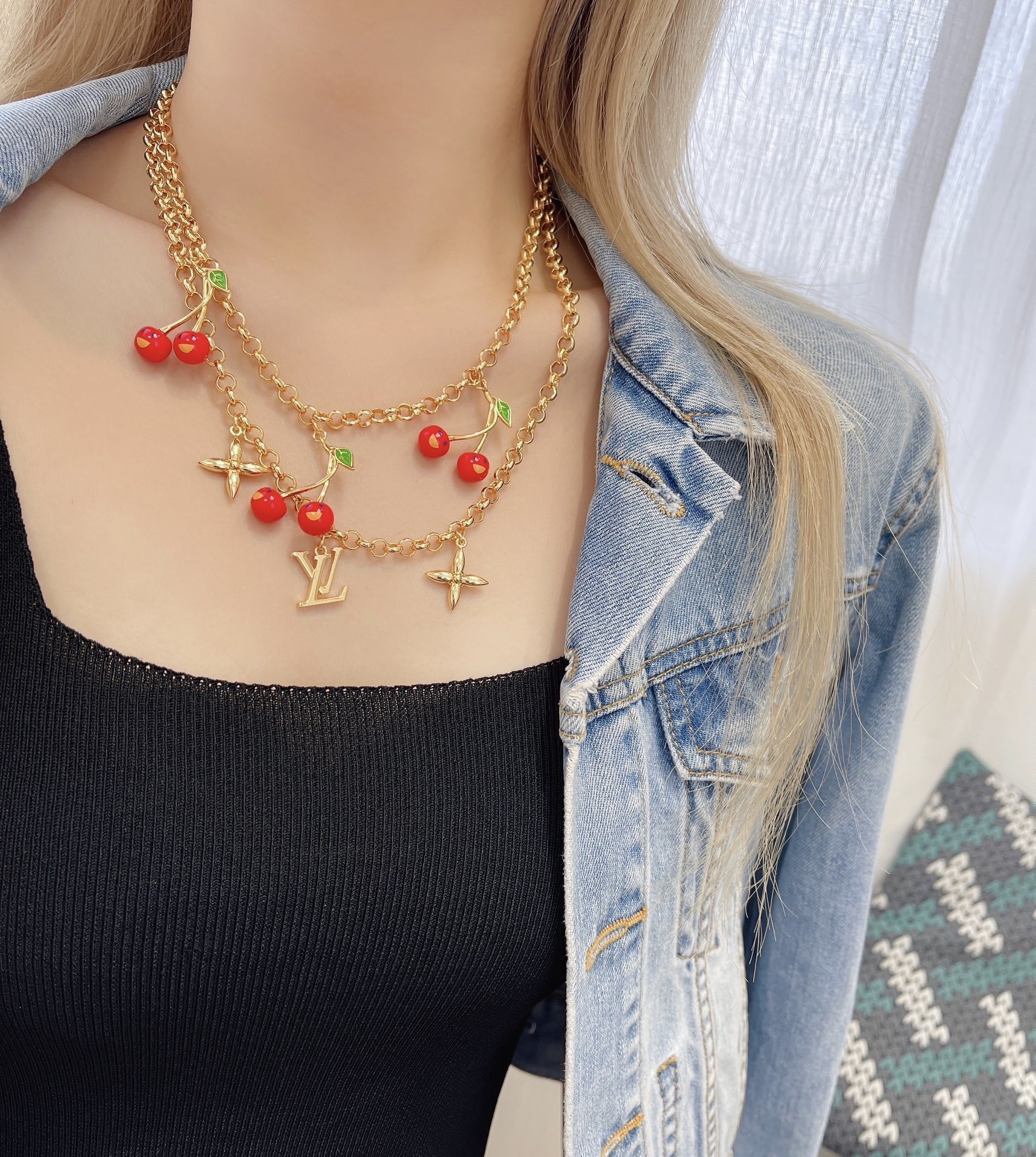 The necklace features a delicate gold chain with multiple strands, adorned with cherry charms and the signature LV logo. The combination of the classic gold and vibrant red cherries makes this necklace a versatile accessory that can be worn for both casual and formal occasions. The attention to detail and high-quality craftsmanship make this necklace a must-have for any fashion enthusiast.