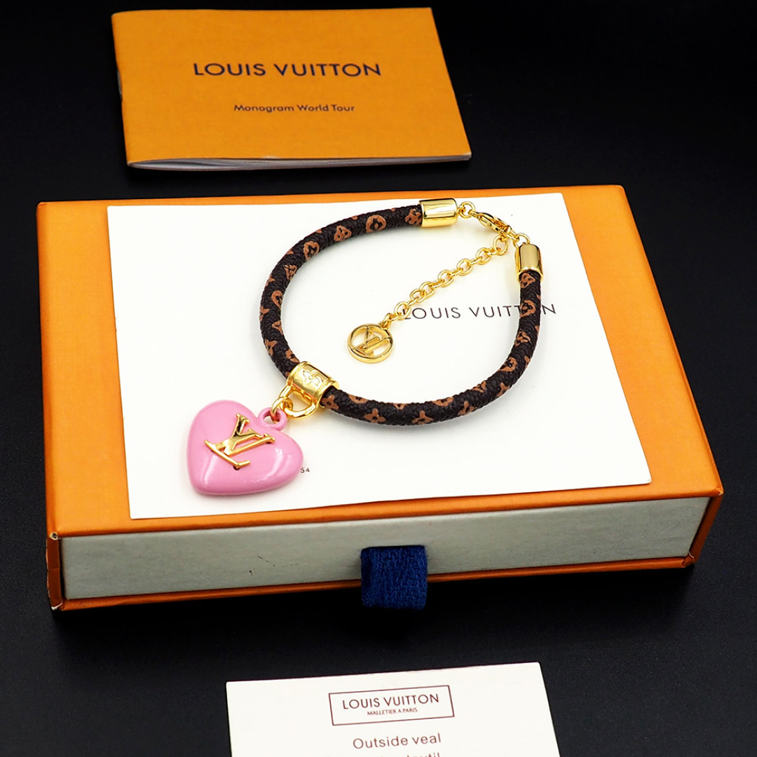 This LV Heart Charm Bracelet is more than just a piece of jewelry; it's a statement of your refined taste and appreciation for luxury. It's the perfect way to add a touch of glamour to your everyday look or to complete your ensemble for a special event. The adjustable design ensures a comfortable fit, while the iconic design is sure to turn heads and spark conversations.