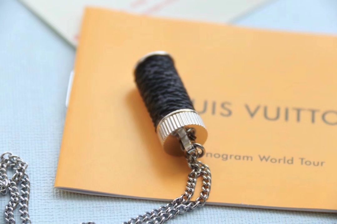 LV Silver Cylinder Pendant Necklace - The Louis Vuitton Silver Cylinder Pendant Necklace is a statement piece that seamlessly blends luxury and edgy design. This exquisite necklace features a sleek, silver-tone chain and a distinctive cylinder-shaped pendant. The pendant is adorned with embossed black leather, adding a touch of sophistication and texture to the overall design. The LV logo is subtly engraved on the pendant, showcasing the brand's iconic heritage. This necklace is more than just an accessory; it's a symbol of style and status.