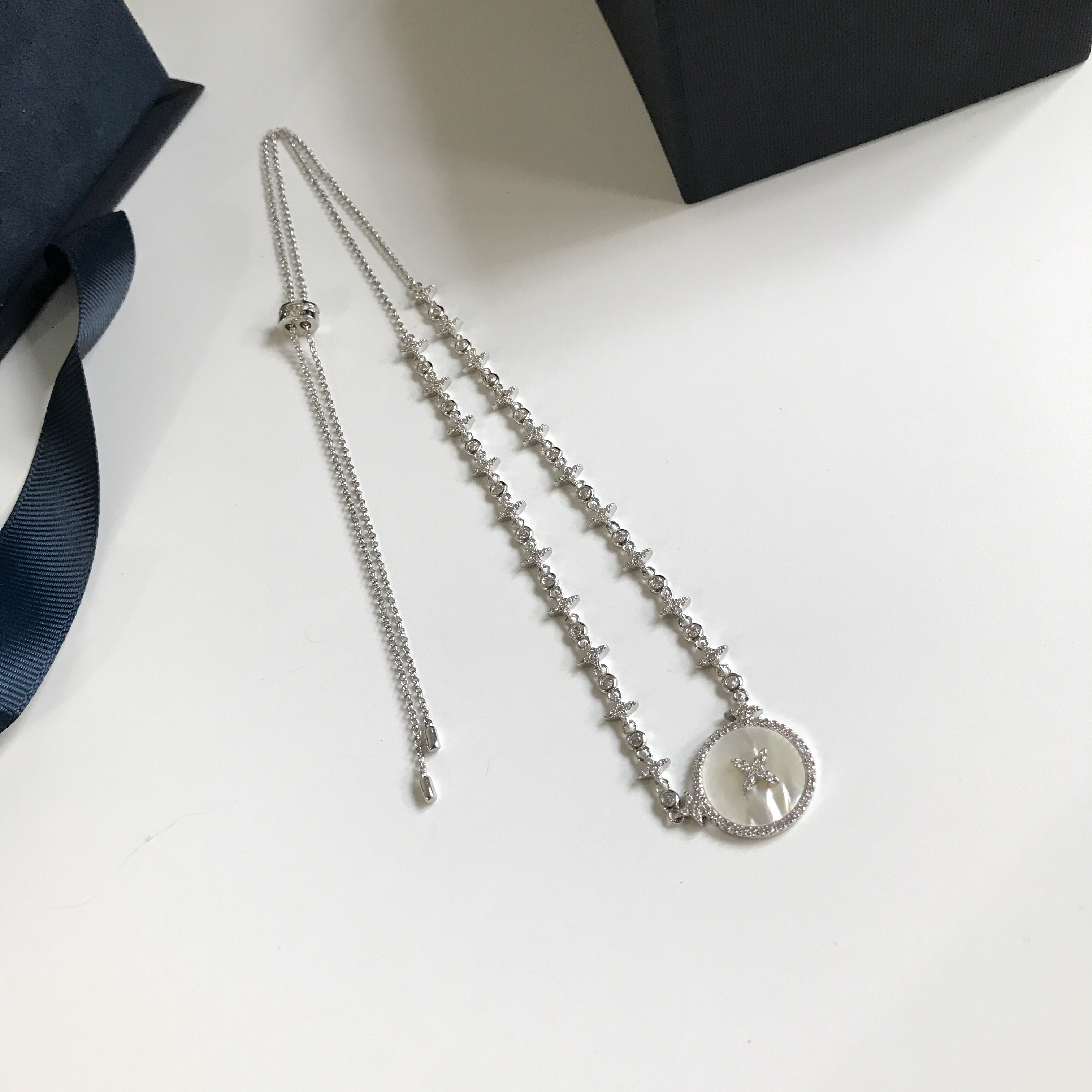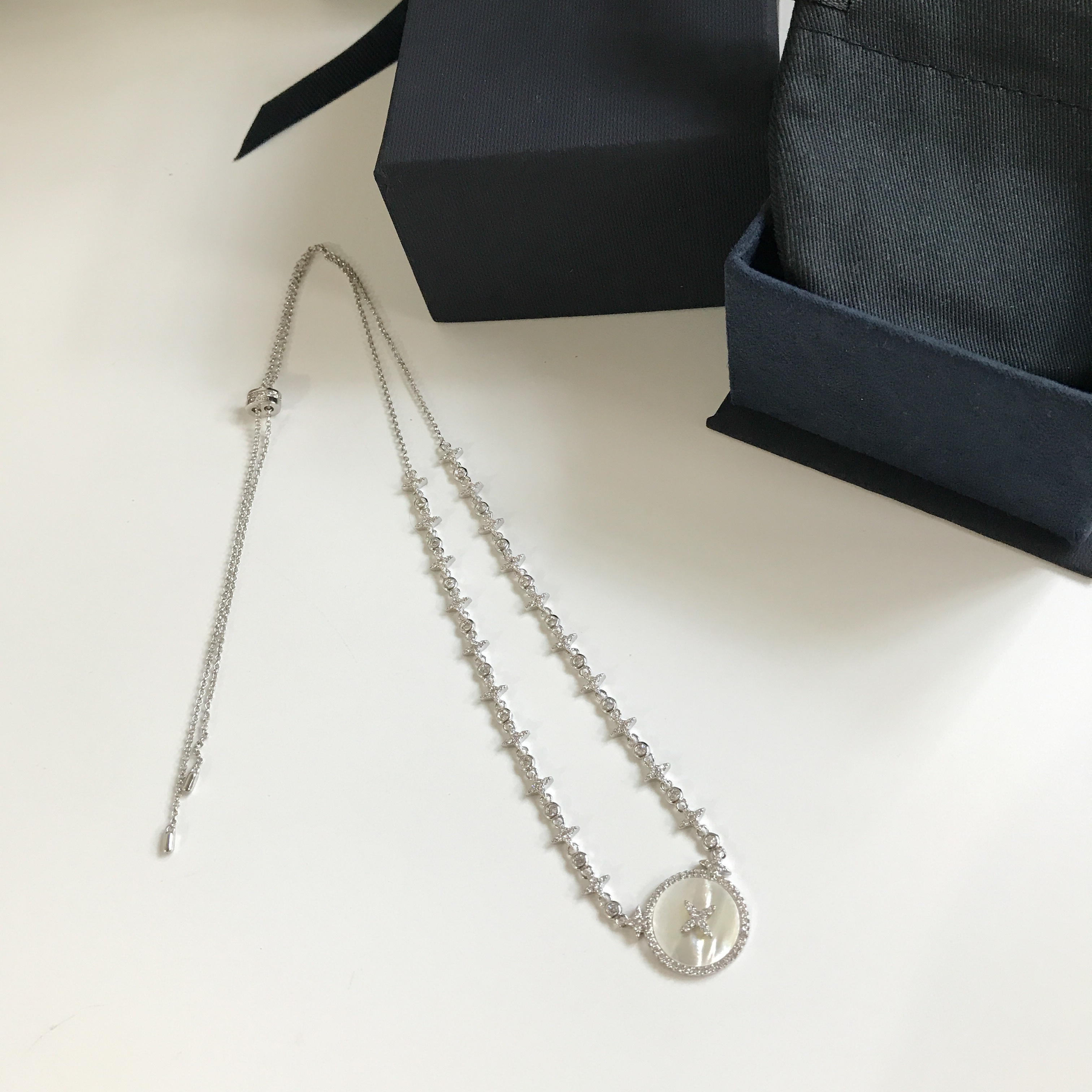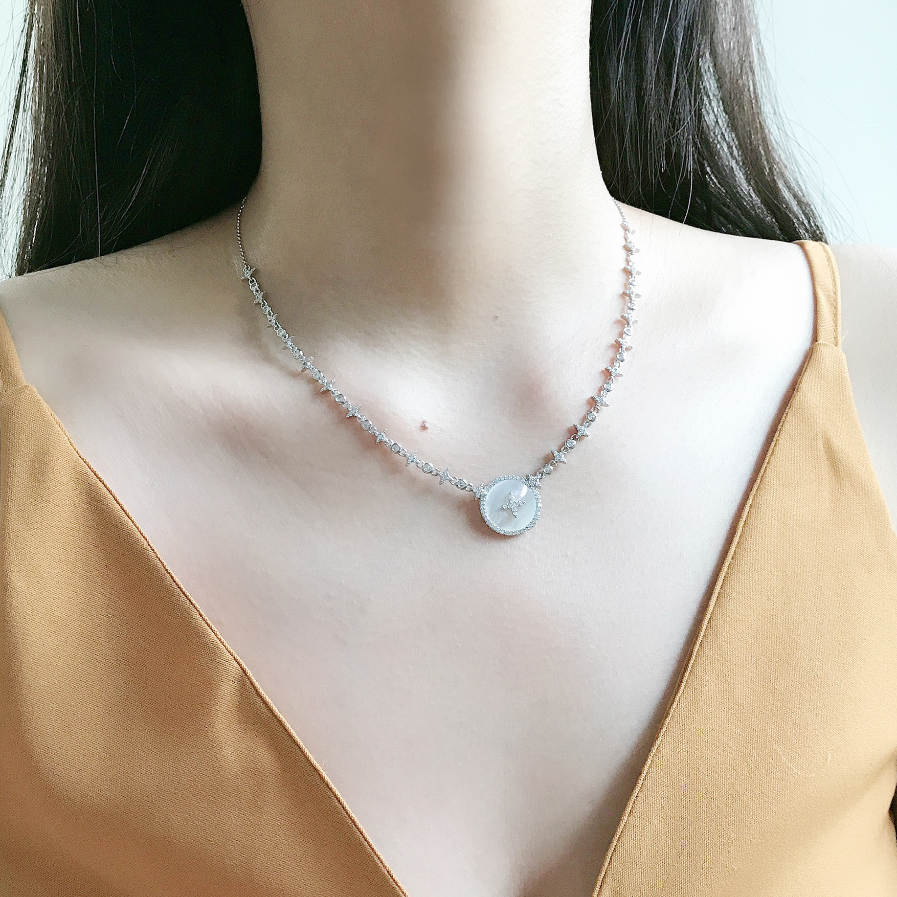 The necklace chain is crafted from high-quality silver, providing a durable and elegant foundation for the pendant. The fine links ensure a comfortable fit, while the adjustable clasp allows you to customize the length to suit your neckline. The silver setting complements the mother-of-pearl and crystals, creating a harmonious blend of materials that exudes luxury and sophistication. This necklace is not only a beautiful accessory but also a durable and long-lasting piece that you can cherish for years to come.