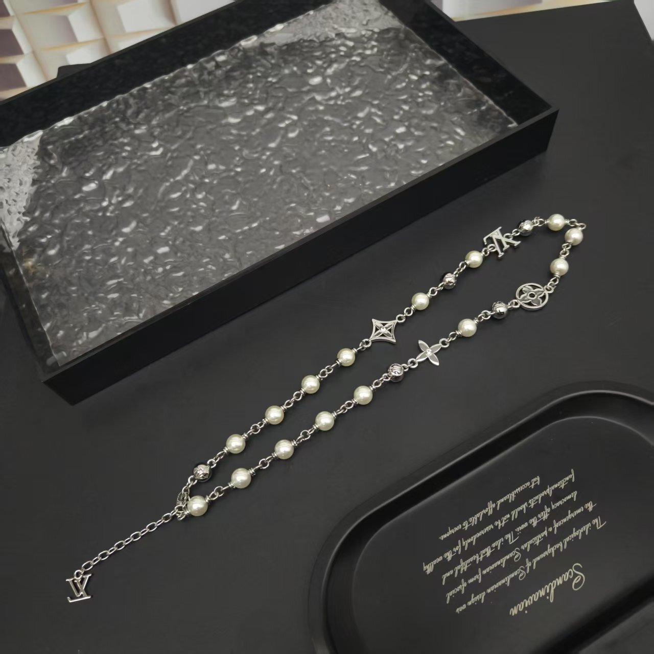 To keep your LV Silver Pearl Monogram Necklace looking its best, it's essential to follow a few simple care guidelines. Avoid exposing the necklace to harsh chemicals, such as perfumes, hairsprays, and cleaning agents, as these can damage the pearls and silver-tone metal. When you're not wearing the necklace, store it in a soft pouch or jewelry box to prevent scratches and tangling. Clean the necklace regularly with a soft, dry cloth to remove any dirt or oils. For stubborn stains, you can use a mild soap and water solution, but be sure to dry the necklace thoroughly afterward. Proper care will ensure that your LV Silver Pearl Monogram Necklace remains a cherished piece of jewelry for years to come.