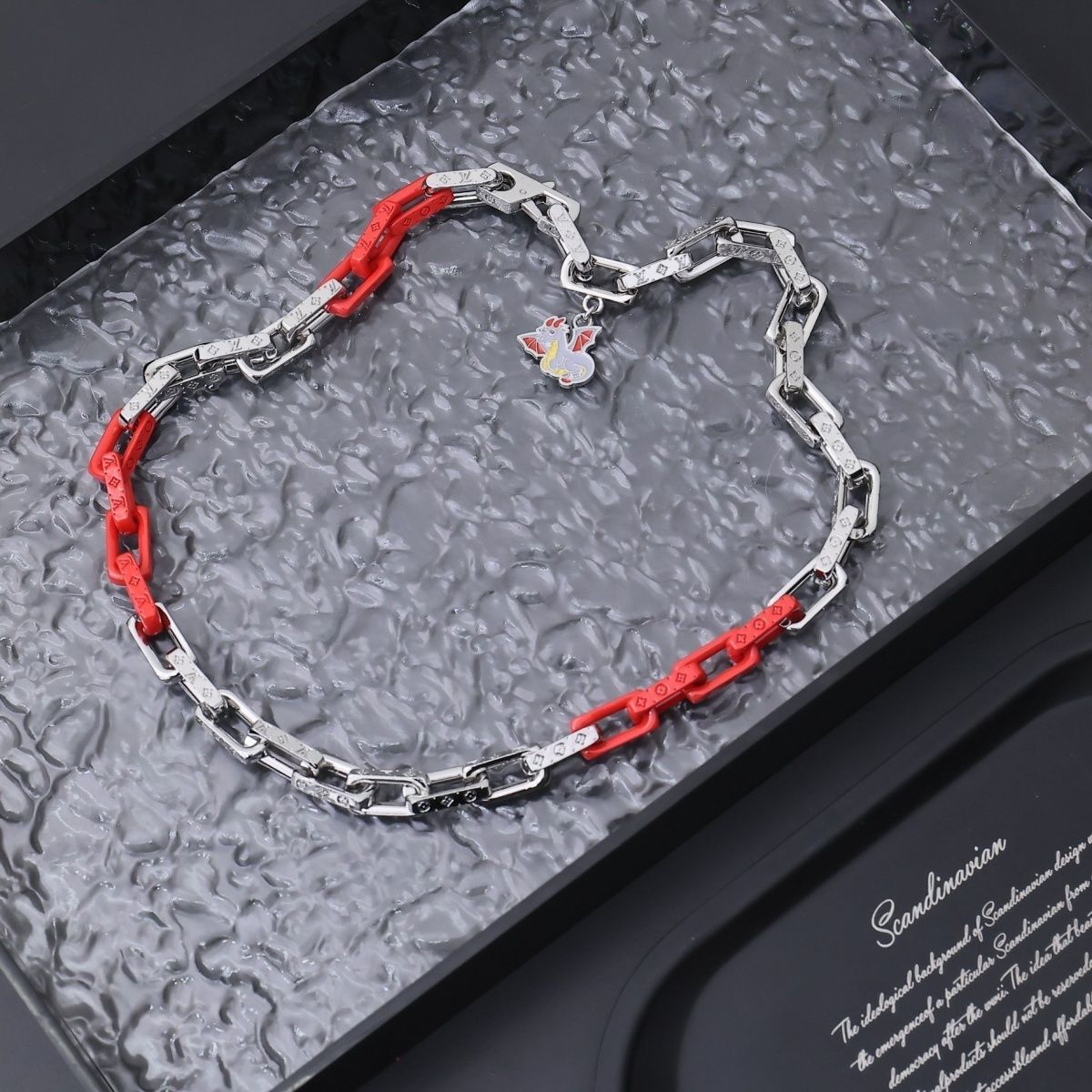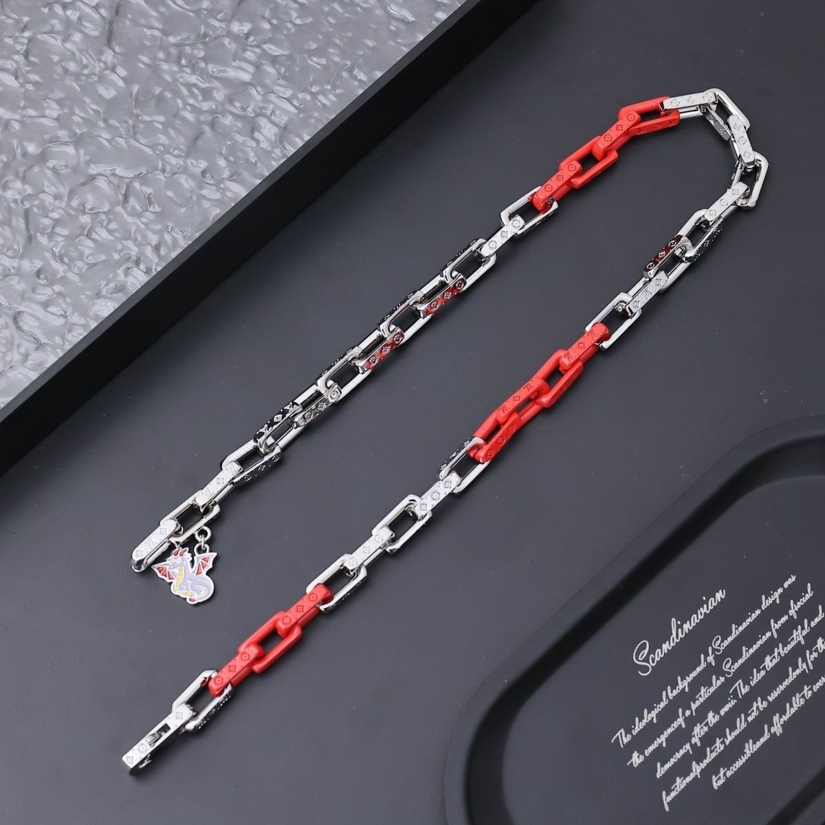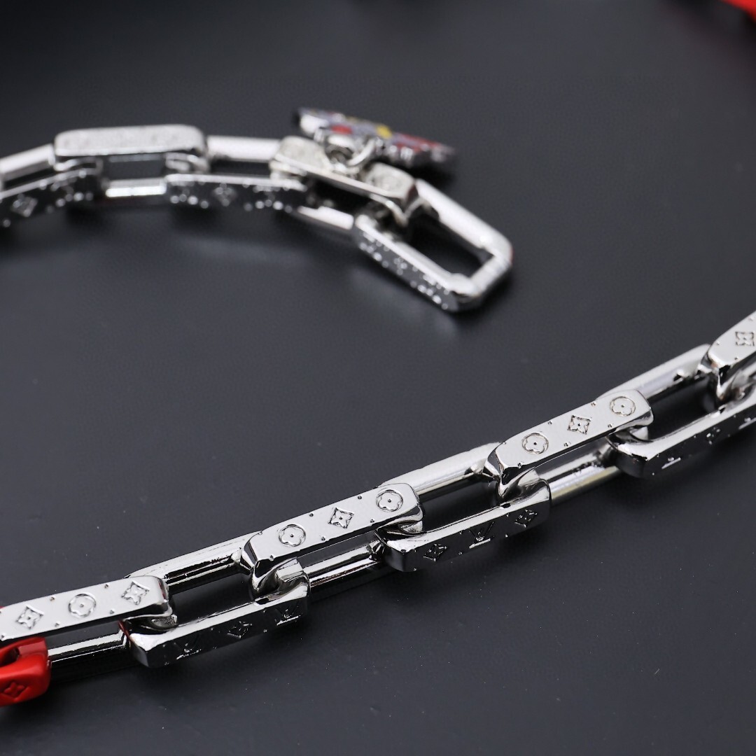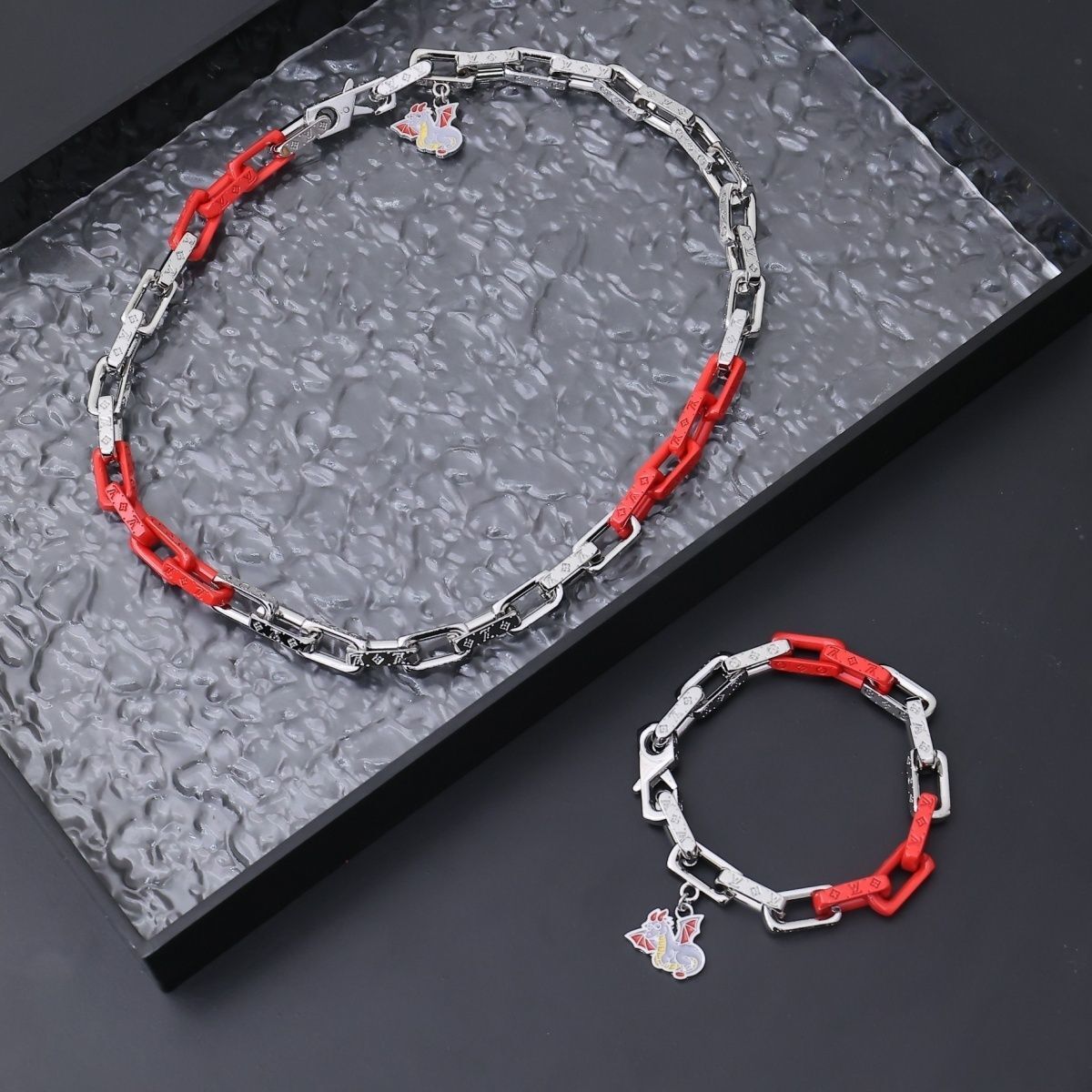 LV Silver Red Chain Set - LV Silver & Red Chain Necklace & Bracelet
