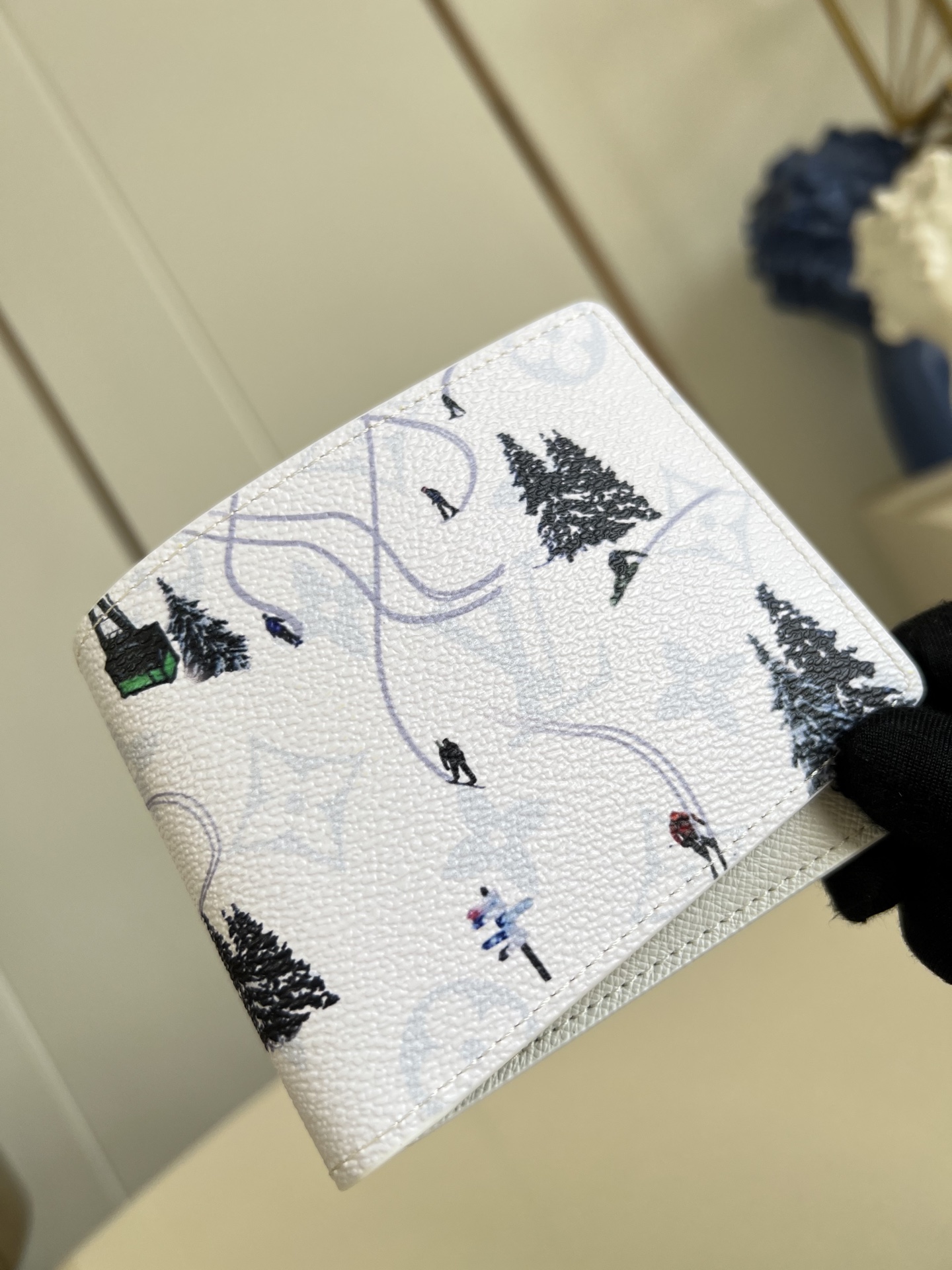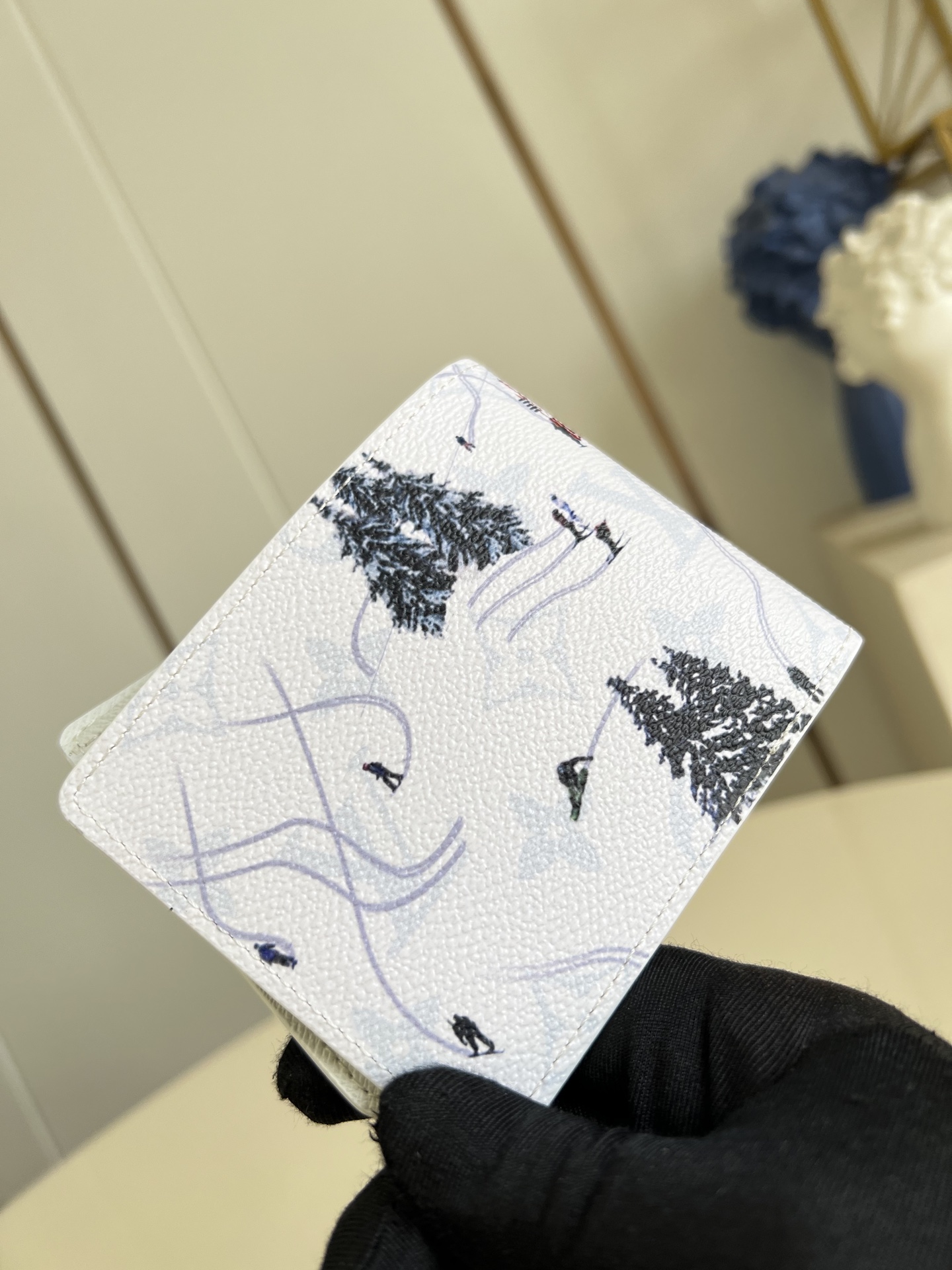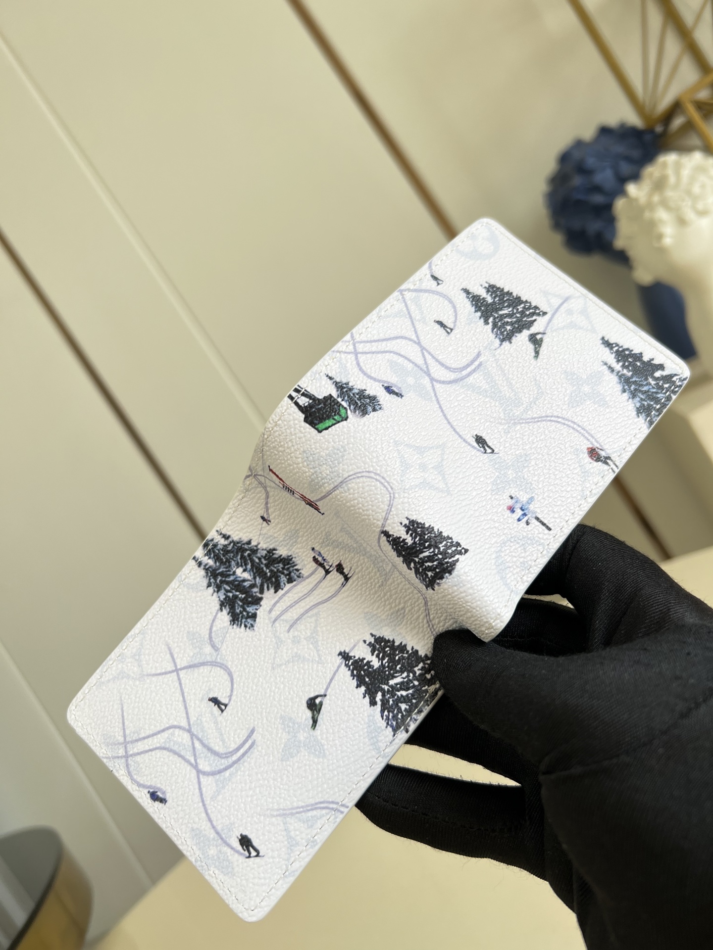 LV Ski Print Wallet - Experience the epitome of luxury and winter charm with the Louis Vuitton Ski Print Wallet. This limited edition cardholder is crafted from premium leather, showcasing a unique ski-themed design that captures the spirit of alpine adventures. The crisp white backdrop is adorned with playful skiers, snow-covered trees, and intricate ski lift details, making it a standout accessory for the discerning individual. This exquisite piece is more than just a wallet; it's a statement of style and sophistication. It combines the iconic Louis Vuitton craftsmanship with a whimsical, seasonal motif.
