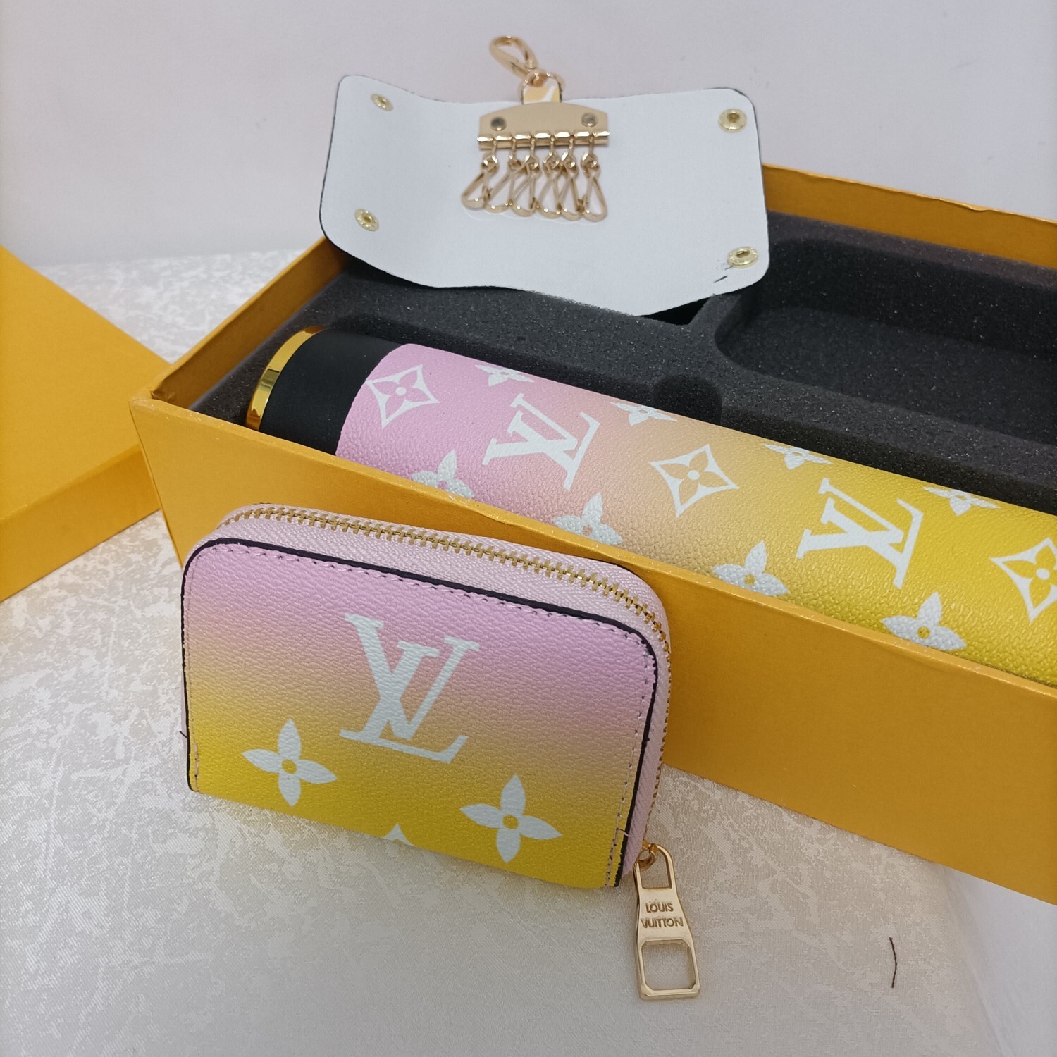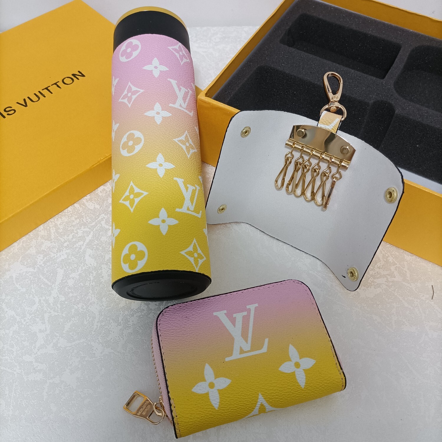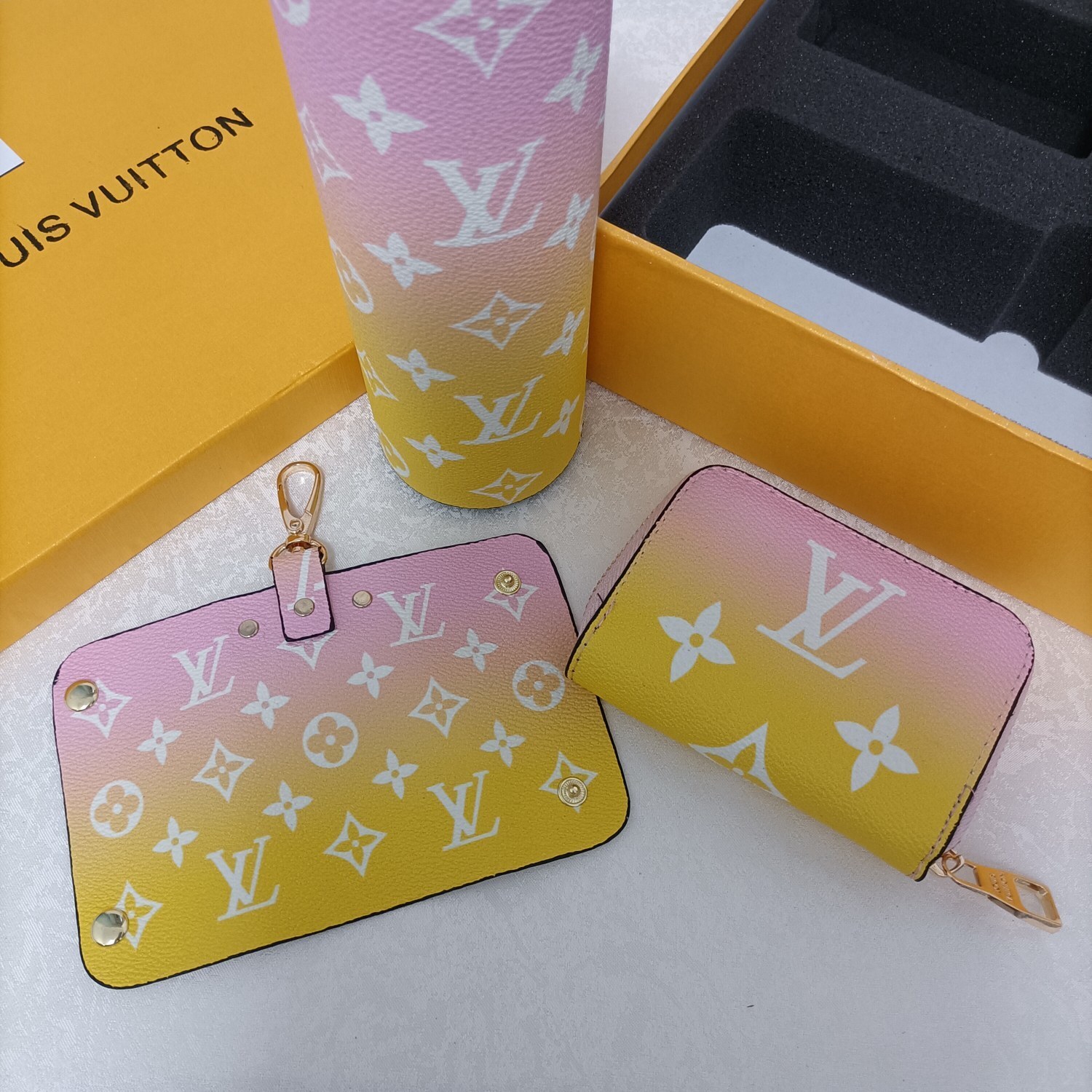 LV Sunrise Gradient Gift Set - The Louis Vuitton Sunrise Gradient Gift Set is a luxurious and stylish collection featuring a thermos, keychain, and wallet, all adorned with the iconic LV monogram in a beautiful sunrise gradient. This set is perfect for those who appreciate high-end fashion and functional accessories. The gradient design transitions from a soft pink at the top to a vibrant yellow at the bottom, creating a visually stunning effect that is sure to turn heads. The LV Sunrise Gradient Gift Set is more than just a collection of accessories; it's a statement of sophistication and impeccable taste. It makes an excellent gift for yourself or a loved one who appreciates the finer things in life.
