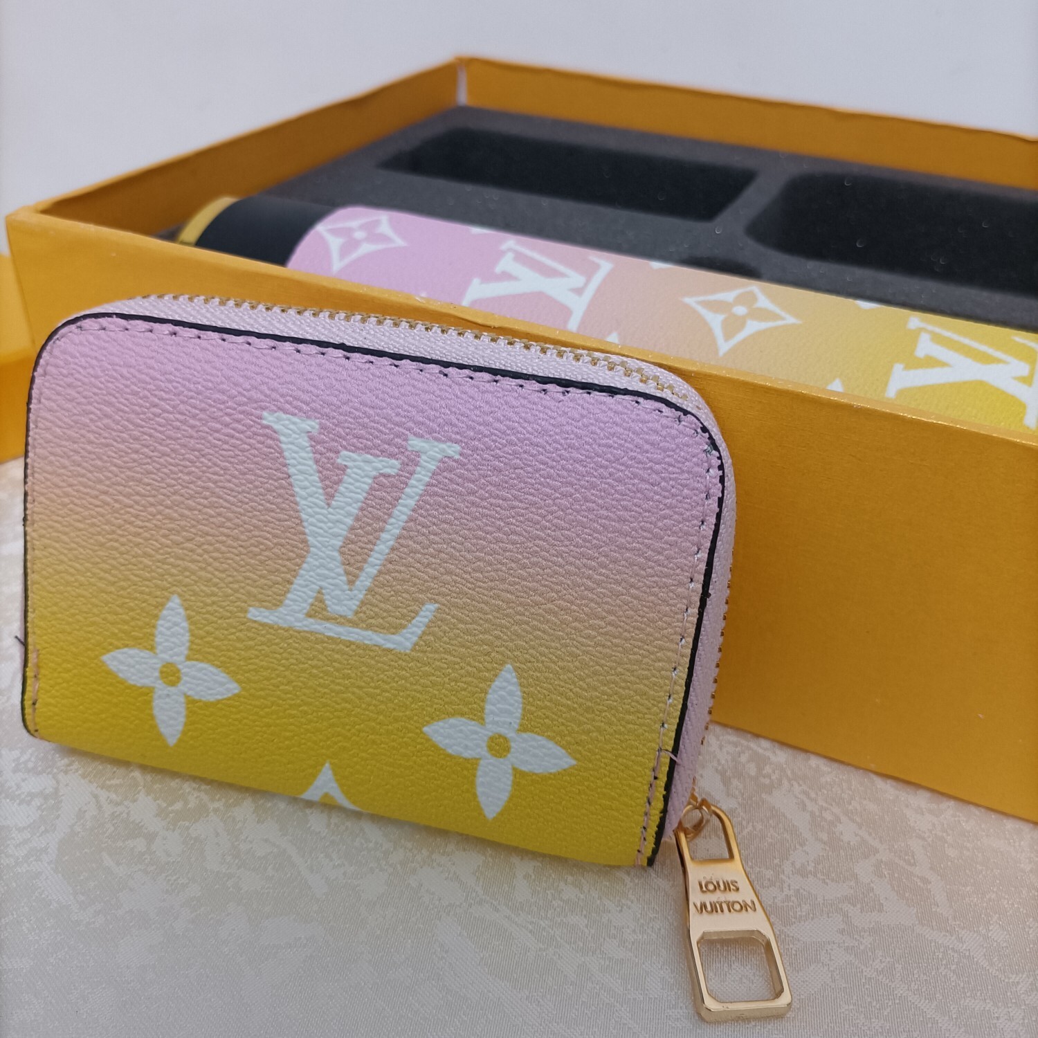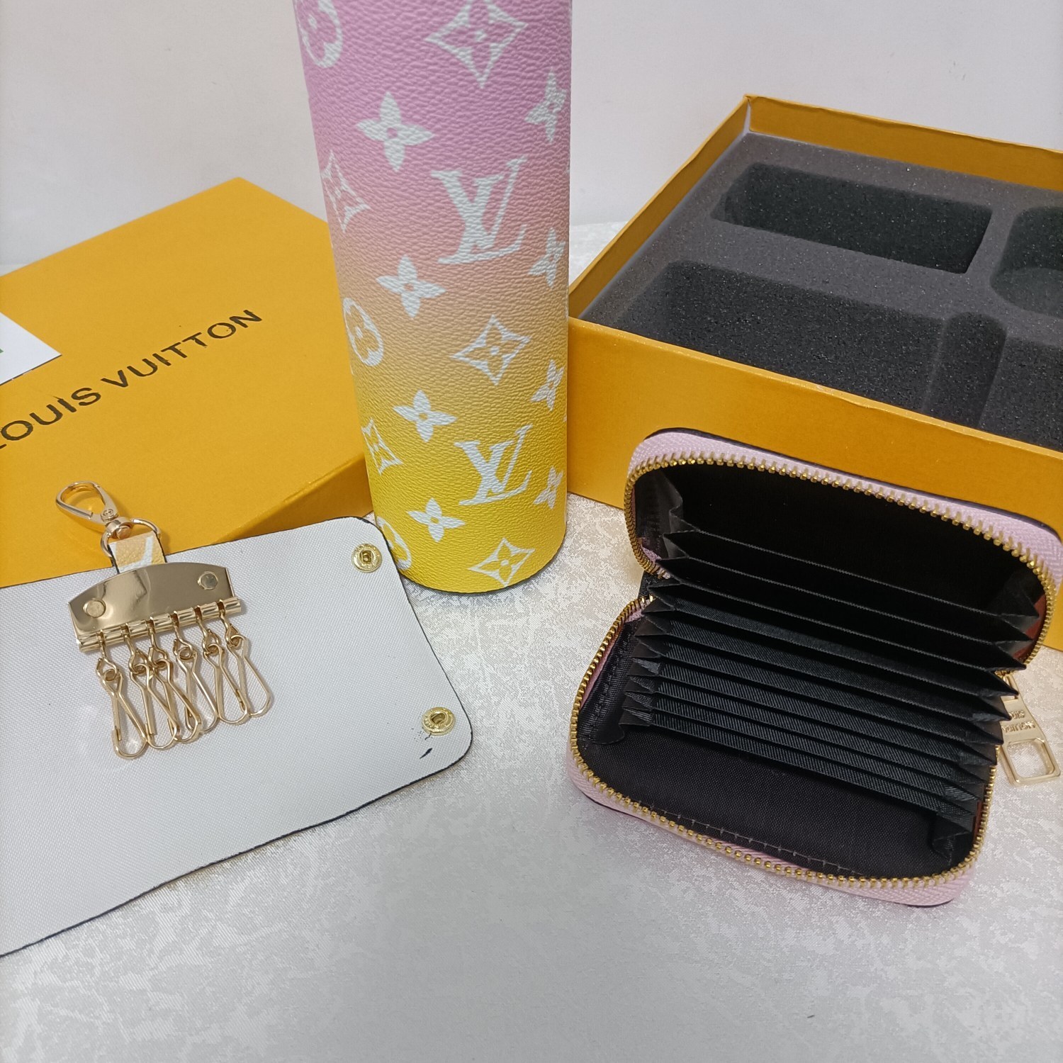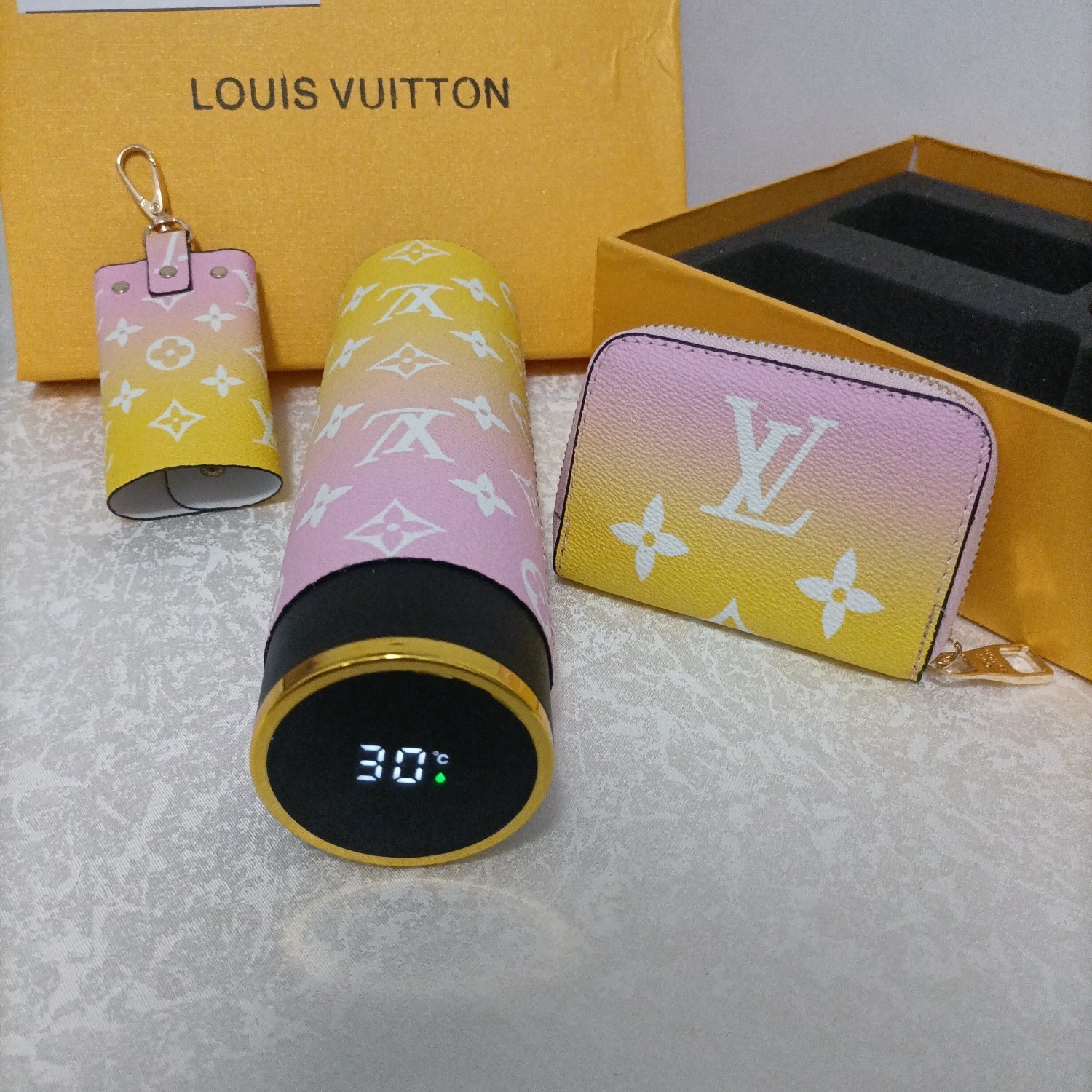 LV Sunrise Gradient Gift Set - The Louis Vuitton Sunrise Gradient Gift Set is a luxurious and stylish collection featuring a thermos, keychain, and wallet, all adorned with the iconic LV monogram in a beautiful sunrise gradient. This set is perfect for those who appreciate high-end fashion and functional accessories. The gradient design transitions from a soft pink at the top to a vibrant yellow at the bottom, creating a visually stunning effect that is sure to turn heads. The LV Sunrise Gradient Gift Set is more than just a collection of accessories; it's a statement of sophistication and impeccable taste. It makes an excellent gift for yourself or a loved one who appreciates the finer things in life.