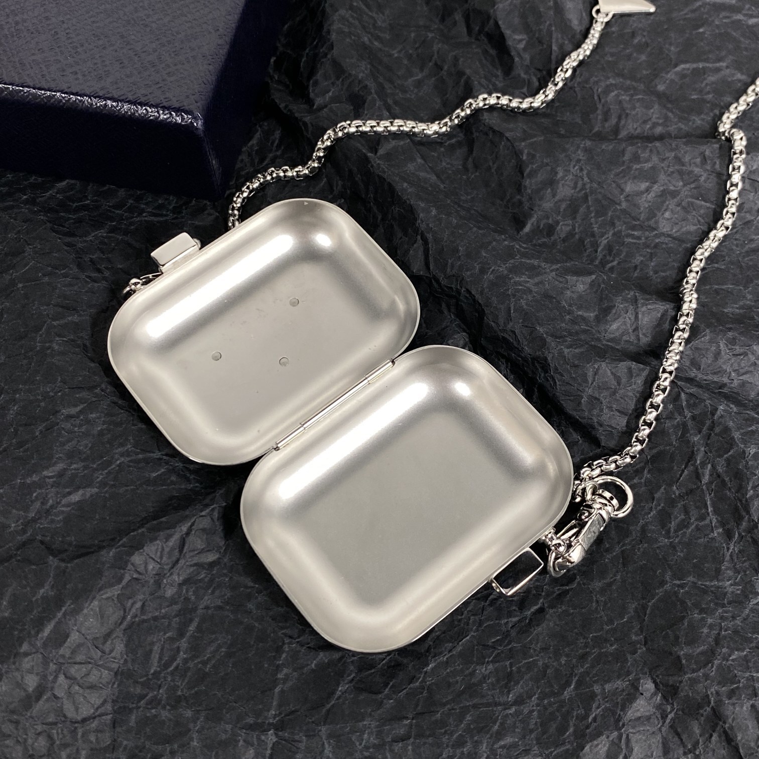 When not in use, store your Prada Silver Metal AirPods Pro Case Necklace in a cool, dry place, away from direct sunlight and extreme temperatures. Consider storing it in a dust bag or jewelry box to protect it from scratches and other potential damage.