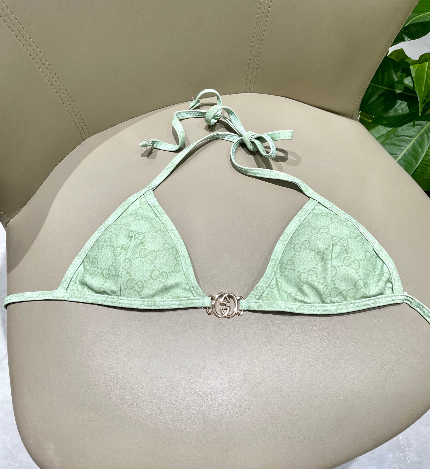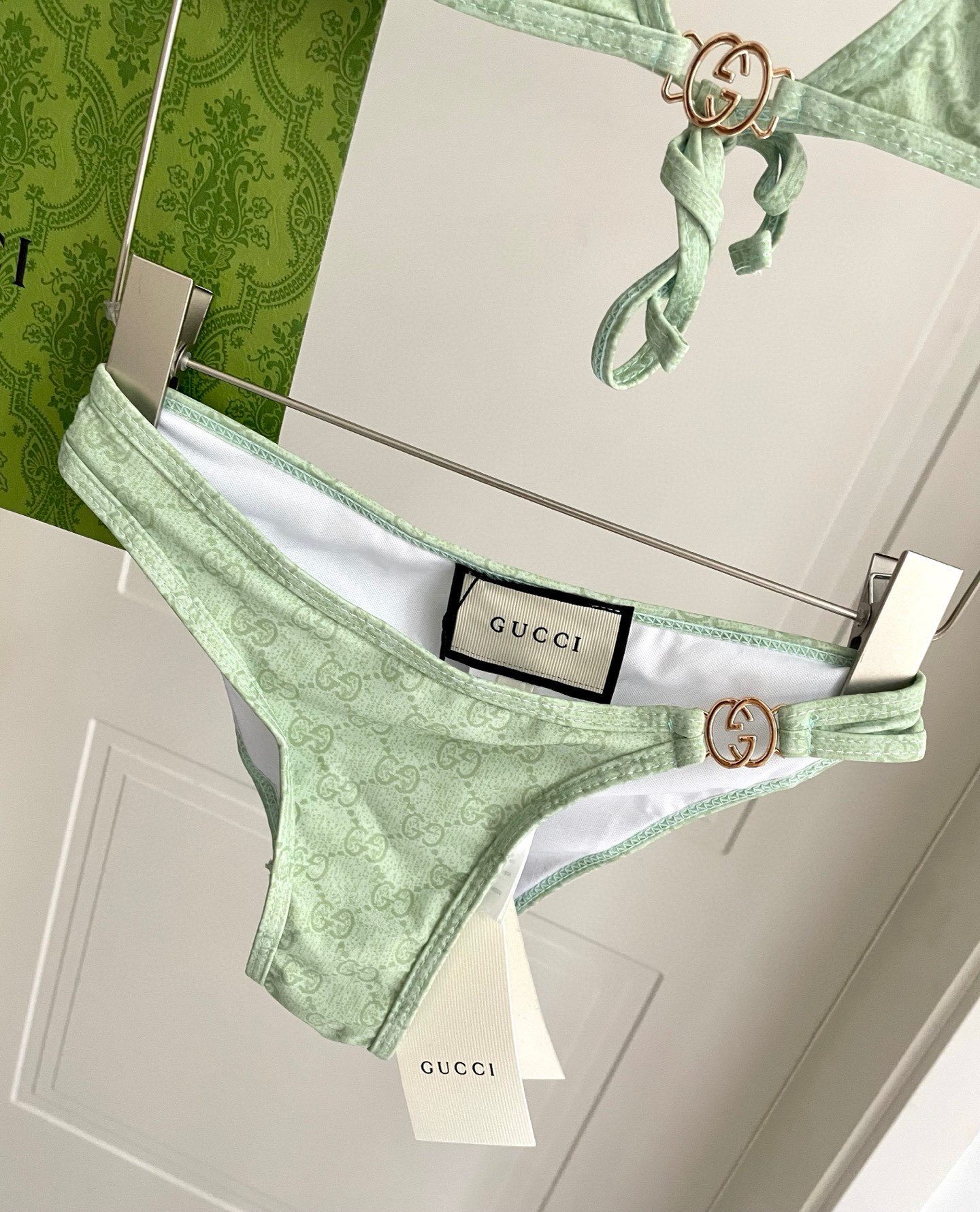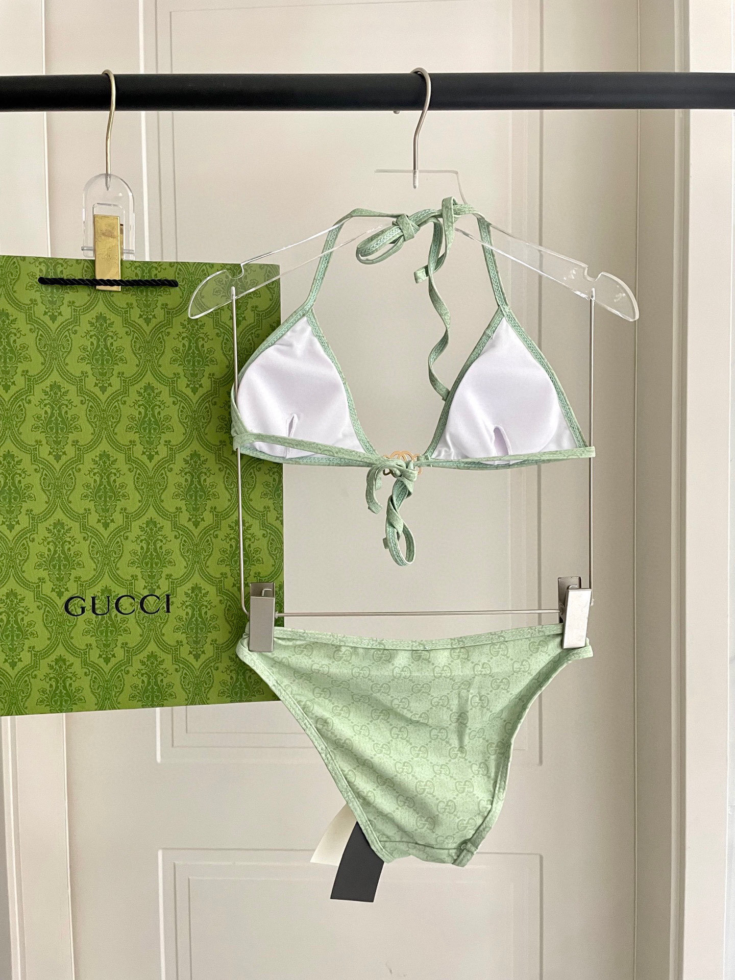 Elevate your swimwear with this luxurious Gucci-inspired bikini. Featuring a refreshing mint green hue and iconic logo pattern, it’s the perfect blend of style and comfort.