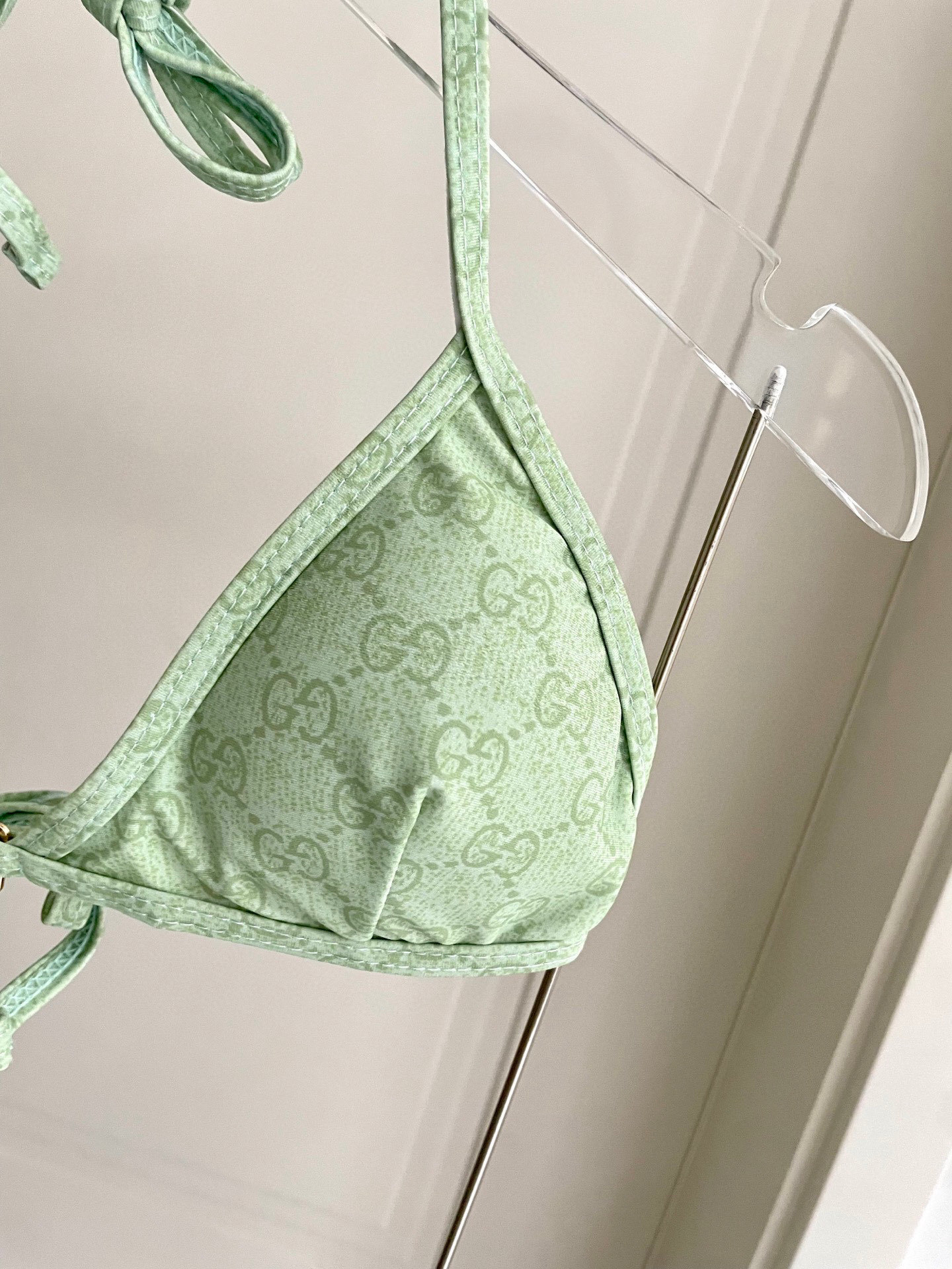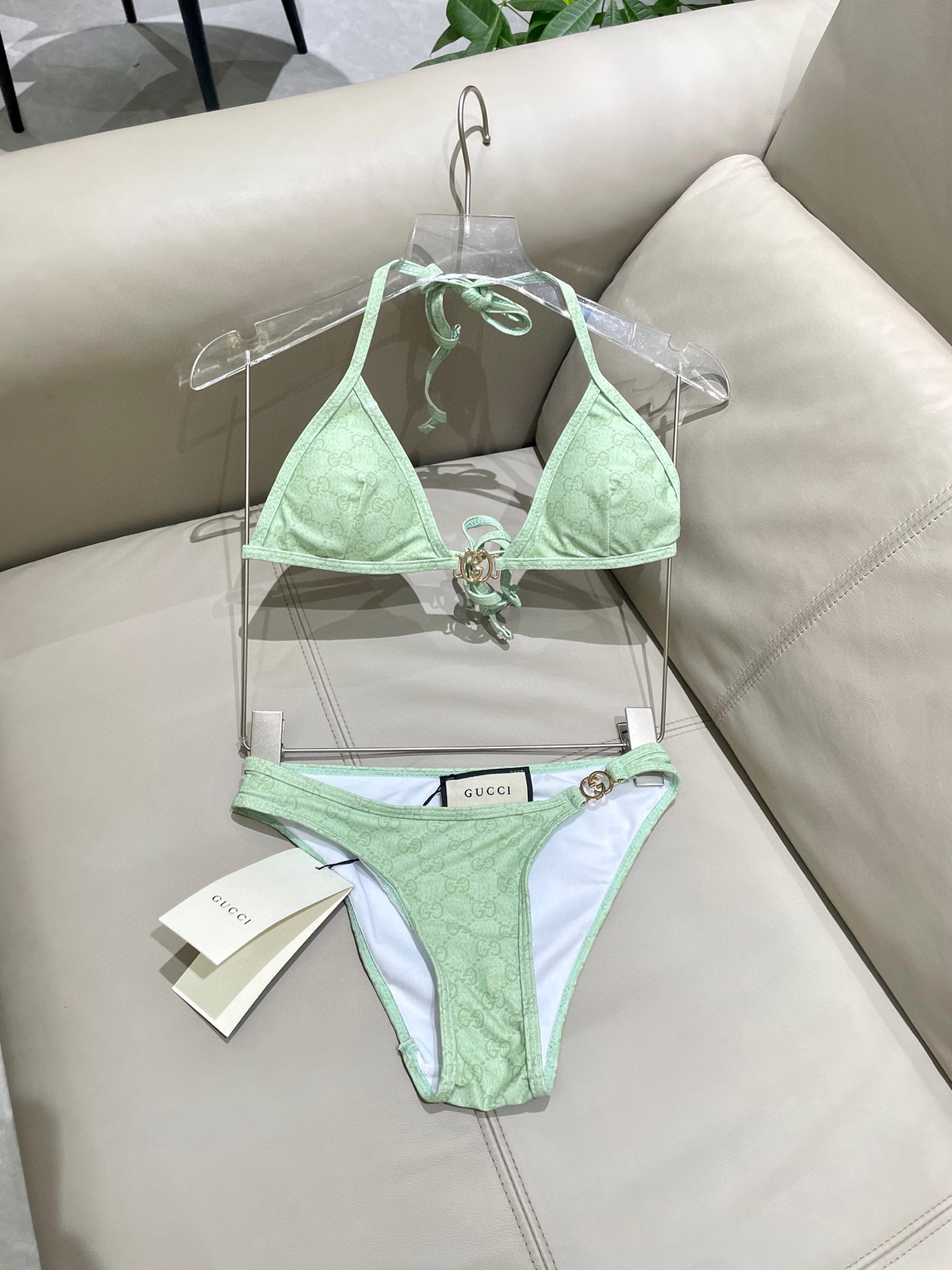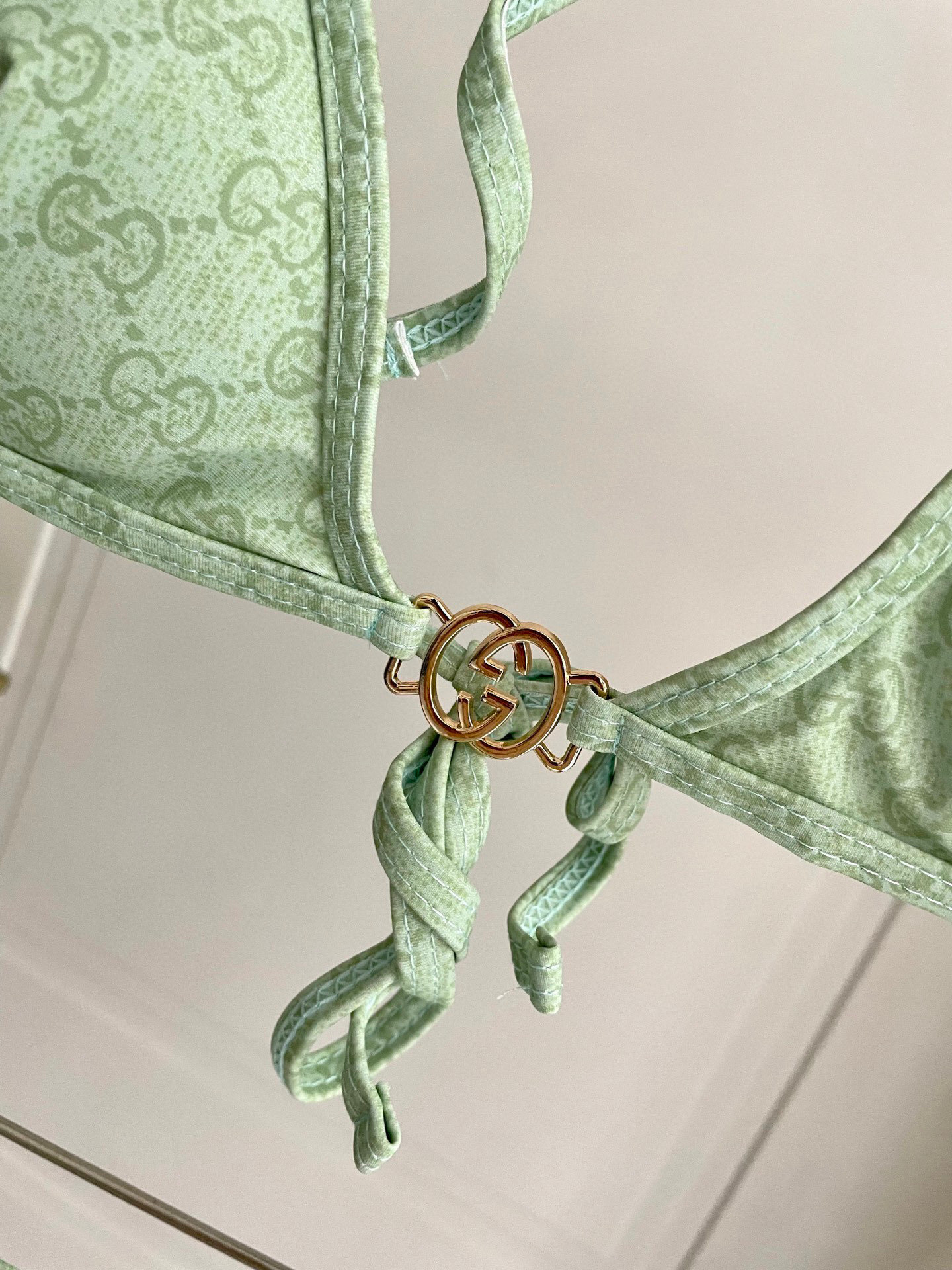 Elevate your swimwear with this luxurious Gucci-inspired bikini. Featuring a refreshing mint green hue and iconic logo pattern, it’s the perfect blend of style and comfort.