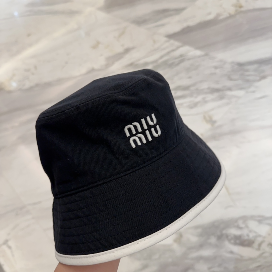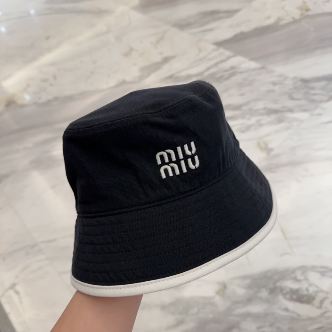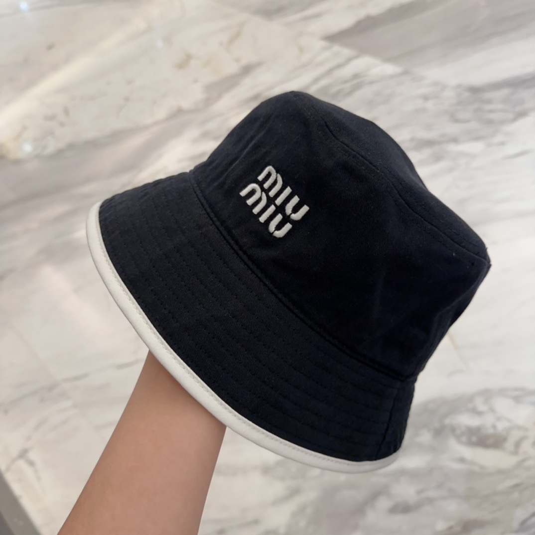 Miu Miu Black Cotton Bucket Hat - White Trim Logo Miu Miu Black Cotton Bucket Hat - White Trim Logo