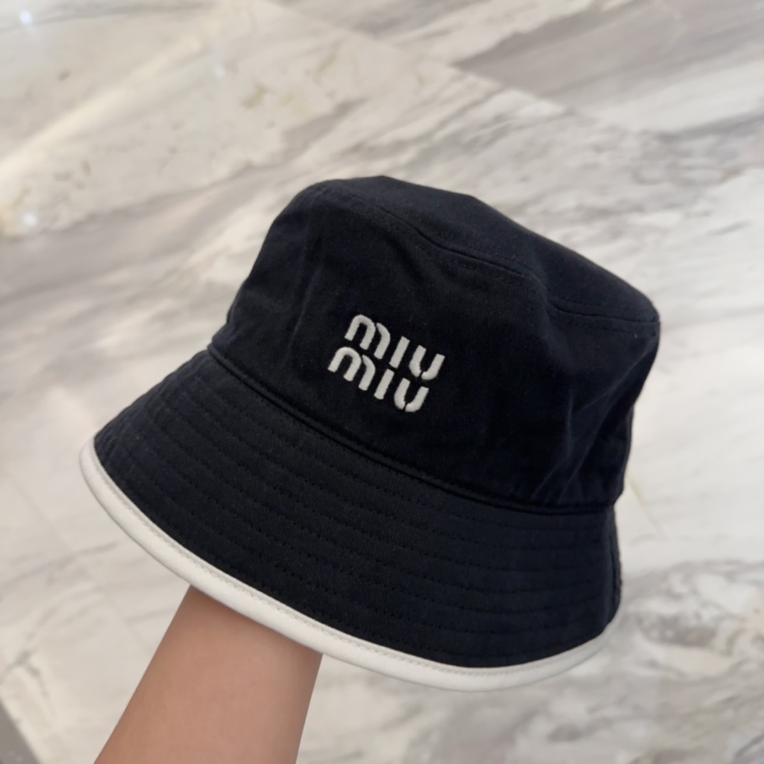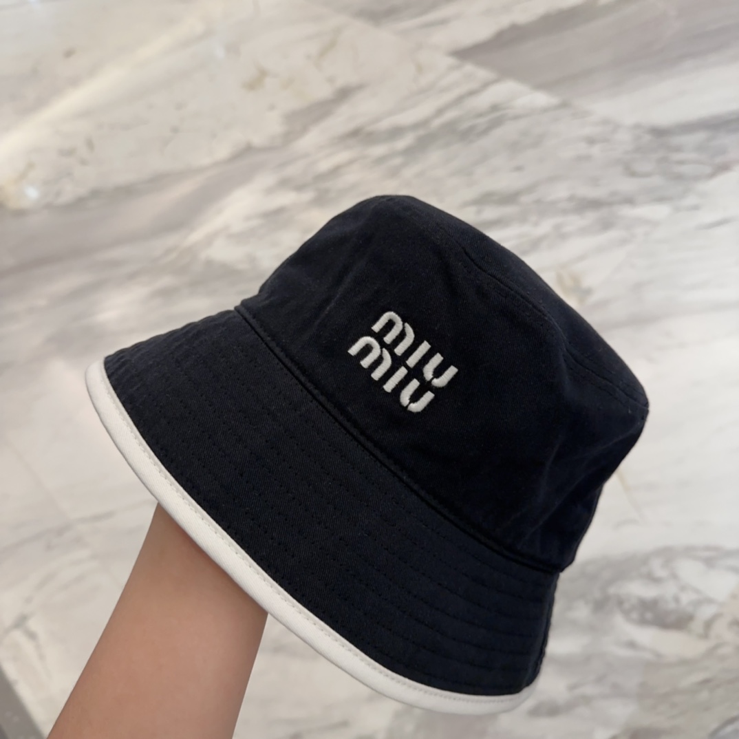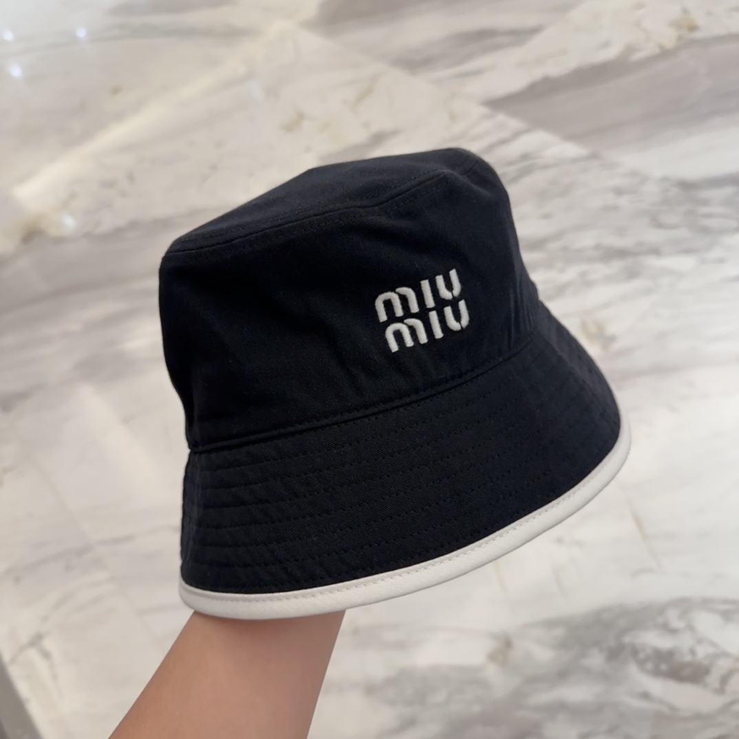 Miu Miu Black Cotton Bucket Hat - White Trim Logo Miu Miu Black Cotton Bucket Hat - White Trim Logo