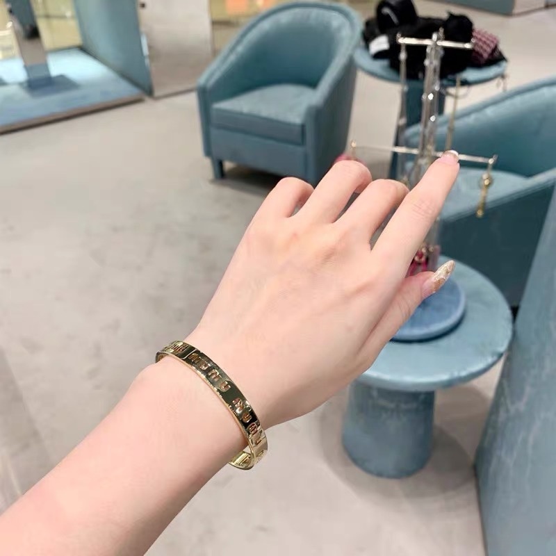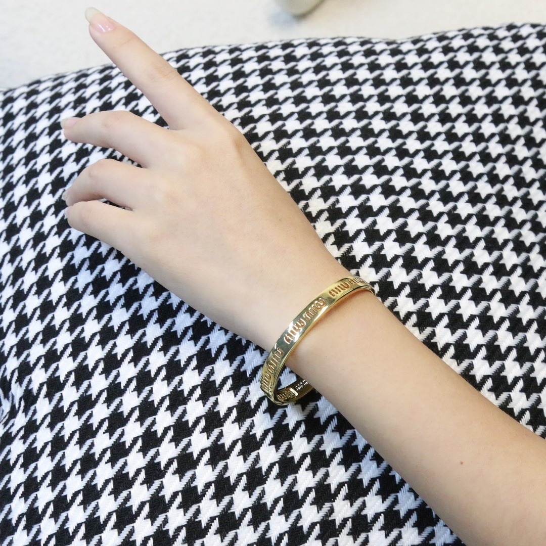 The iconic Miu Miu logo is subtly engraved along the surface of the bracelet, adding a touch of brand recognition without being overwhelming. The logo is a symbol of luxury, quality, and impeccable design, making this bracelet a true statement piece.