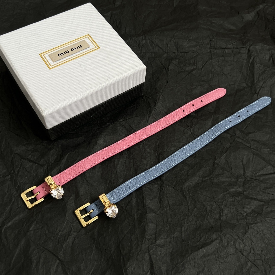 Our Miu Miu inspired bracelet is meticulously crafted from the finest materials to ensure lasting beauty and comfort. The premium leather strap is soft, supple, and available in two stunning colors: a sweet, feminine pink and a chic, sophisticated blue. The gleaming gold-tone buckle and heart charm add a touch of opulence and perfectly complement the leather's rich hue.