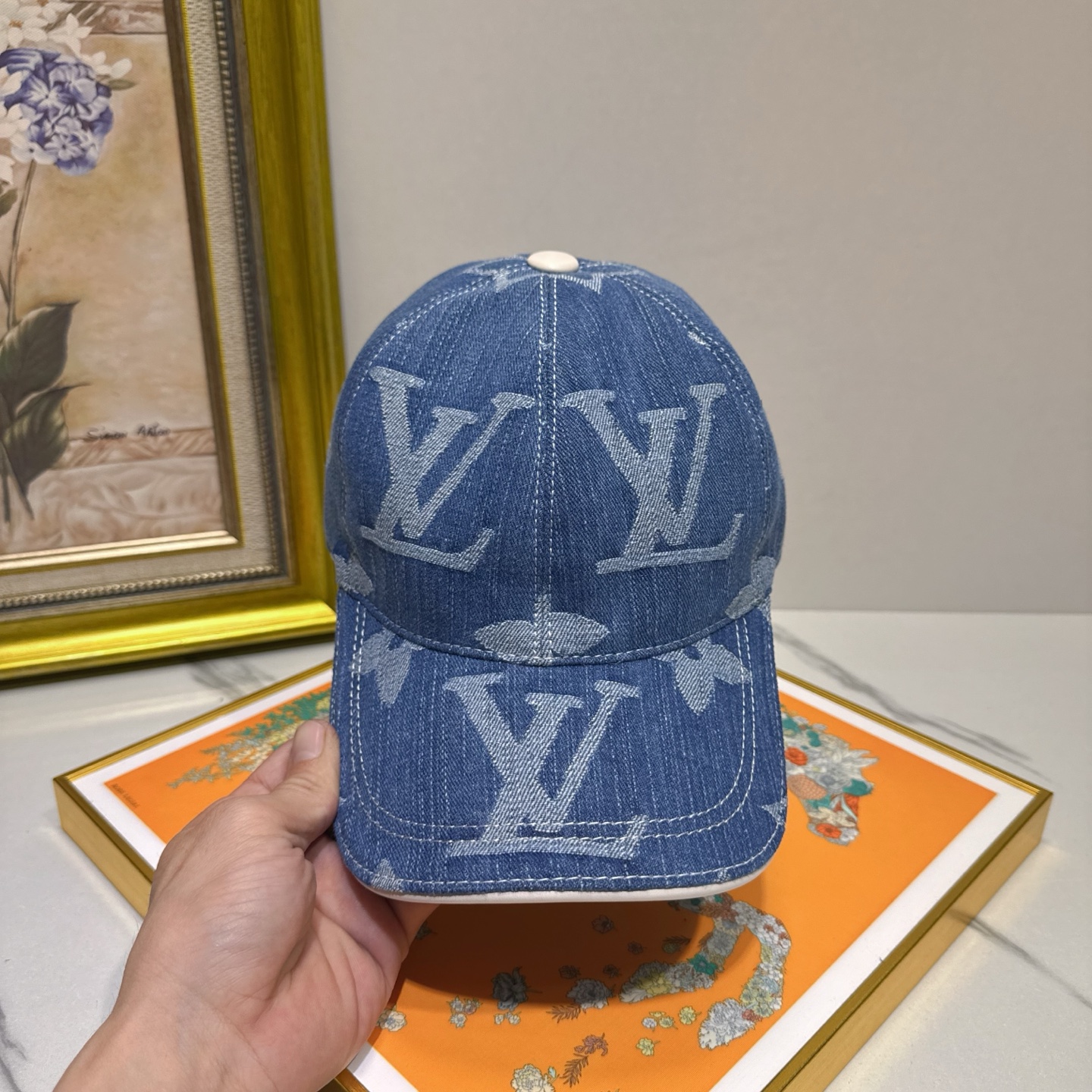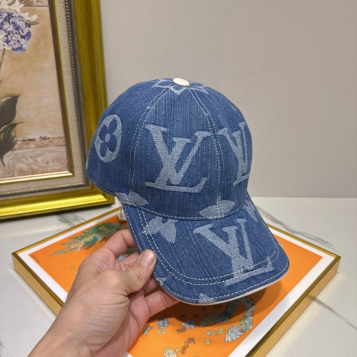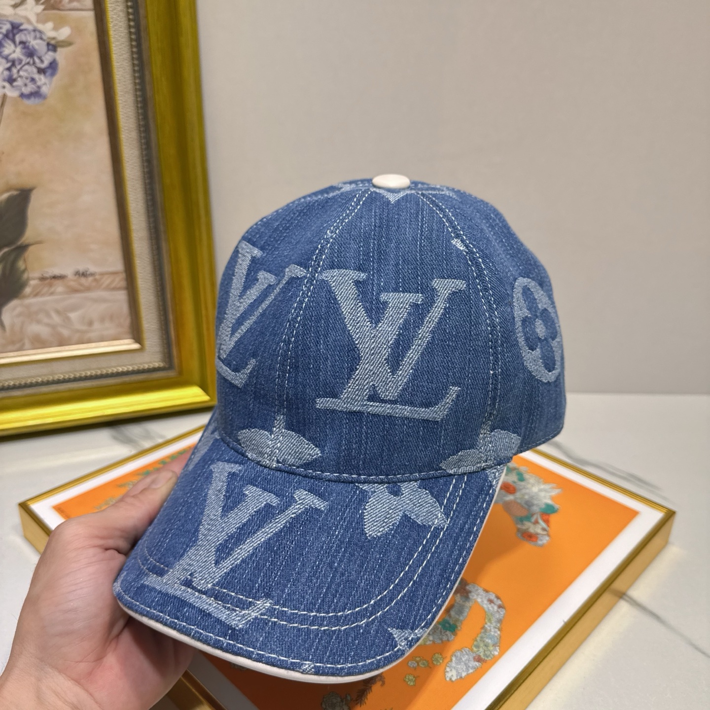 The cap's design incorporates a subtle yet recognizable LV monogram, making it a statement piece without being overly flashy. The denim material gives it a casual, everyday appeal, while the luxurious branding elevates it to a high-fashion accessory. This balance makes it perfect for both casual outings and more styled occasions.