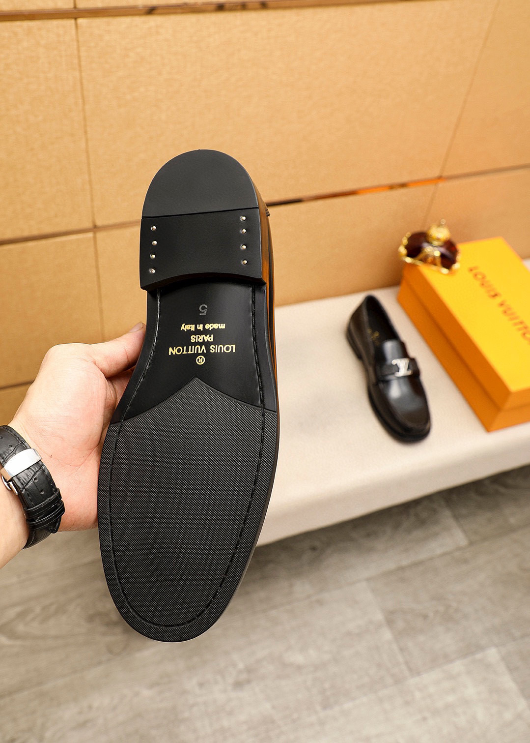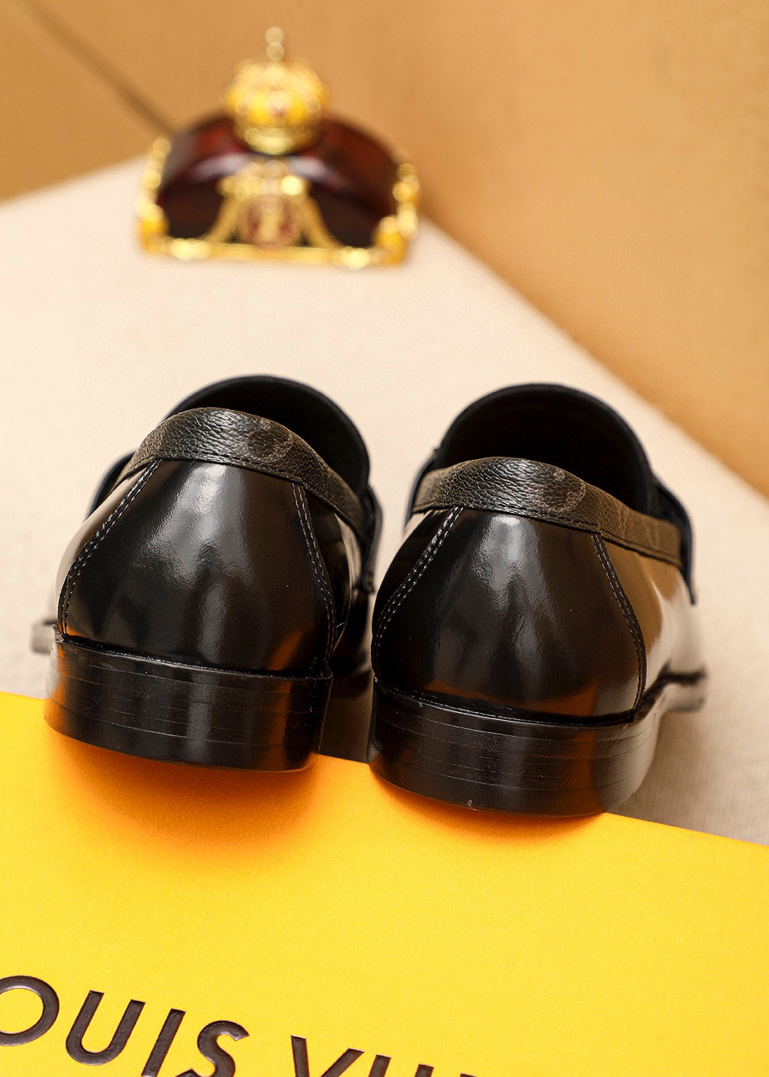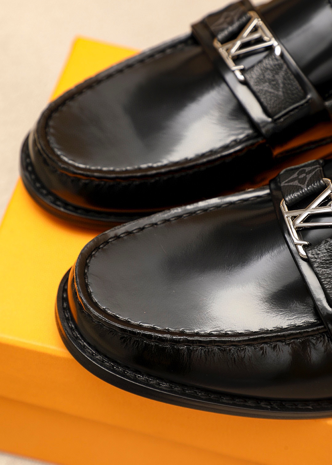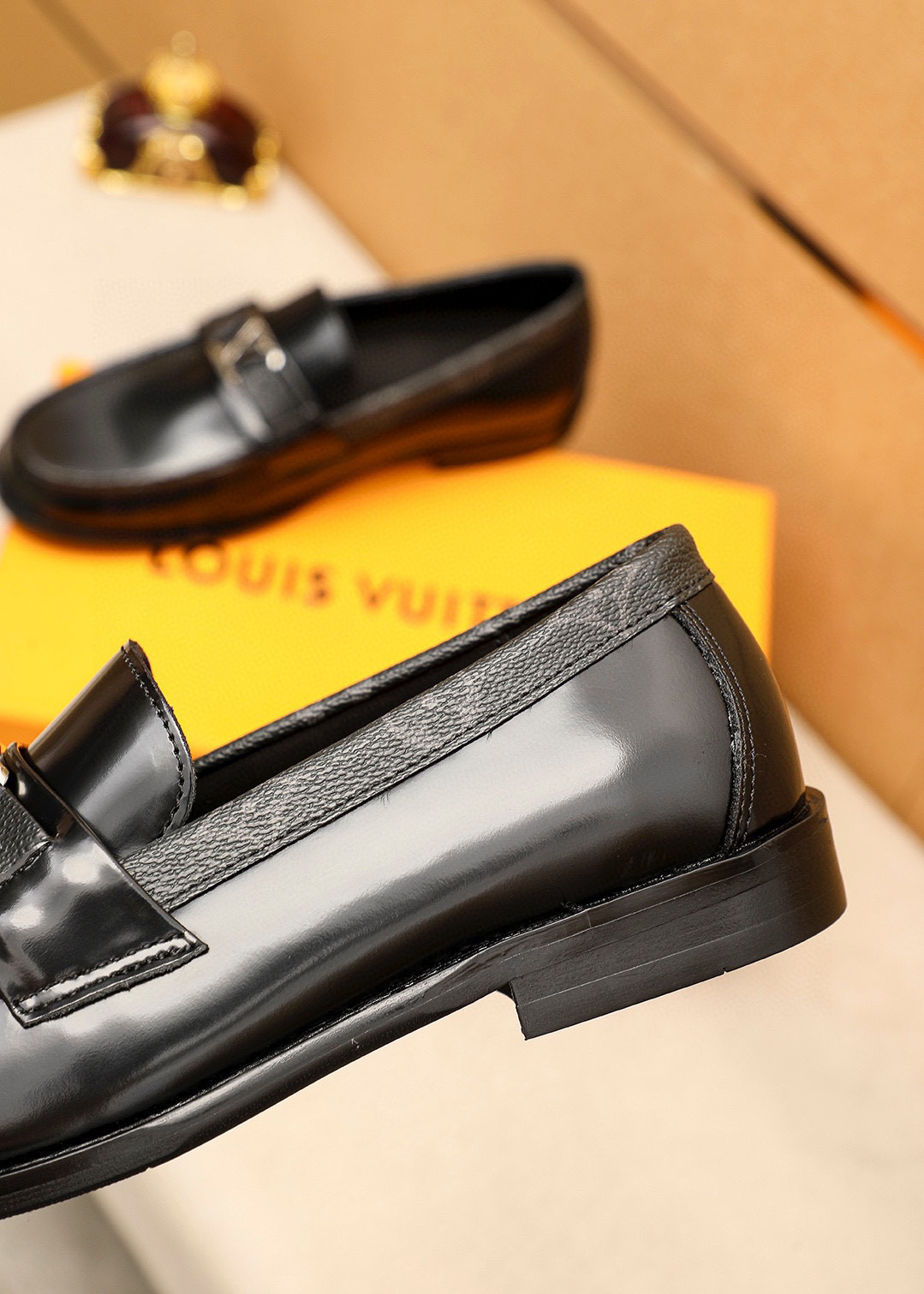 Detailed Features of the LV Black Patent Leather Loafers