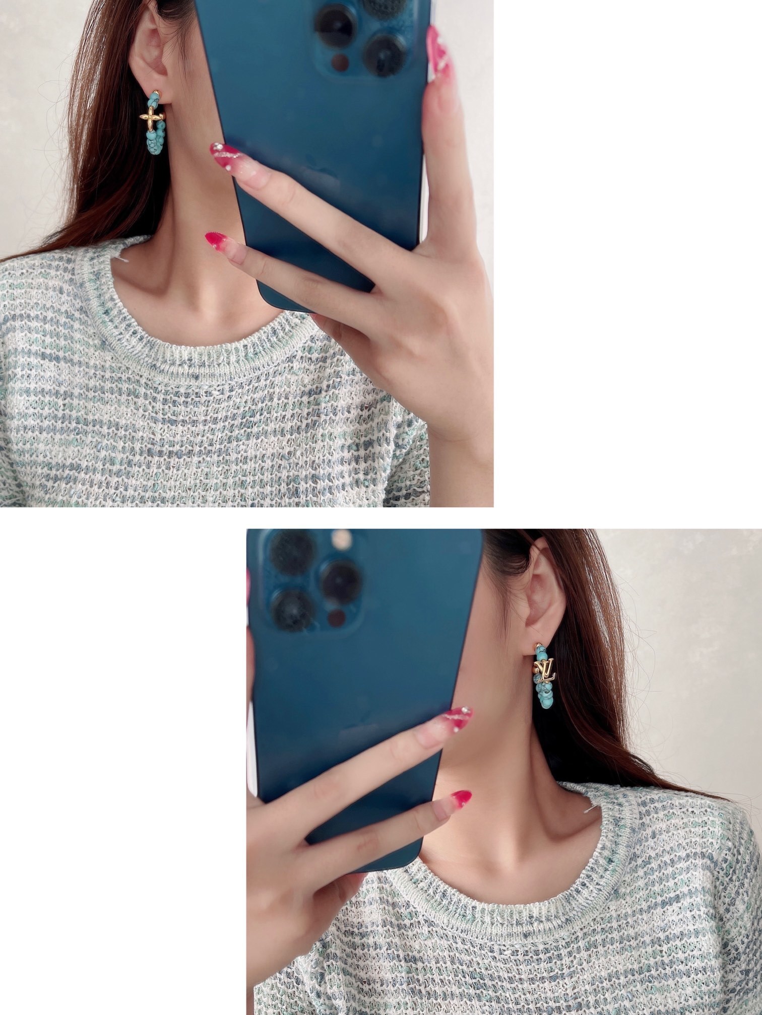 The combination of pearls and turquoise creates a unique and eye-catching look. The gold-tone metal enhances the overall elegance of the earrings, making them a sophisticated accessory for any occasion. The LV emblem adds a subtle yet unmistakable touch of luxury. The turquoise pearls combine well with the gold, making the earrings look very expensive. The gold color is very nice and shiny.