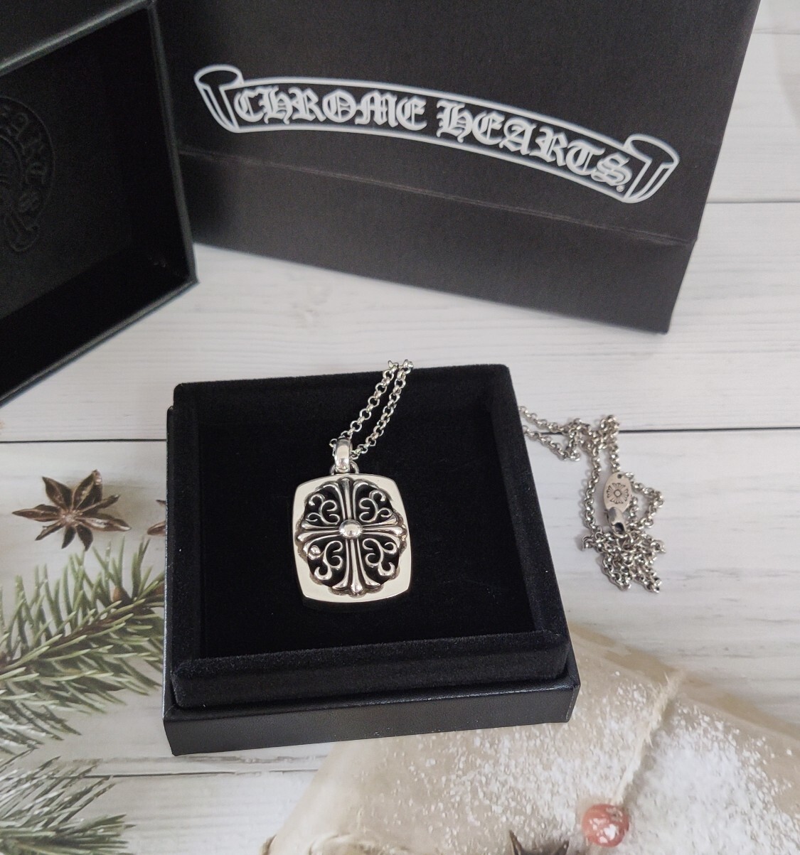 necklace Chrome Hearts Silver Dog Tag - The Chrome Hearts Silver Dog Tag Necklace is a striking piece of jewelry that seamlessly blends edgy style with timeless elegance. This necklace features a meticulously crafted silver dog tag pendant adorned with an intricate cross design, making it a standout accessory for those who appreciate unique and bold fashion statements. The pendant hangs gracefully from a durable and stylish silver chain, ensuring both comfort and longevity. Whether you're looking to elevate your everyday look or add a touch of sophistication to a special occasion outfit, this necklace is the perfect choice. The Chrome Hearts Silver Dog Tag Necklace embodies the brand's commitment to quality craftsmanship and distinctive design, making it a must-have addition to any jewelry collection.